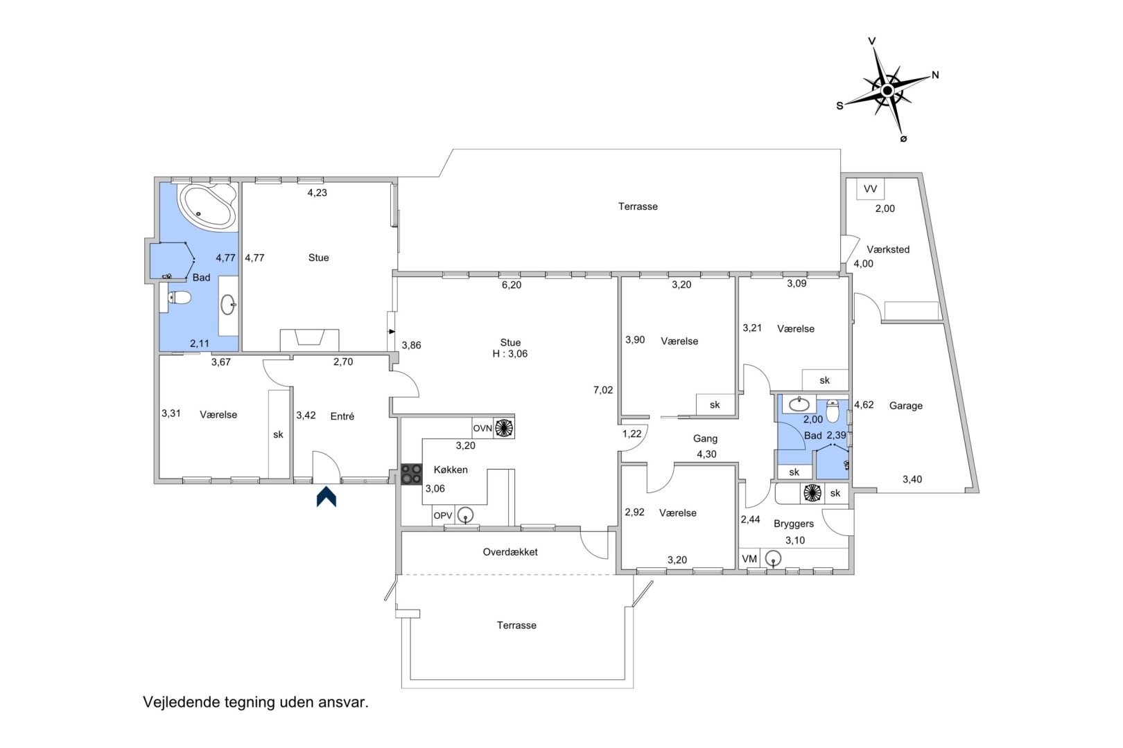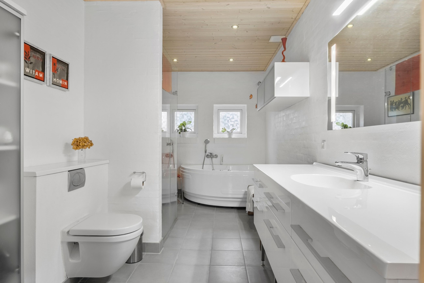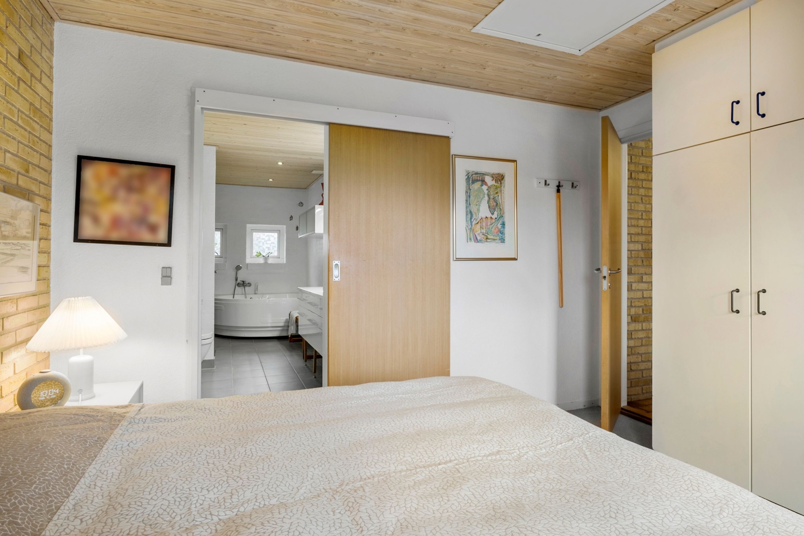 Villaen byder desuden på en stor entre med klinkegulv og gulvvarme samt loft til kip, som giver en imponerende velkomst. Soveværelset er rummeligt og har skabe samt direkte adgang til et stort og lækkert badeværelse med væghængt toilet, spabad, klinkegulv med el-gulvvarme og en bruseniche med glaslåger.