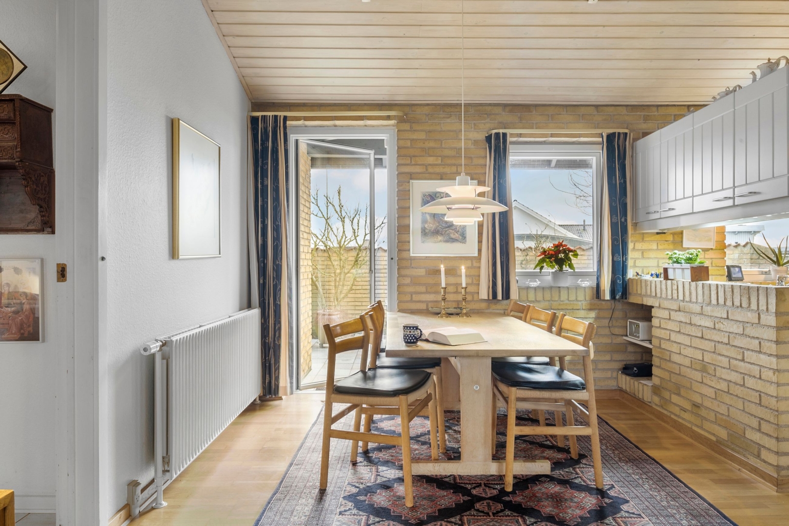 Indretningen rummer et praktisk bryggers med bord og vask. Der er tre børneværelser, alle med faste skabe, samt et badeværelse med bruseniche, klinkegulv og el-gulvvarme. Fra fordelingsgangen er der adgang til et køkkenalrum, der er i delvis åben forbindelse med opholdsstuen, hvor der er trægulv og loft til kip. Fra alrummet er der udgang til en østvendt morgenterrasse, som delvis er overdækket og er afskærmet af en terrassemur og giver en privat og hyggelig atmosfære, perfekt sted til at nyde morgenkaffen.