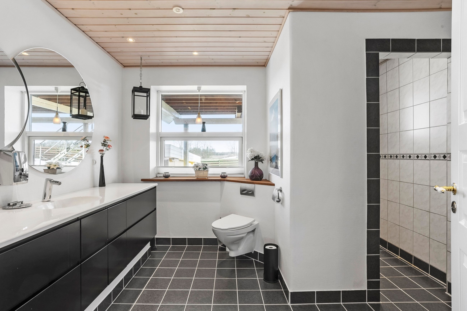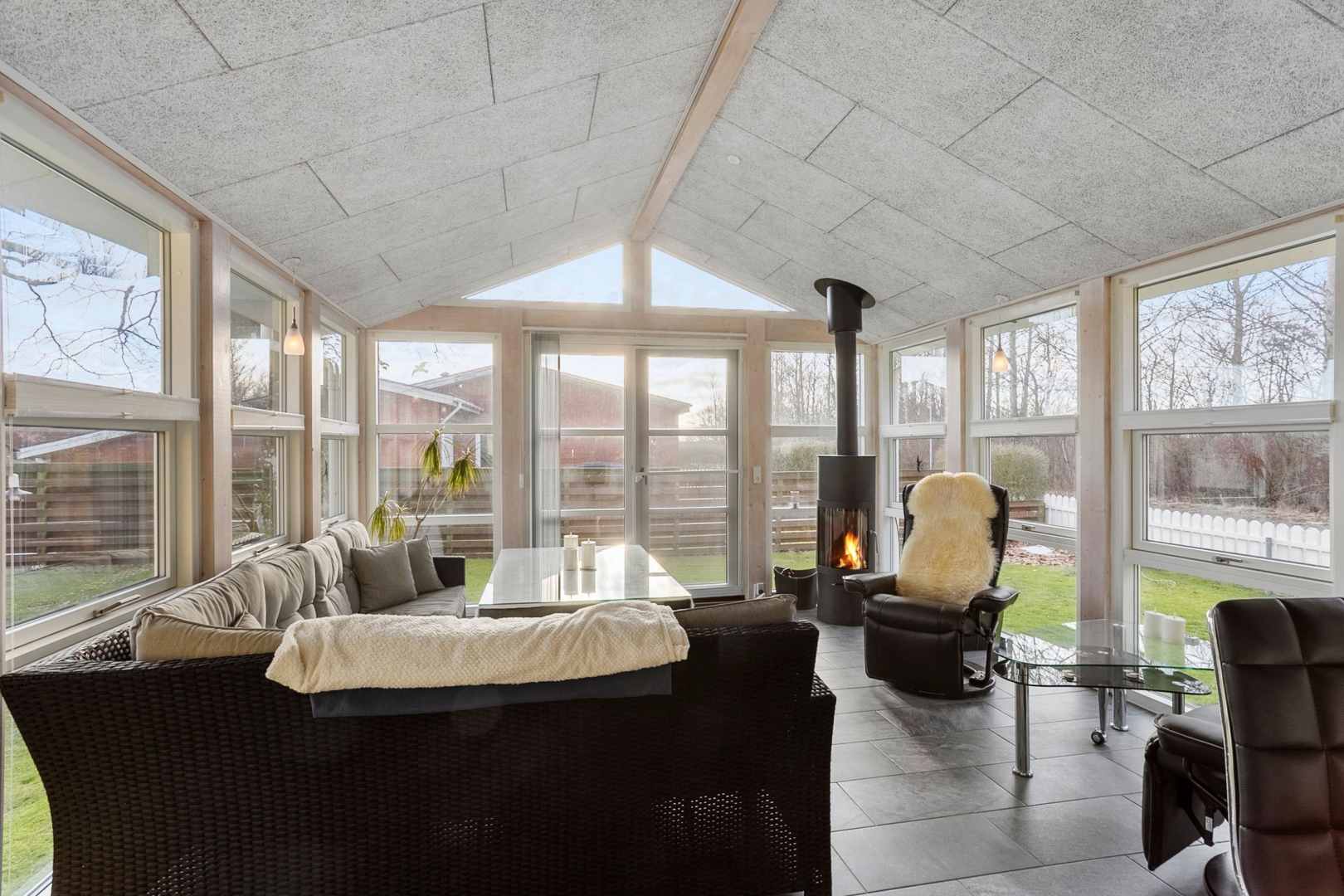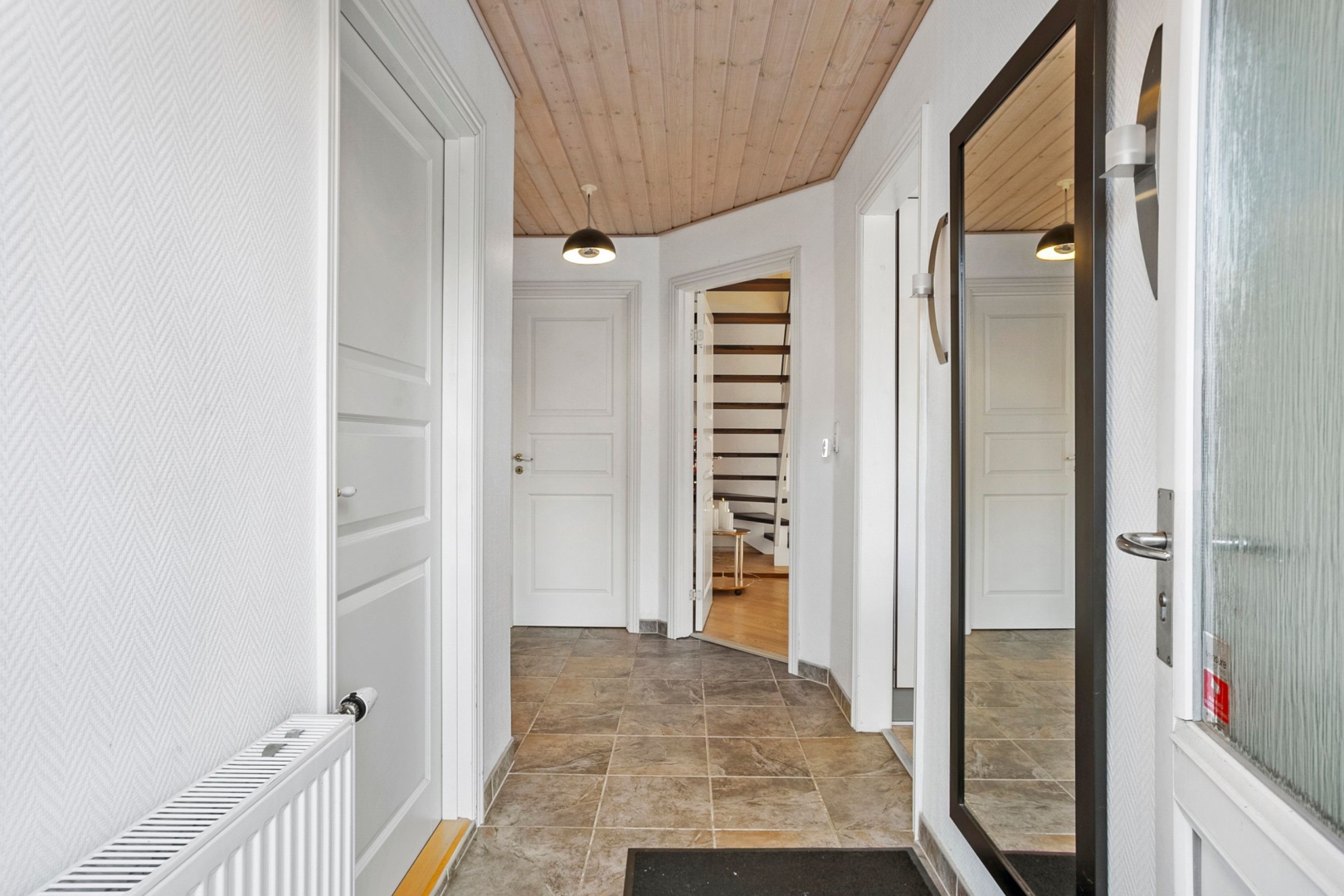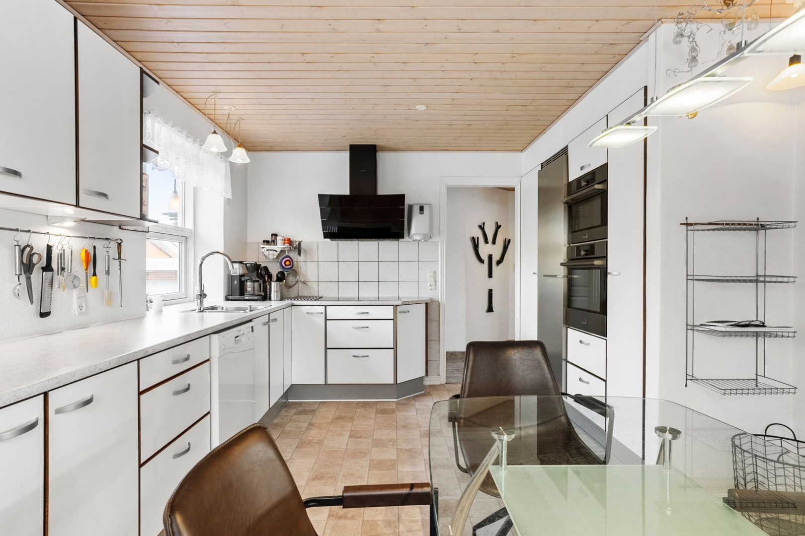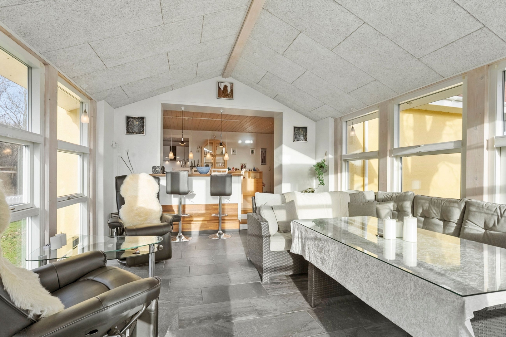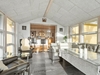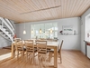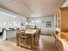 Villaen rummer et indbydende køkken med spiseplads og god skabs- og bordplads. Fra spisestuen er der to trin ned til den hyggelige udestue samt trappe til 1. sal. Udestuen fremstår som et særligt opholdsrum med klinkegulv med gulvvarme, loft til kip, brændeovn og et skønt lysindfald fra de store vinduespartier. I stueplan findes desuden et rummeligt badeværelse med gulvvarme, væghængt toilet og stor bruseniche samt en entré.