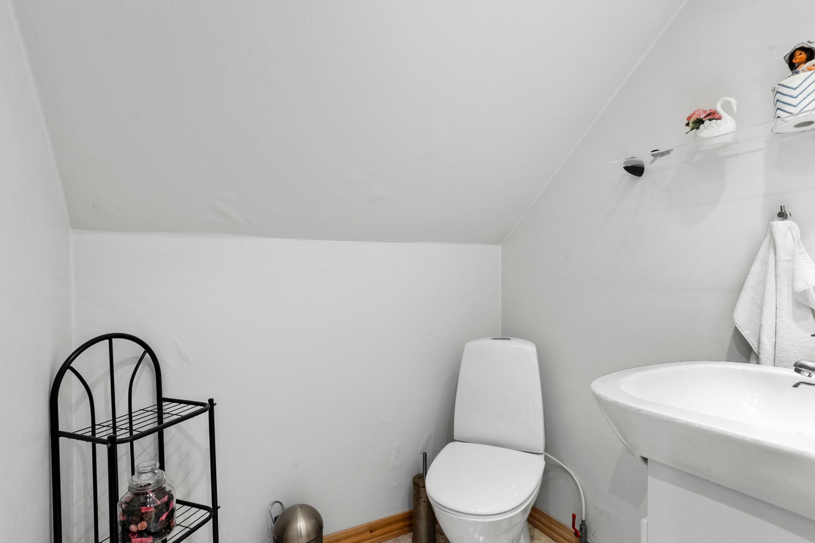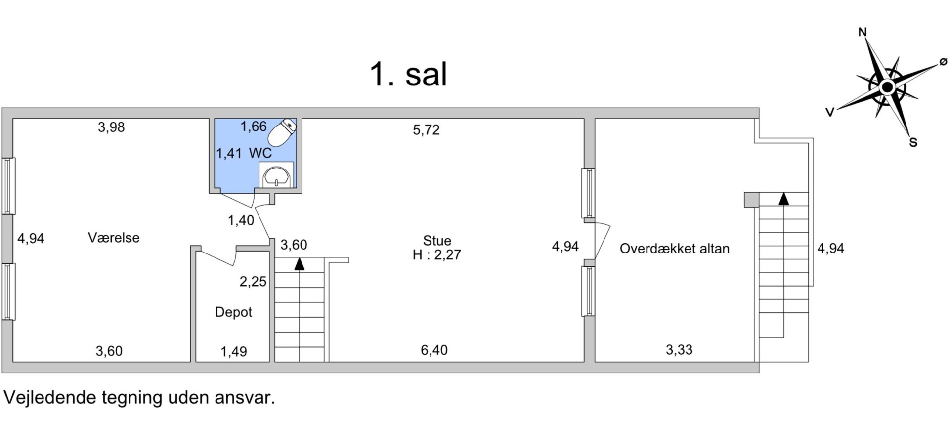 På 1. sal finder du et børneværelse samt et soveværelse, der også kan anvendes som udsigtsstue, med direkte udgang til den store overdækkede altan. Herfra er der en vidunderlig naturudsigt og via en ståltrappe adgang til haven. Et toilet med koldt vand samt et praktisk opbevaringsrum fuldender etagen.