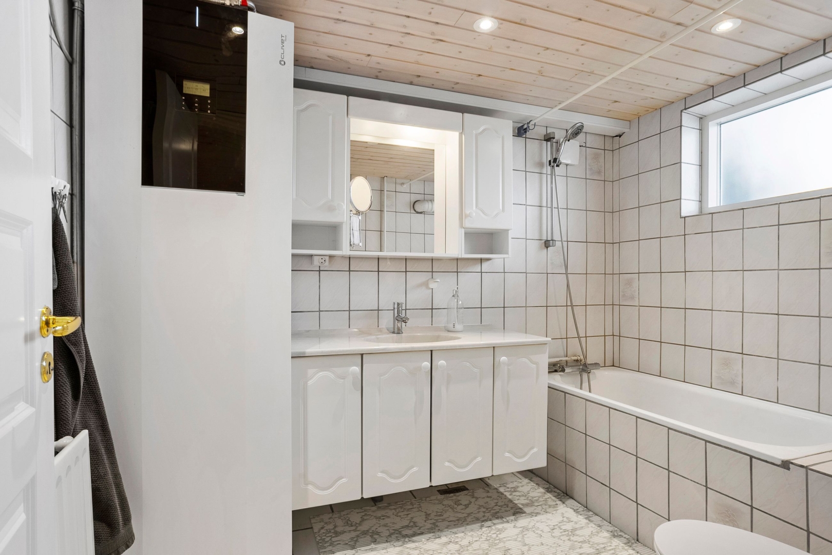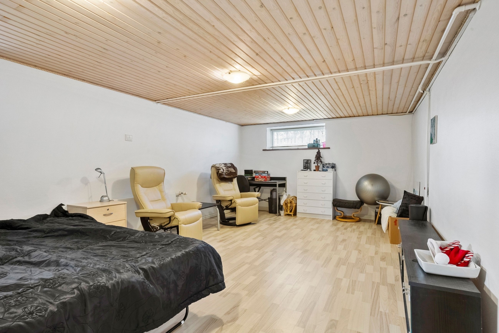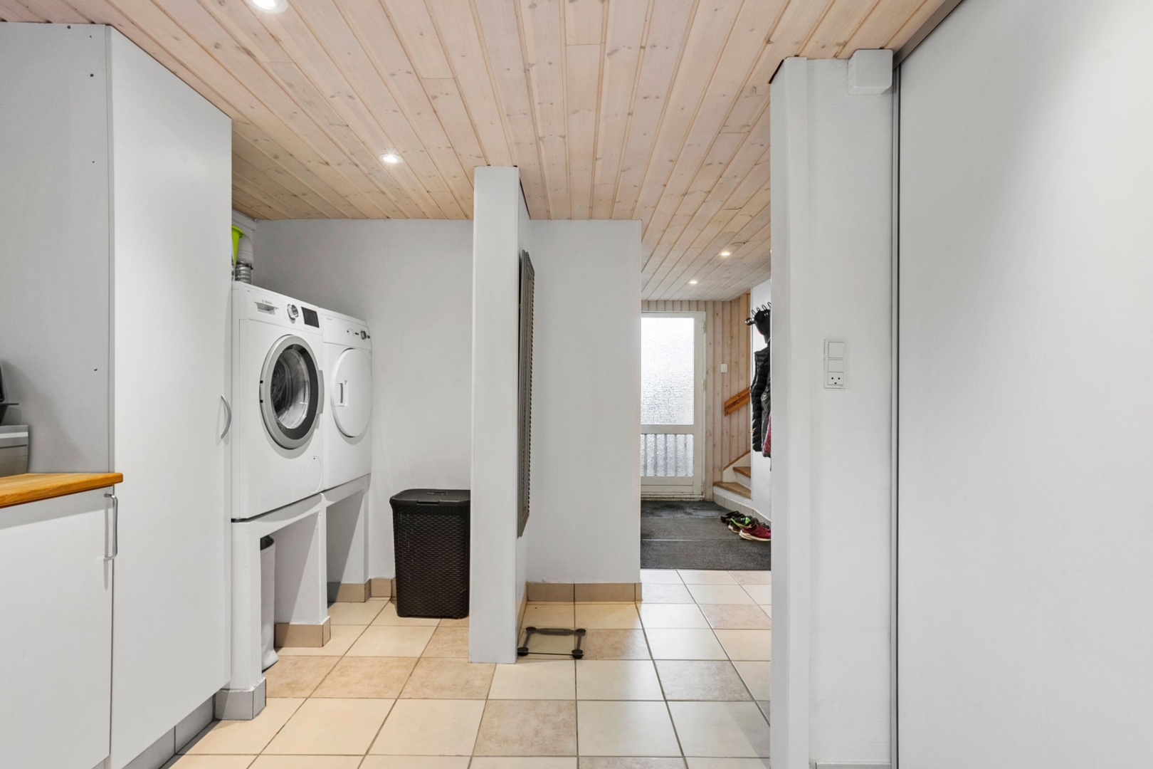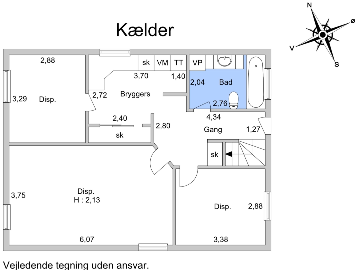 Kælderen indeholder et funktionelt bryggers med klinkegulv og plads til vaskefaciliteter, et badeværelse med badekar, tre disponible rum samt en gang med trappe til stueplan og direkte udgang til haven.