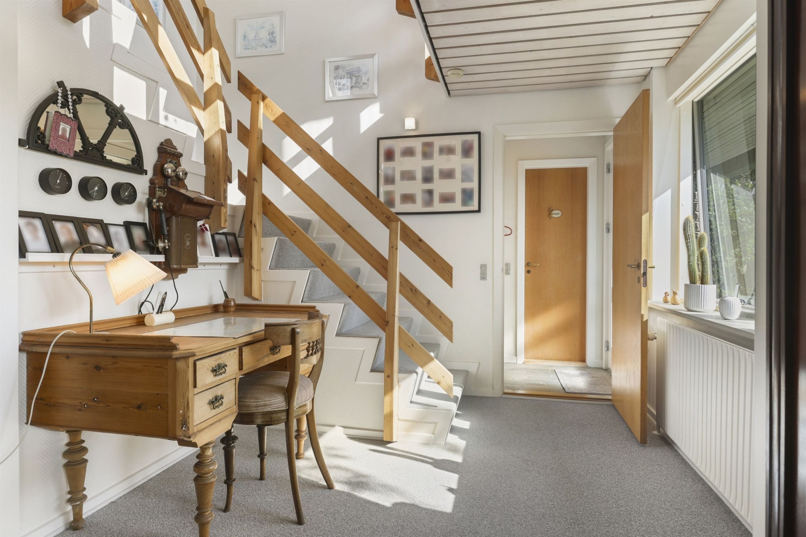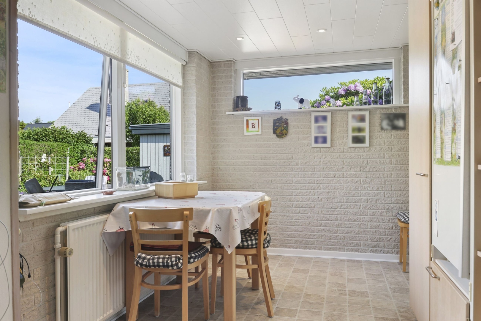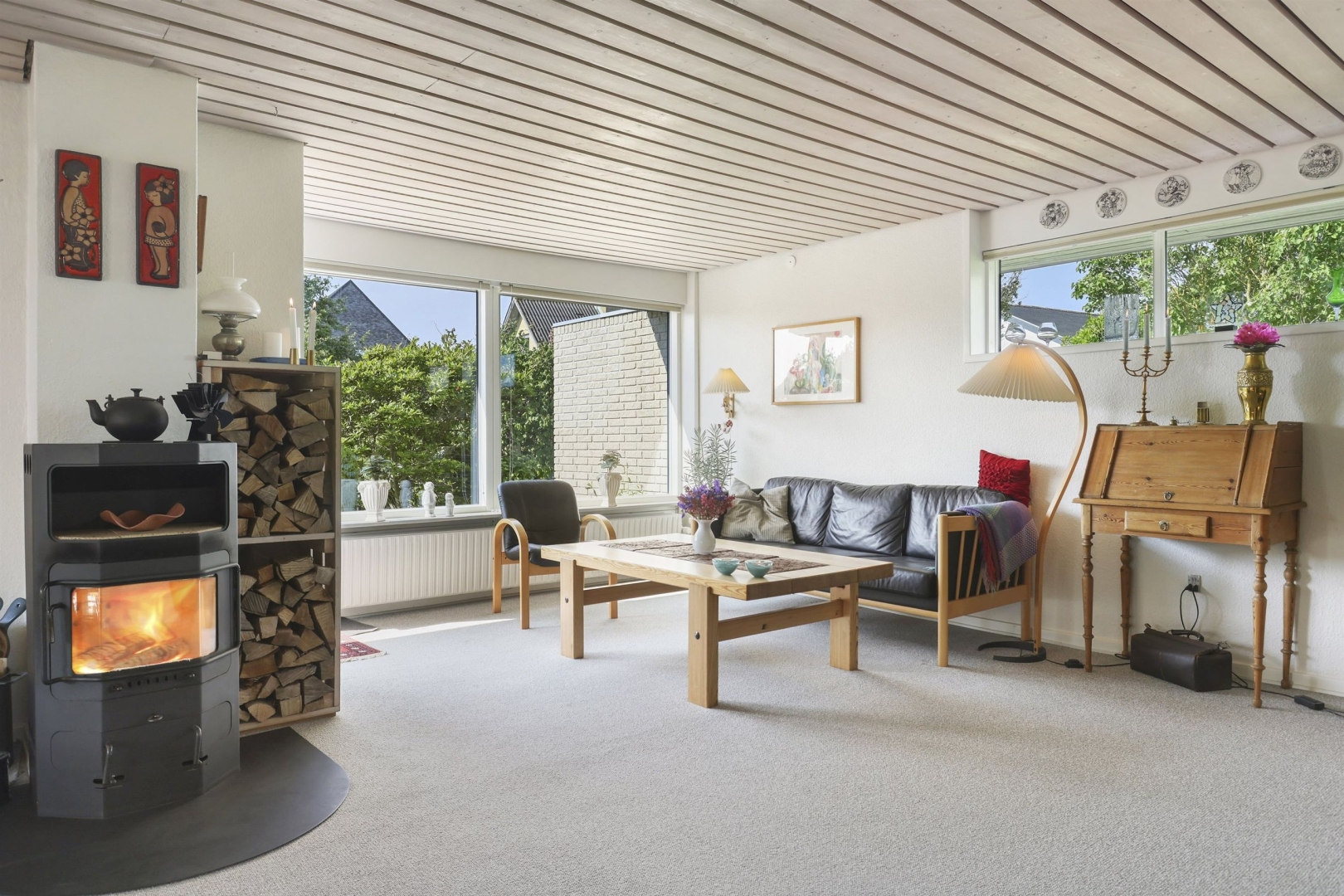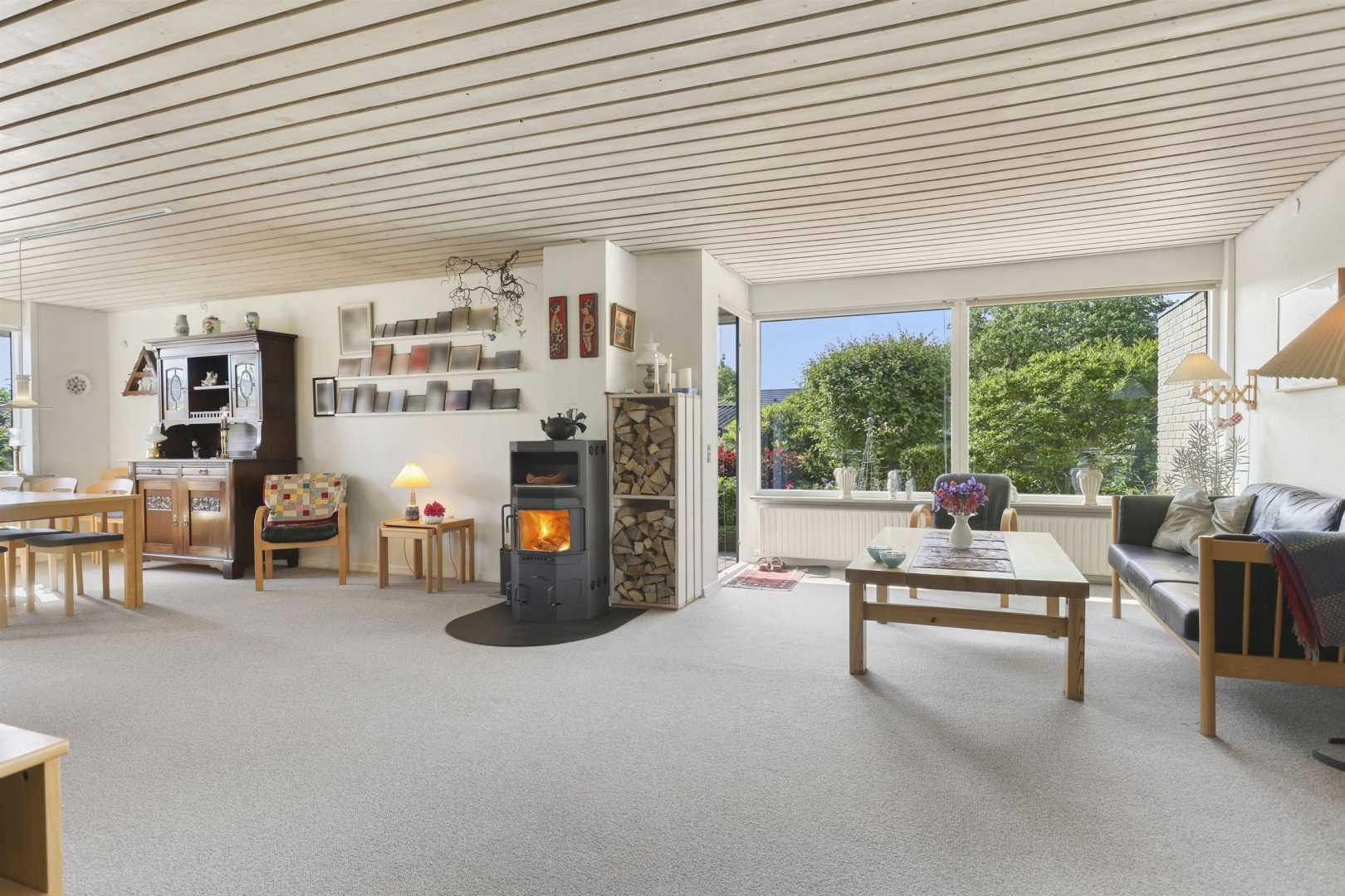 Indretningen byder i stueplan på et godt bryggers med vask og plads til vaskemaskine, et nydeligt og funktionelt køkken med rigelig spiseplads samt et praktisk viktualierum. Opholds- og spisestuen har et dejligt lysindfald fra de mange vinduespartier, og her finder I også en brændeovn (skal skiftes) samt udgang til en sydvendt, delvist overdækket og flisebelagt terrasse. Terrassen ligger ugeneret og giver mulighed for at nyde haven eller samle familie og venner til hyggelige grillmiddage. Fra spisestuen fører en brugervenlig trappe til overetagen.##Stueplan rummer desuden en entré samt et moderniseret gæstetoilet med direkte adgang til en stor sauna.