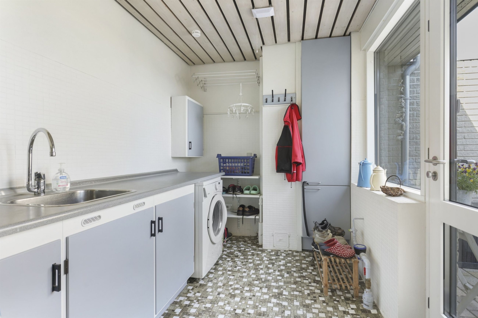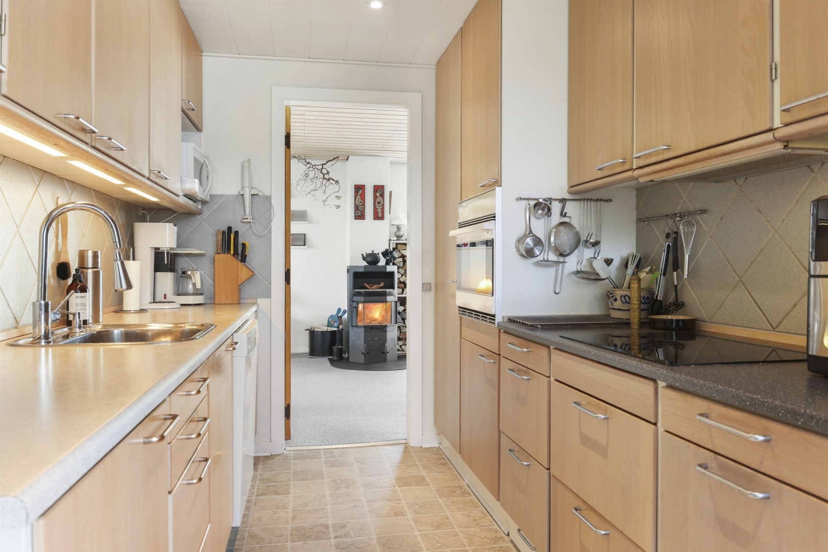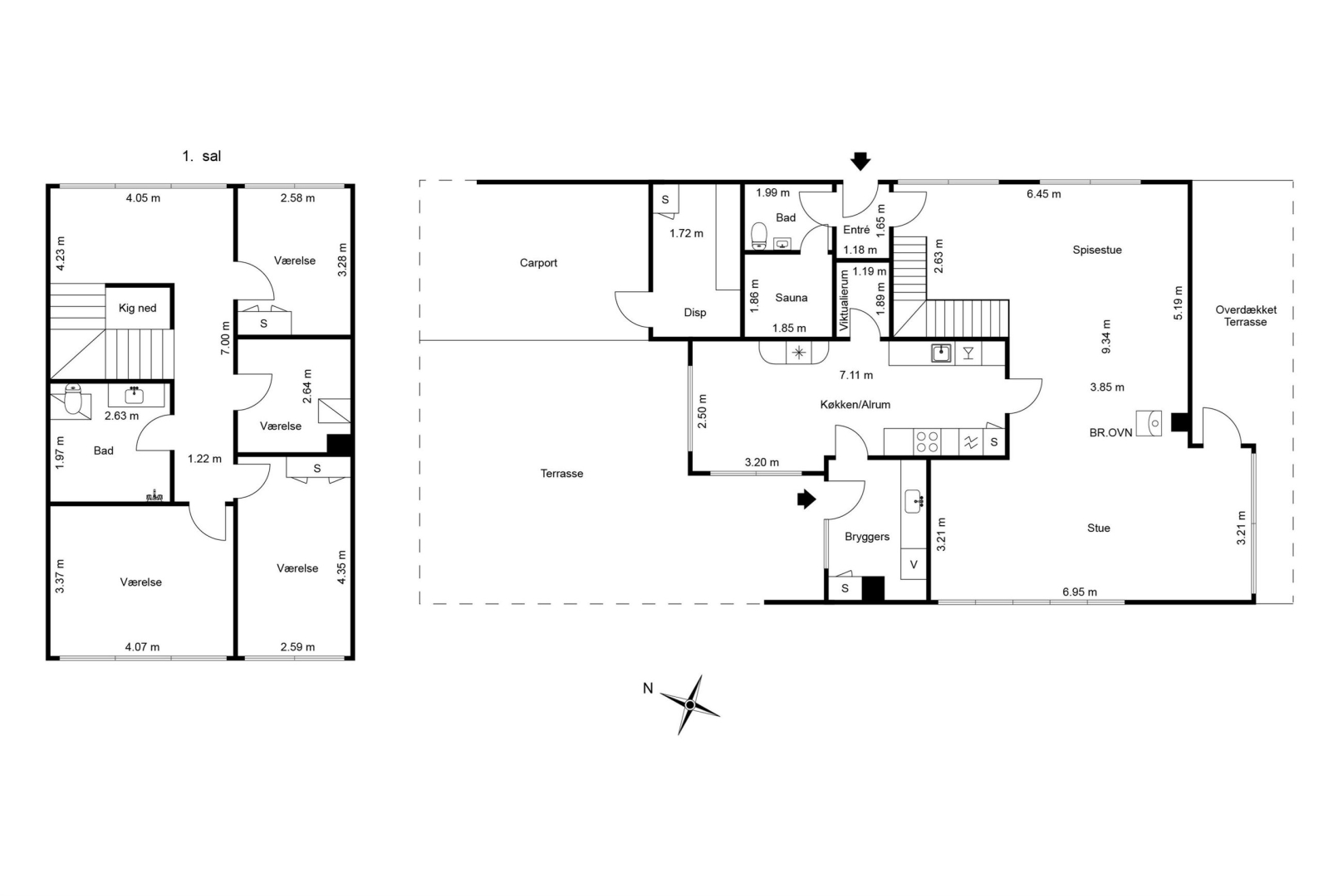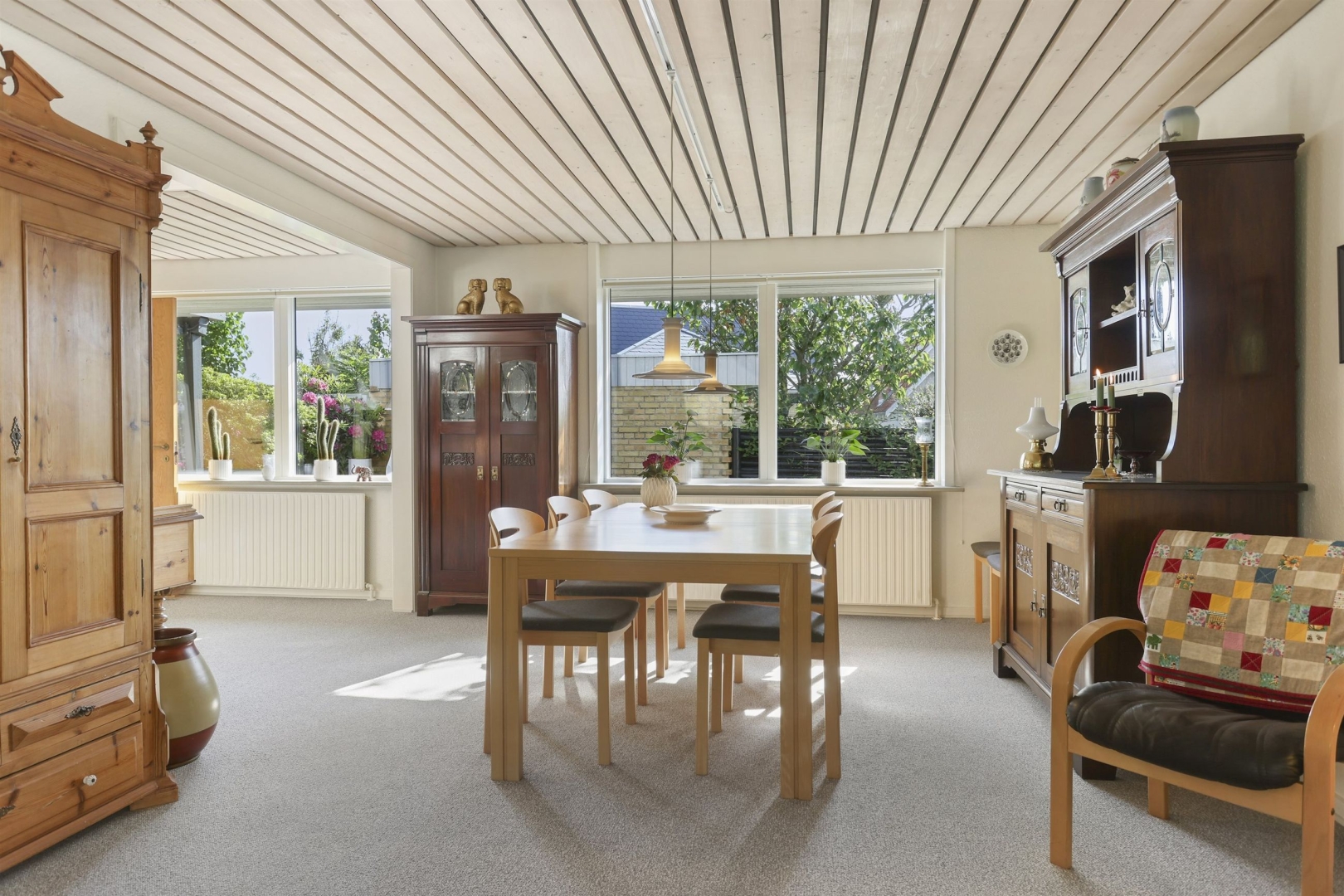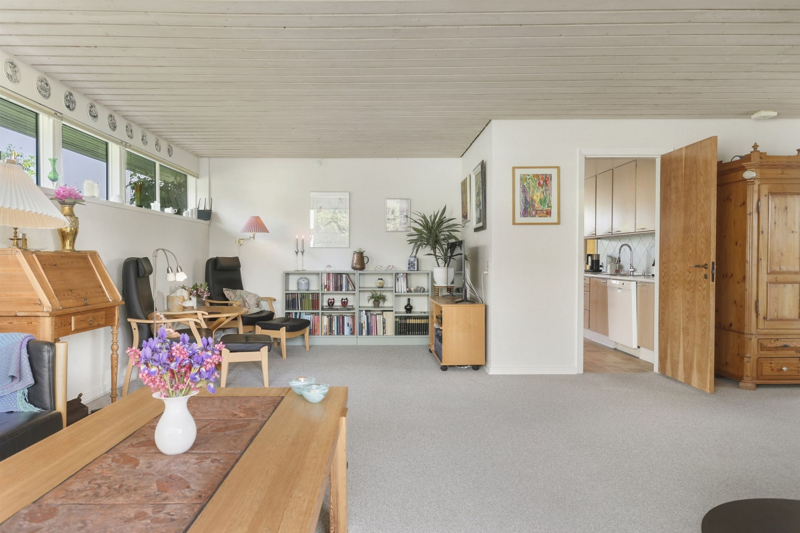 Indretningen byder i stueplan på et godt bryggers med vask og plads til vaskemaskine, et nydeligt og funktionelt køkken med rigelig spiseplads samt et praktisk viktualierum. Opholds- og spisestuen har et dejligt lysindfald fra de mange vinduespartier, og her finder I også en brændeovn (skal skiftes) samt udgang til en sydvendt, delvist overdækket og flisebelagt terrasse. Terrassen ligger ugeneret og giver mulighed for at nyde haven eller samle familie og venner til hyggelige grillmiddage. Fra spisestuen fører en brugervenlig trappe til overetagen.##Stueplan rummer desuden en entré samt et moderniseret gæstetoilet med direkte adgang til en stor sauna.