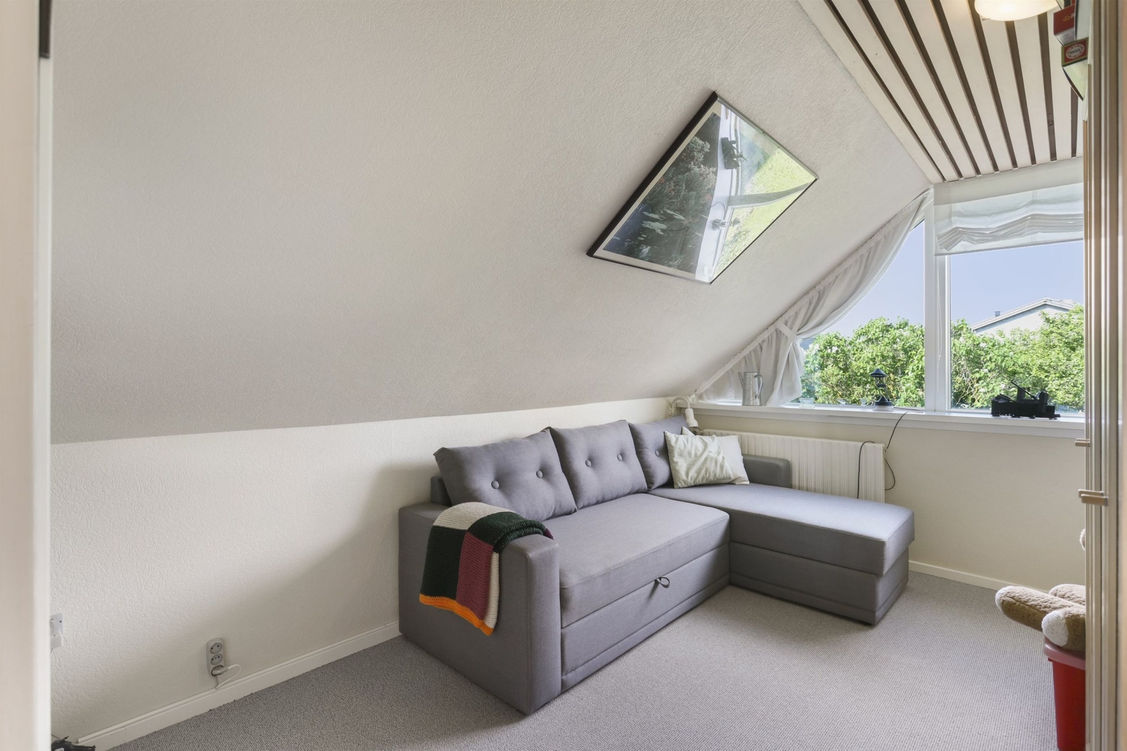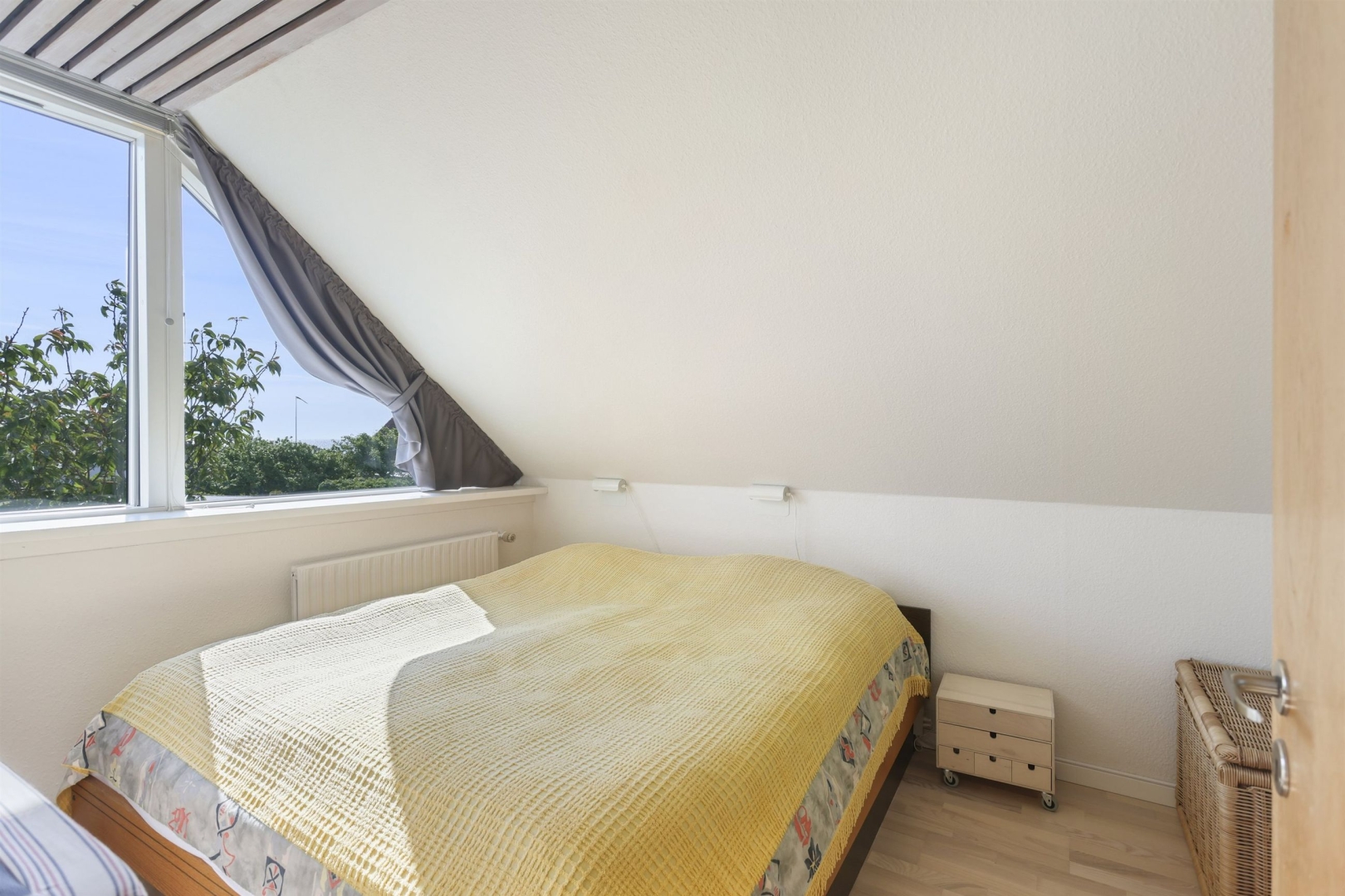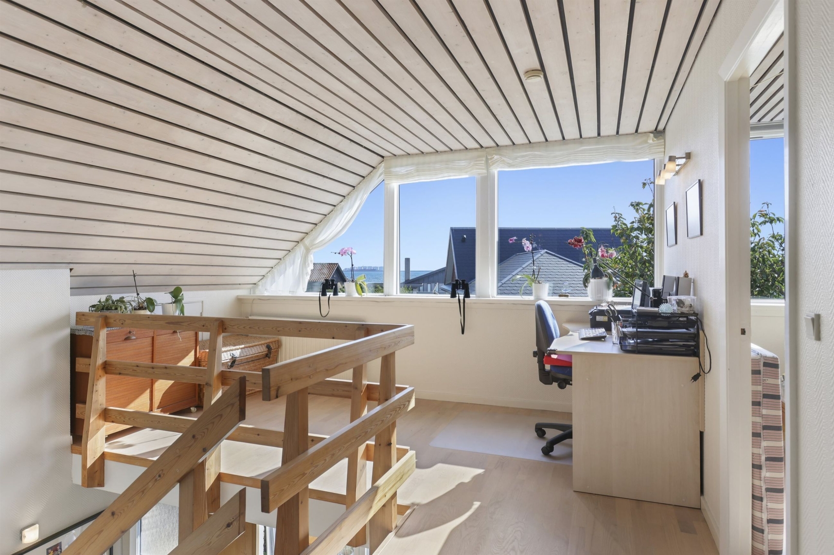 På første sal finder I en lys balkonstue, der kan bruges som arbejdsplads eller legerum, og fra det brede vinduesparti kan I nyde udsigten til vandet og de smukke solopgange. Der er to børneværelser med skabe og gavlvinduer, et soveværelse med indbyggede skabe, et kontor eller mindre værelse med tagvindue samt et stilfuldt badeværelse med klinkegulv, gulvvarme, bruseniche, håndklædetørrer, væghængt toilet og dagslysindfald. En fordelingsgang binder rummene sammen. Vinduespartier i galv mod vest er med solfilter.