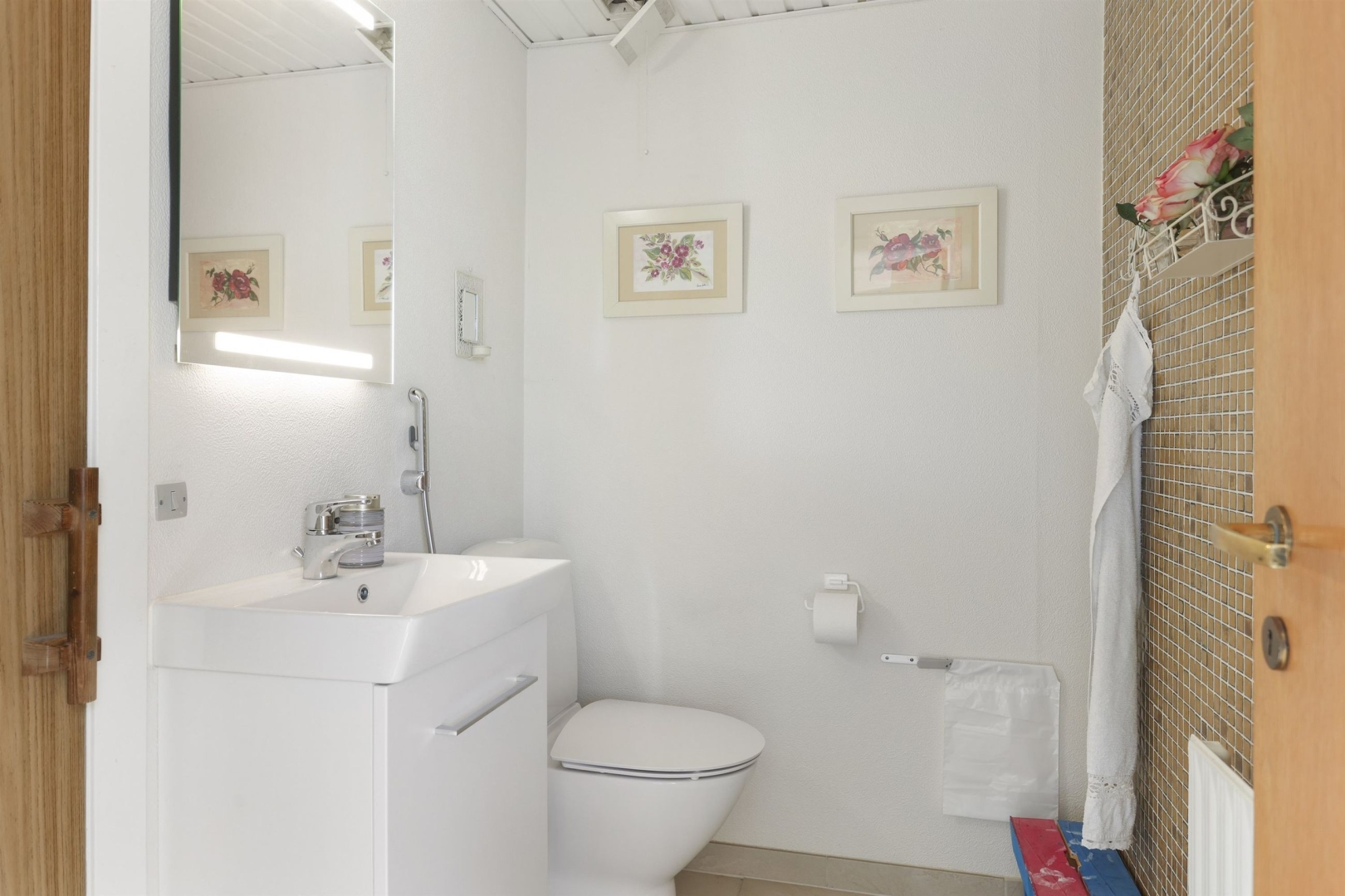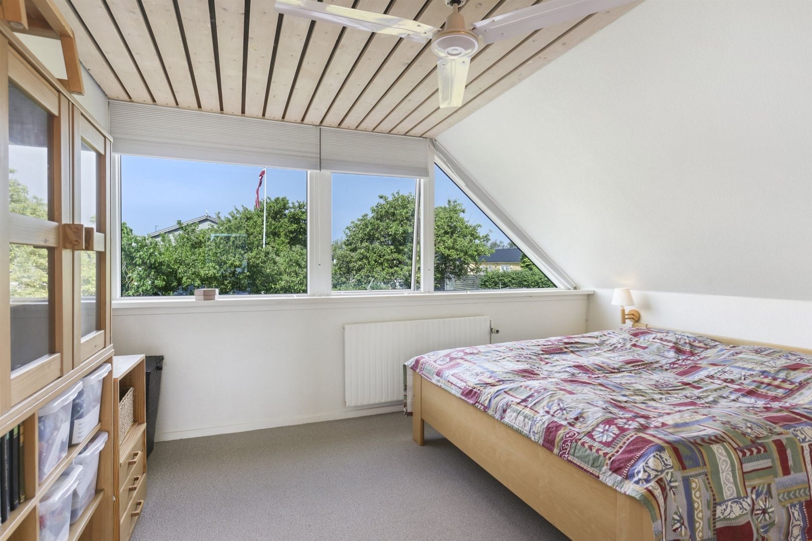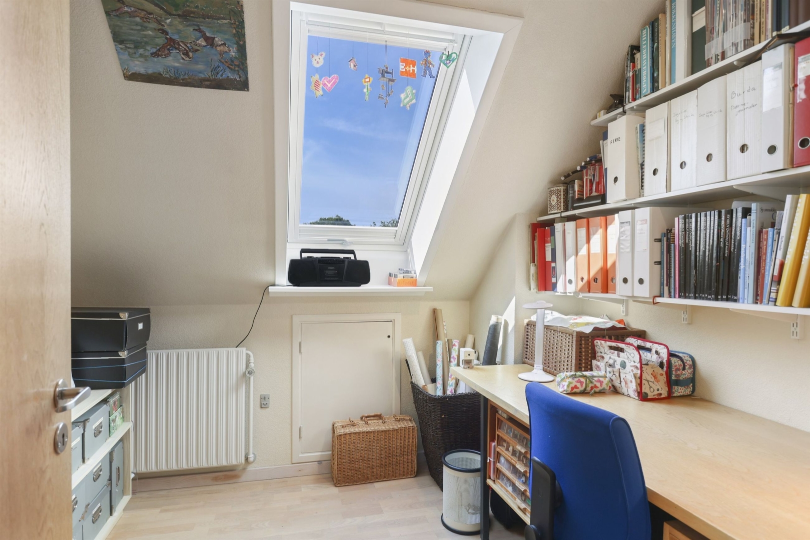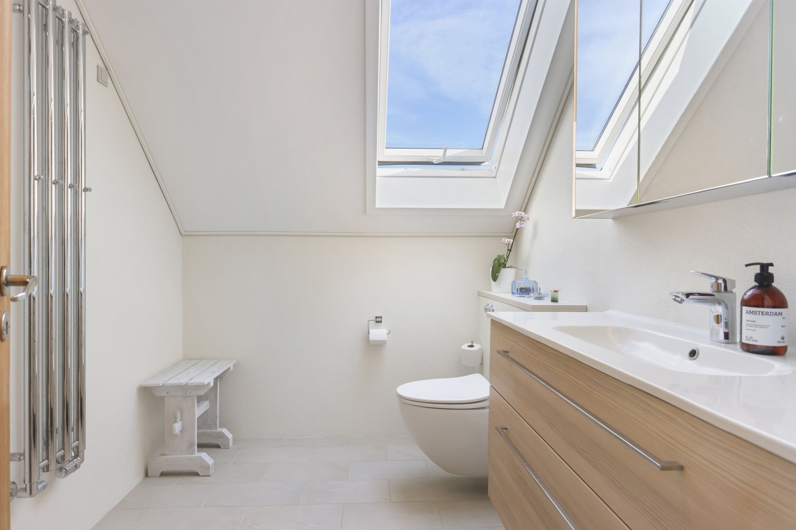 På første sal finder I en lys balkonstue, der kan bruges som arbejdsplads eller legerum, og fra det brede vinduesparti kan I nyde udsigten til vandet og de smukke solopgange. Der er to børneværelser med skabe og gavlvinduer, et soveværelse med indbyggede skabe, et kontor eller mindre værelse med tagvindue samt et stilfuldt badeværelse med klinkegulv, gulvvarme, bruseniche, håndklædetørrer, væghængt toilet og dagslysindfald. En fordelingsgang binder rummene sammen. Vinduespartier i galv mod vest er med solfilter.