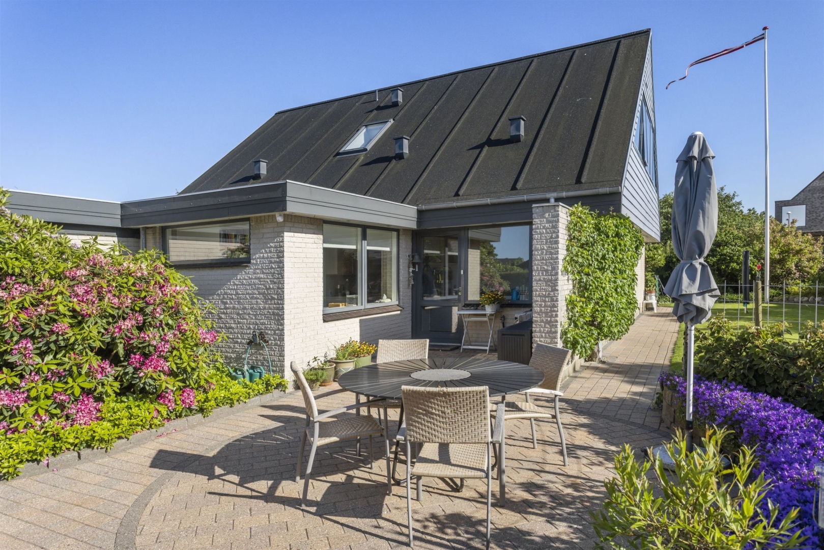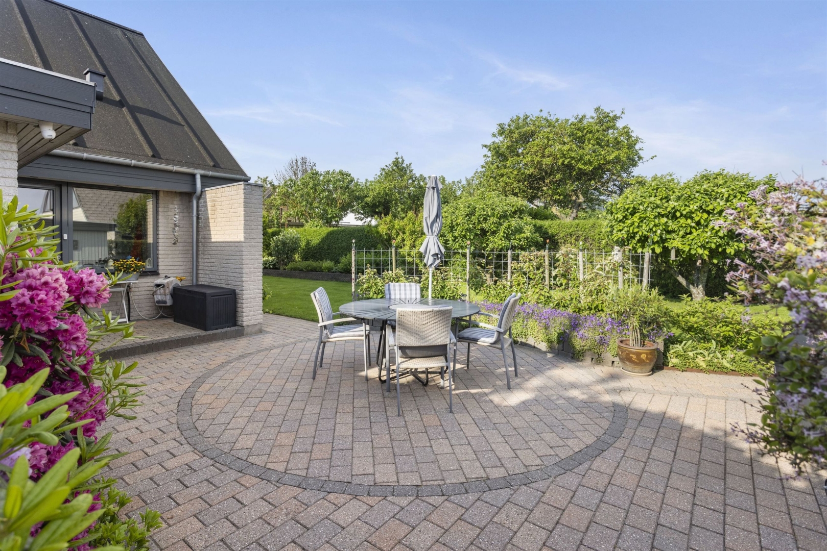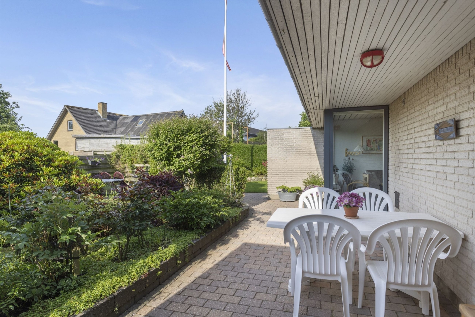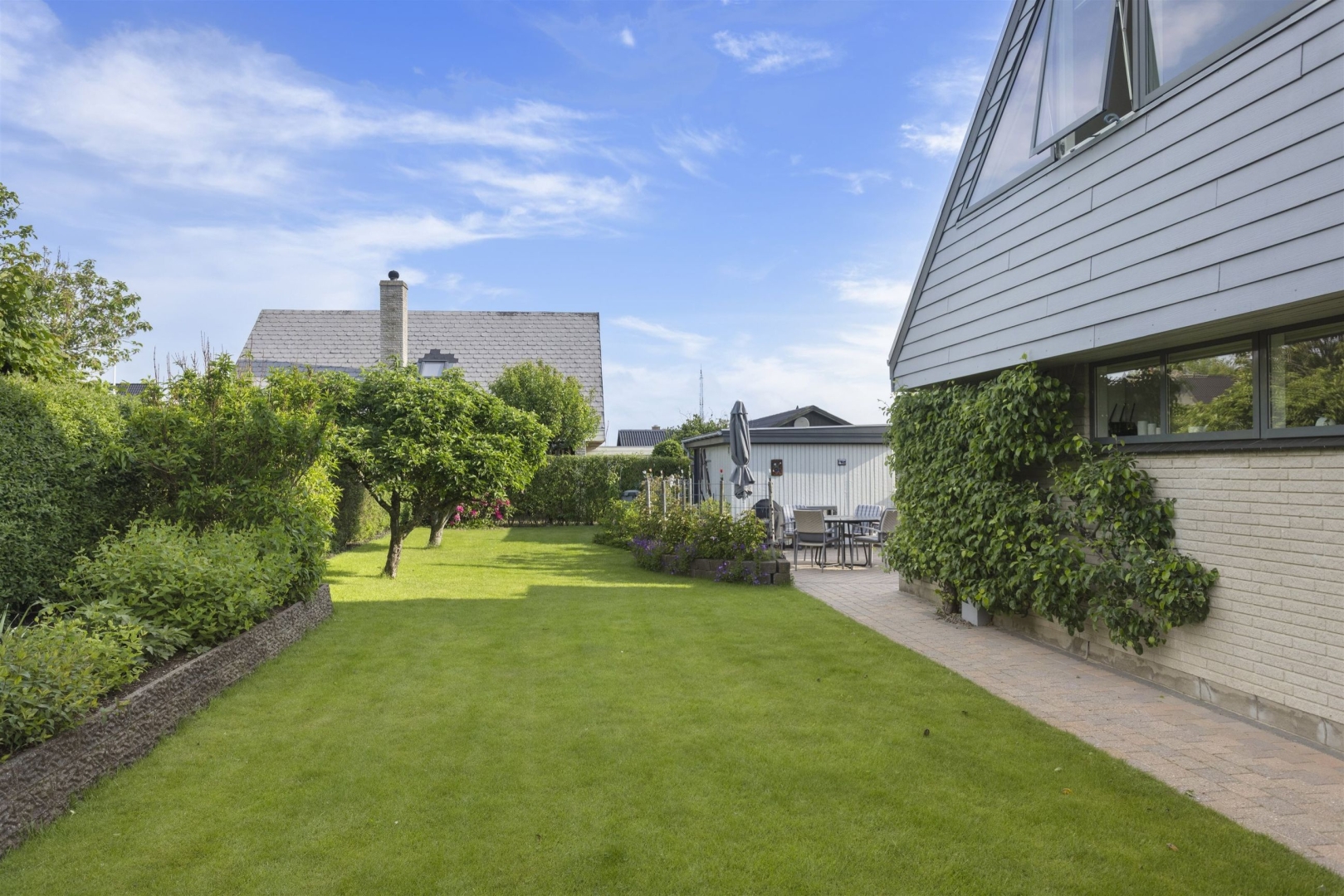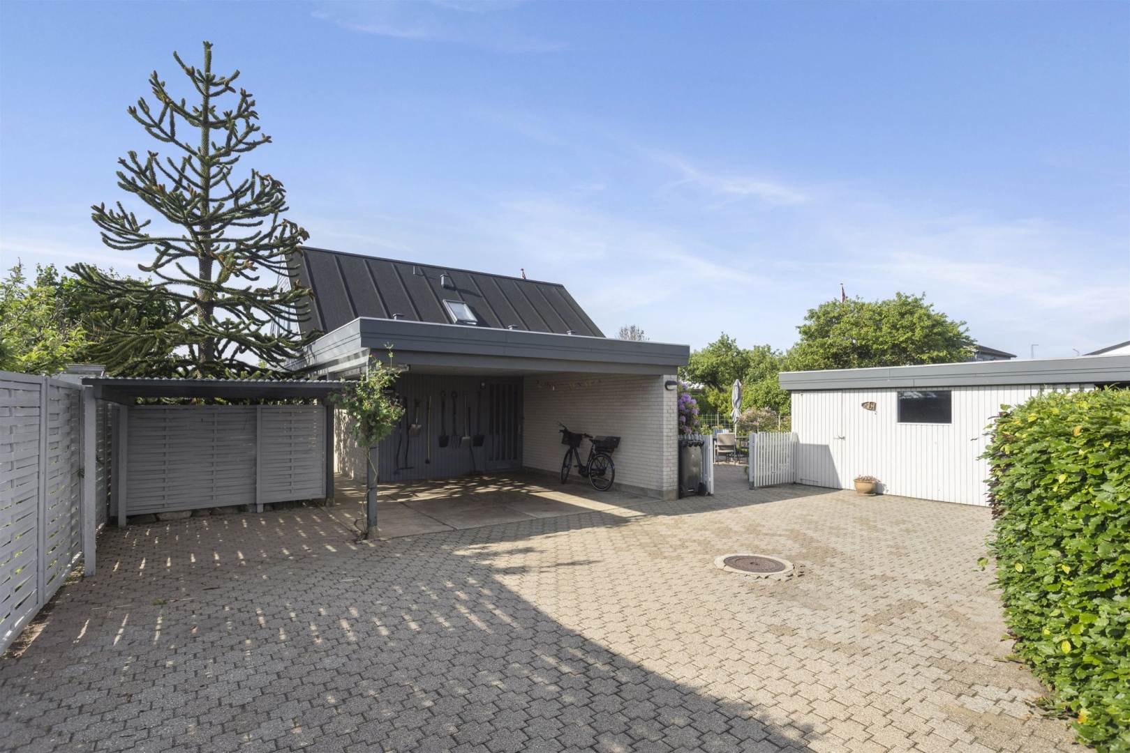 Grunden på 680 m² er veludnyttet og rummer blandt andet flere terrasser, en dobbelt carport på 32 m², hvoraf 7 m² udgør et udhus, samt et overdækket areal velegnet til cykler. Derudover findes endnu et udhus på 17 m², som giver ekstra opbevaringsplads.