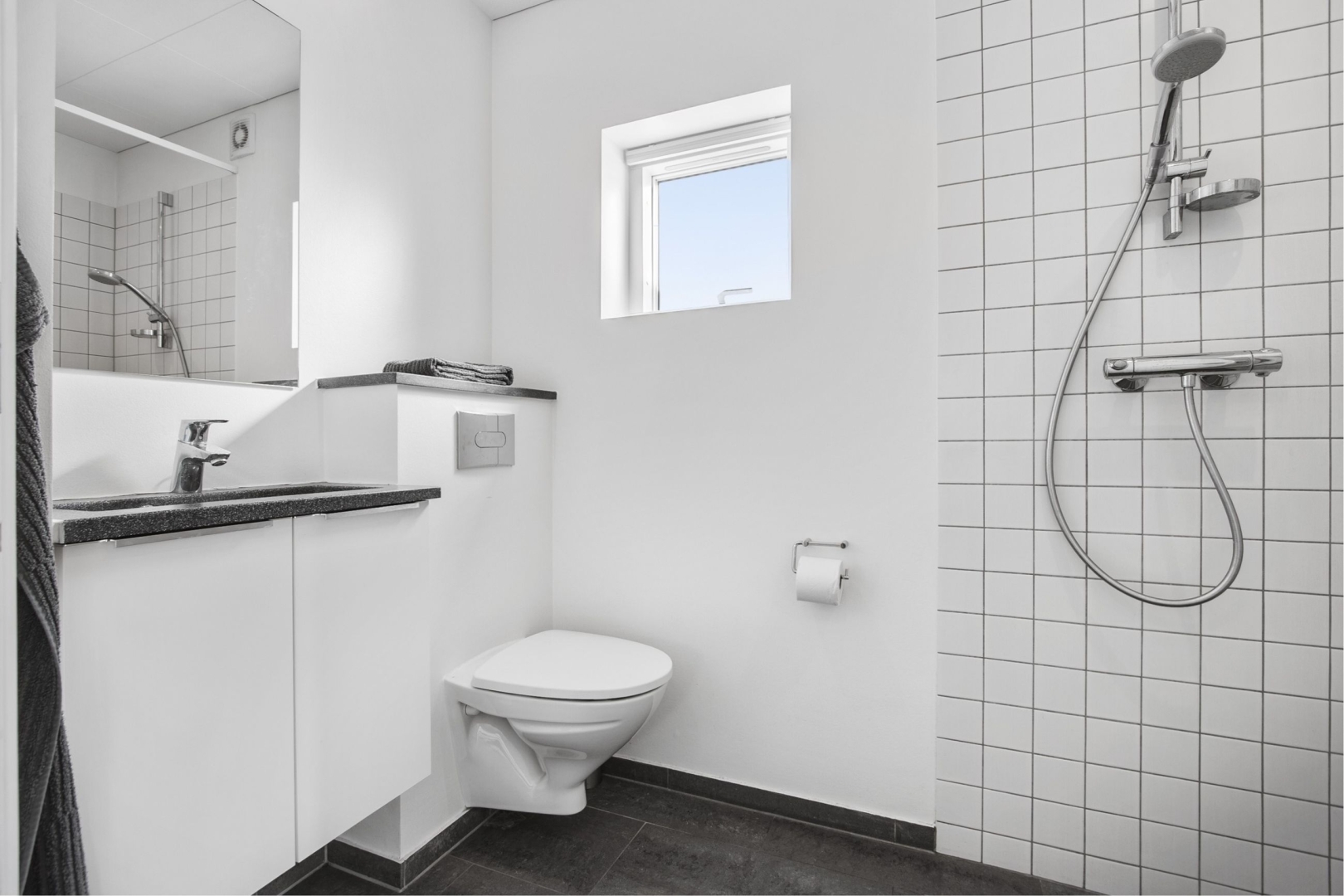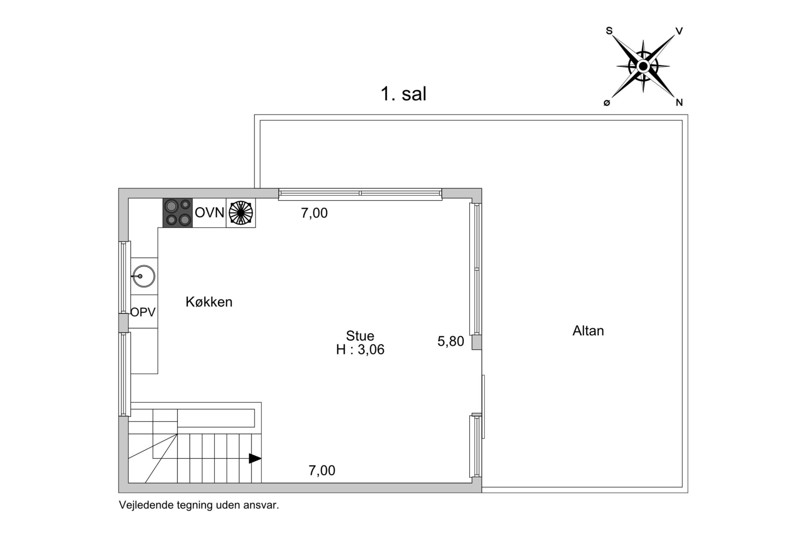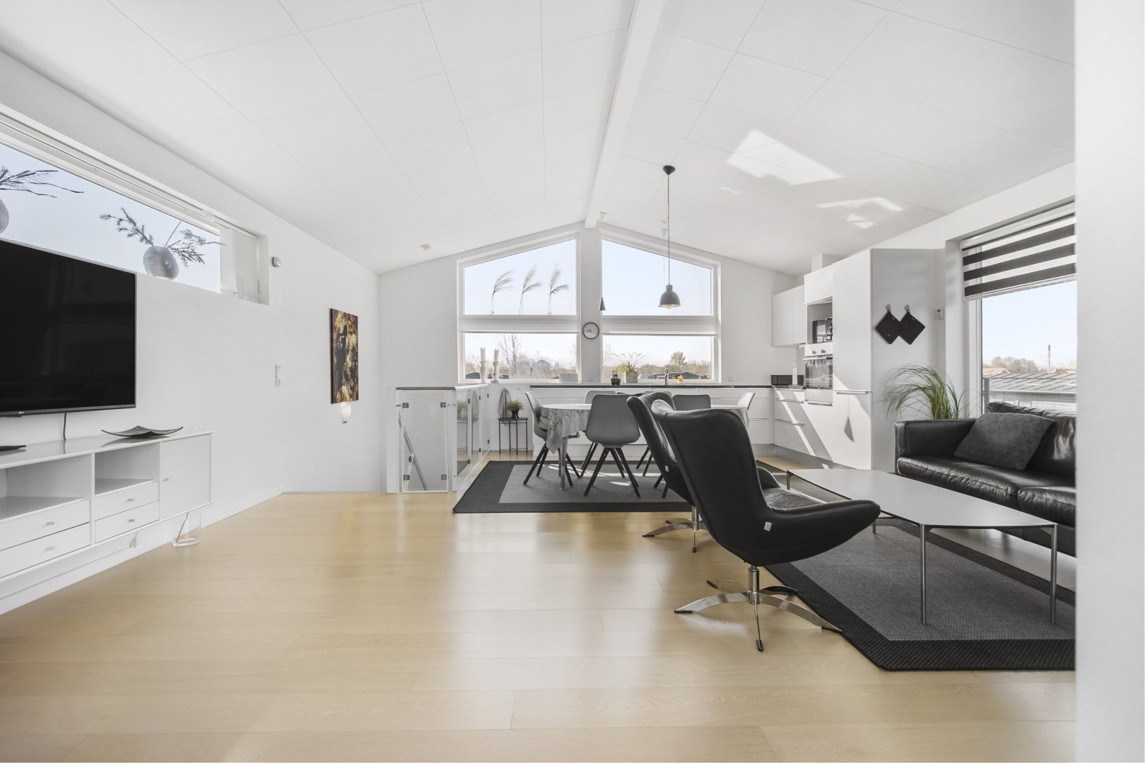 1. sal, som er med gulvvarme, indeholder: Stort lækkert og lyst rum på ca. 40 m² som er indrettet med tidløst køkken, spiseplads og opholdsstue. Fra de store gulv-til-loft vinduer strømmer lyset ind.