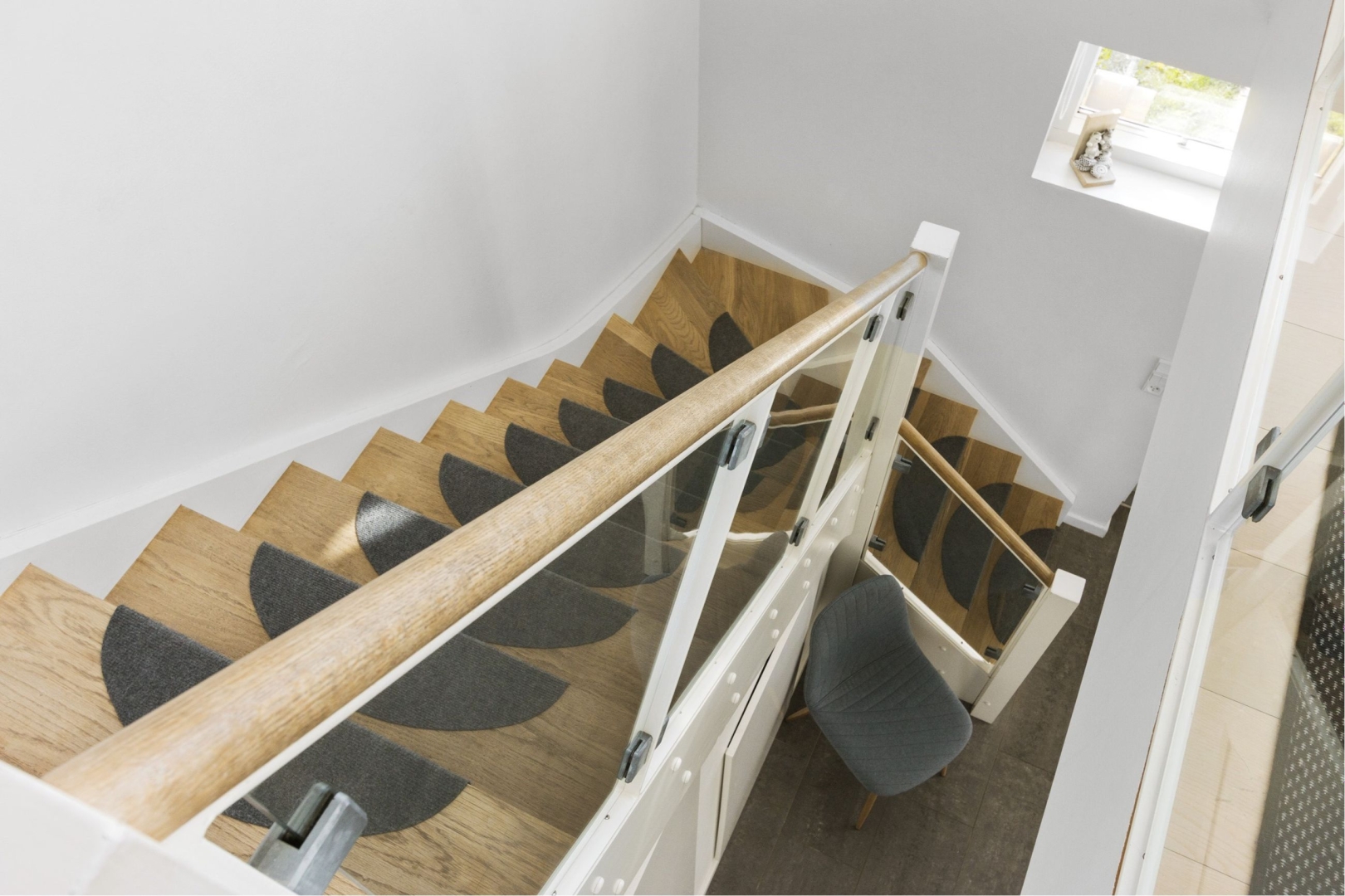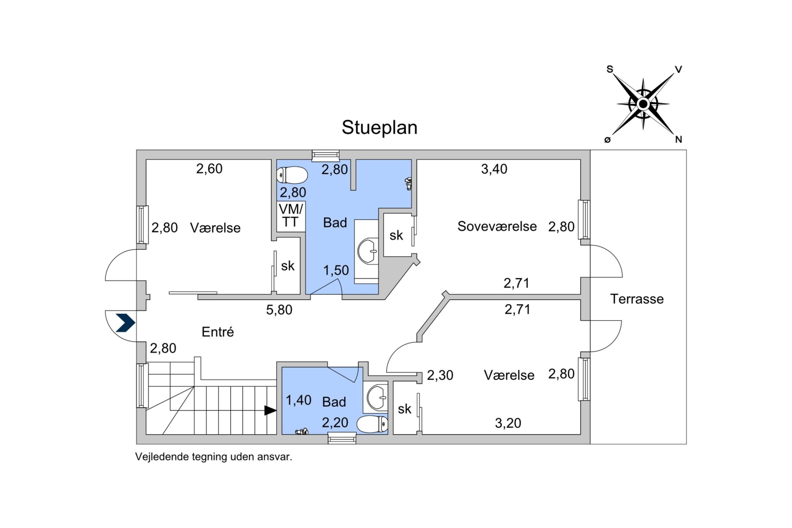 Stueplan, som overalt er med gulvvarme, indeholder: Entré med klinkegulv og elegant trappe til 1. sal - 3 soveværelser med klinkegulv og terrassedør - 2 badeværelser begge med bruseniche, væghængt toilet samt klinkegulv.