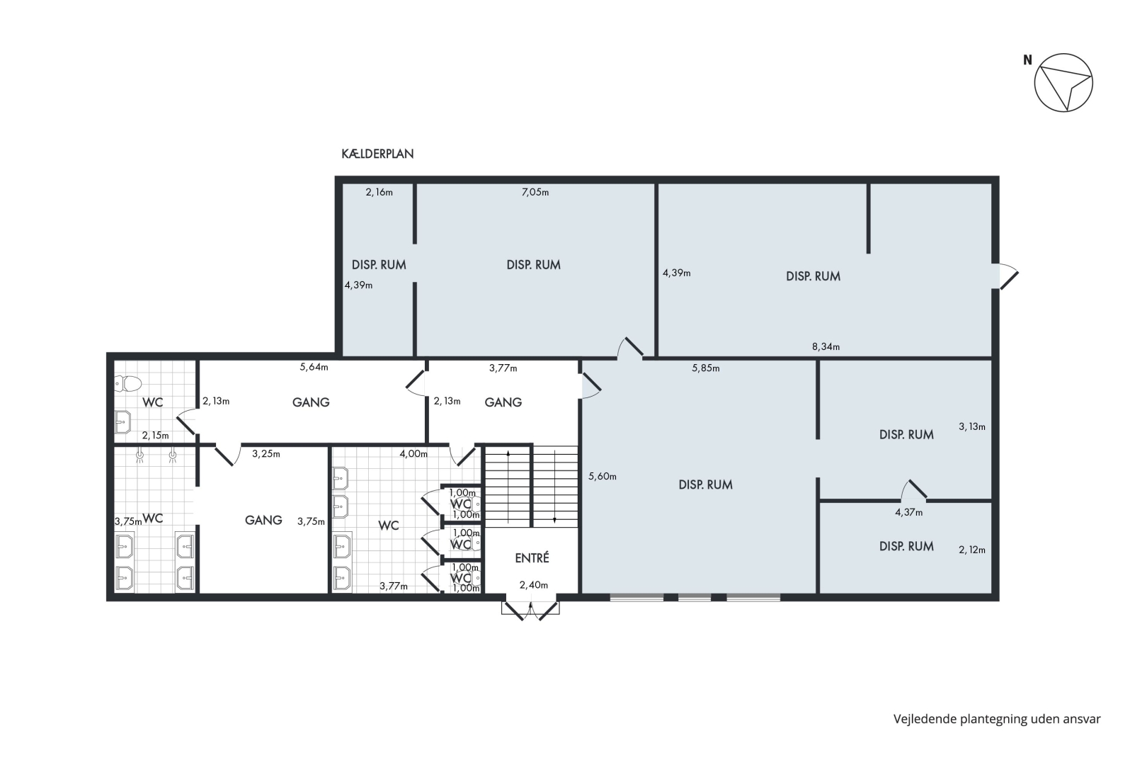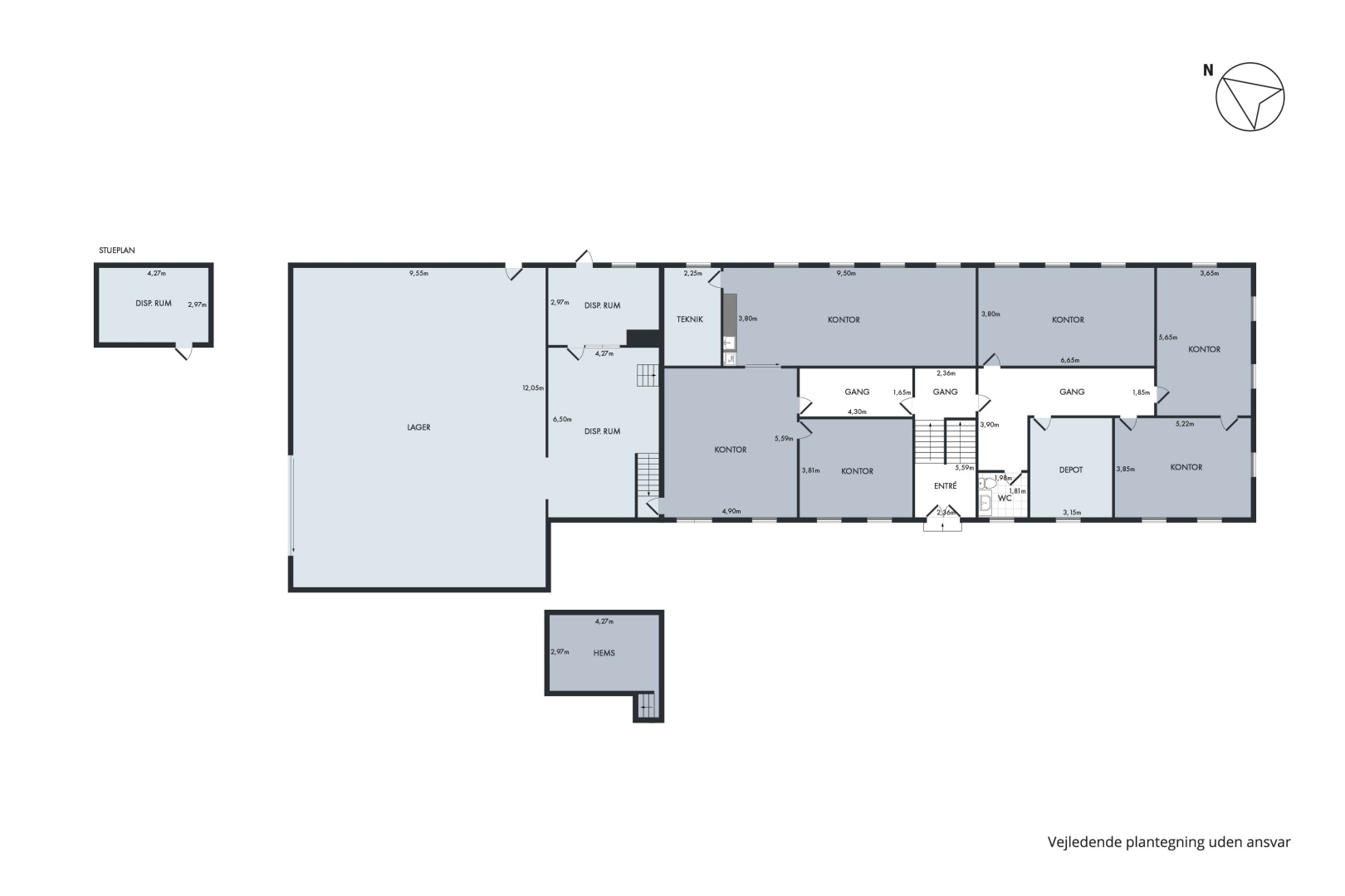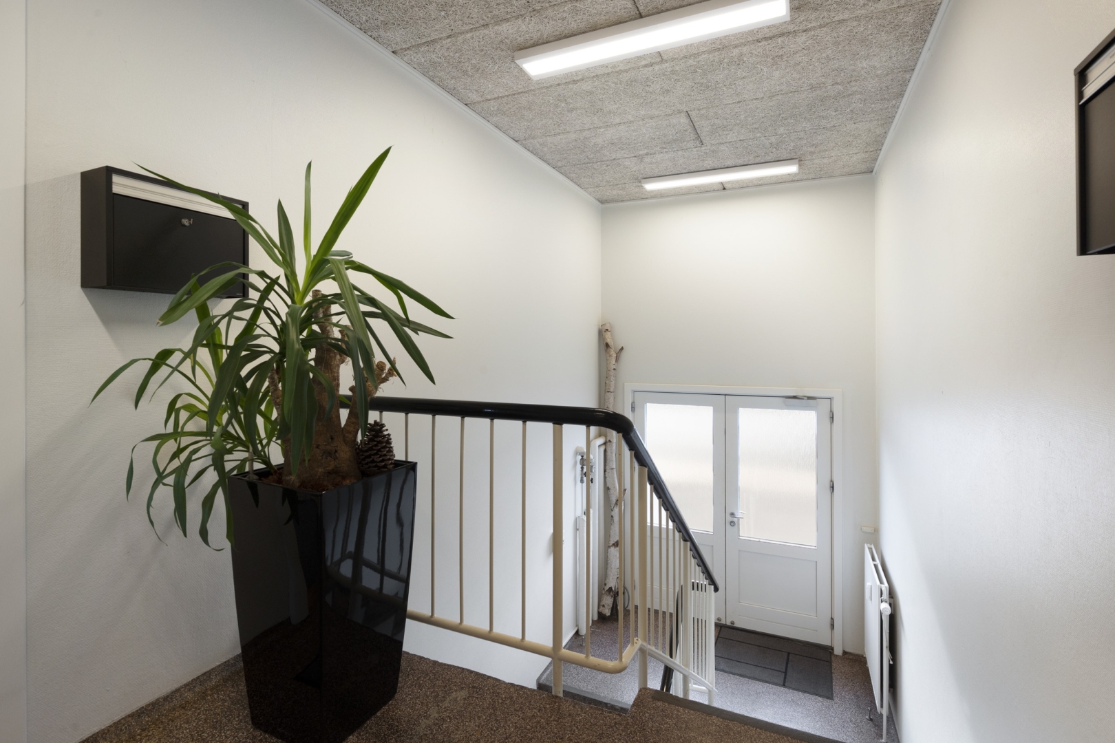 Ejendommen er indrettet med en høj stueetage der indeholder, mellemgang kontor med plads til 3-4