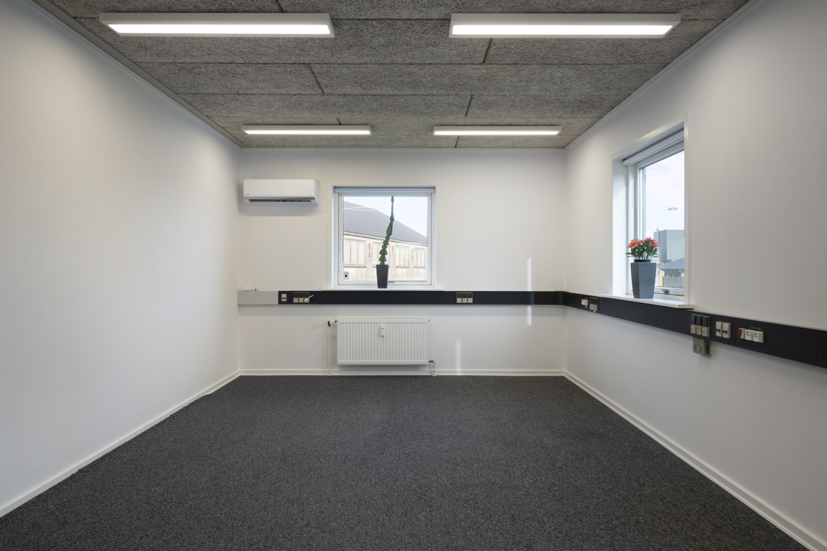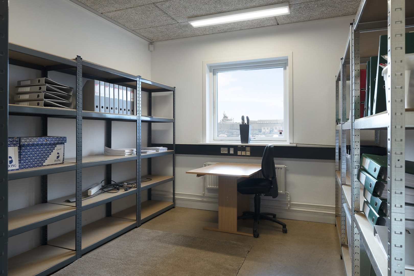Separat lejemål med fordelergang, med garderobe og egen elmåler, toilet med håndvask, arkiv, forkontor, chefkontor med tæppebelægning.