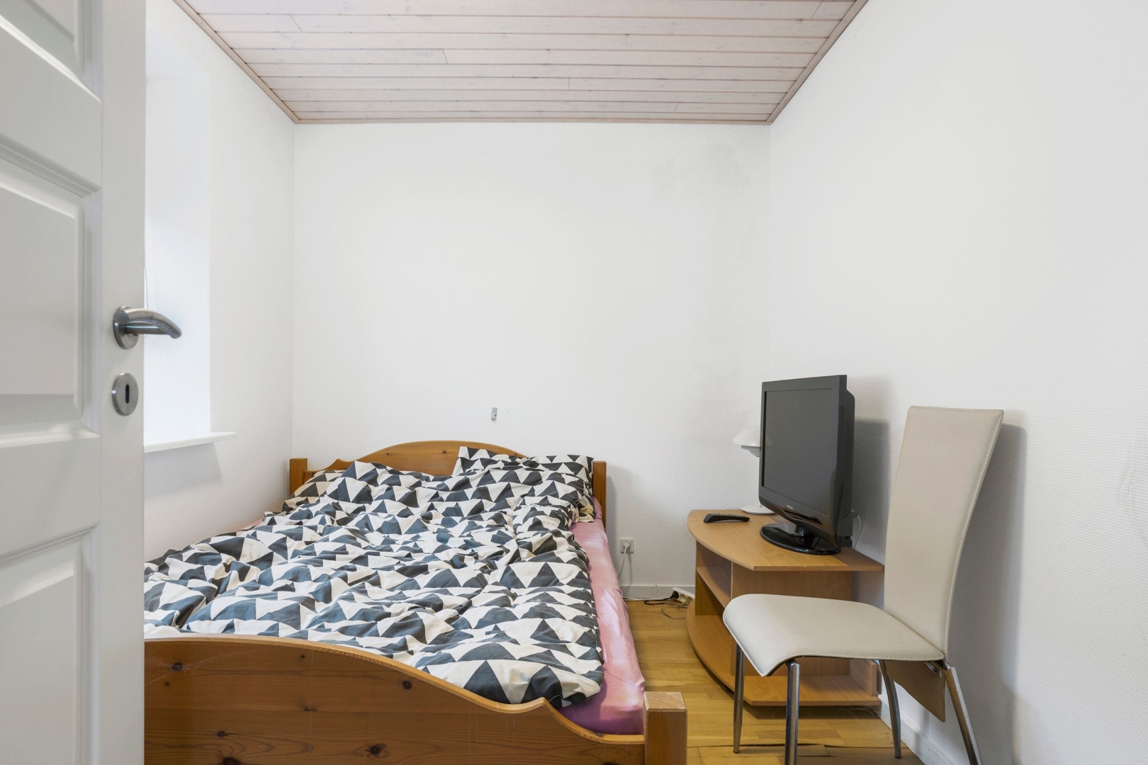 ·Lejlighed over krostuen: Denne lejlighed er tilgængelig via en udvendig trappe og har tidligere lidt under vandskader, hvorfor den trænger til renovering. Den indeholder et rum til køkken, et toilet med bruser, to værelser, opholdsstue og soveværelse.