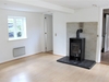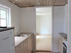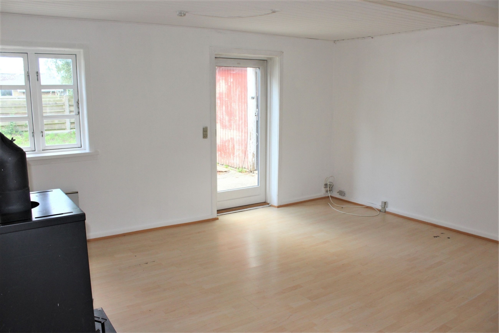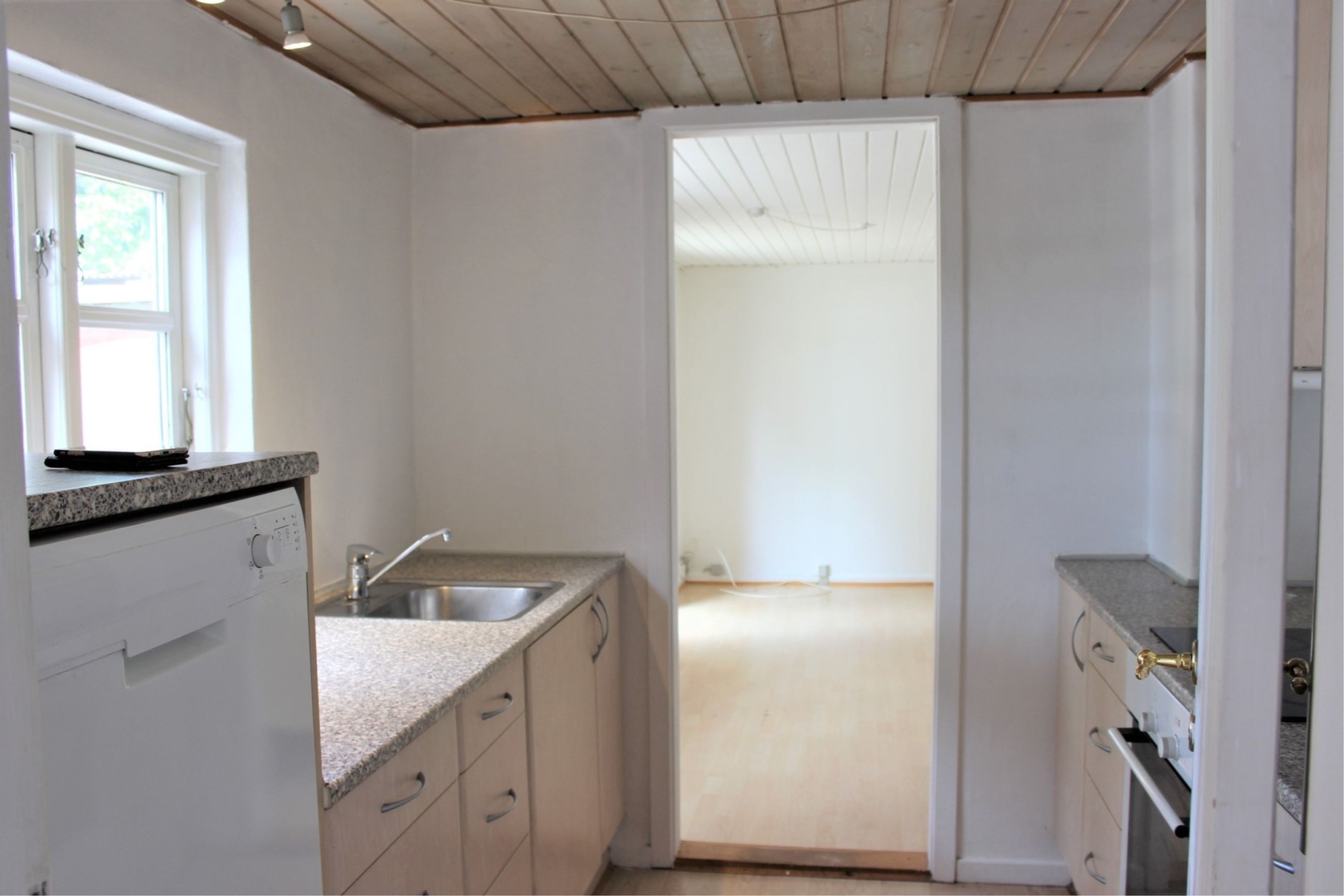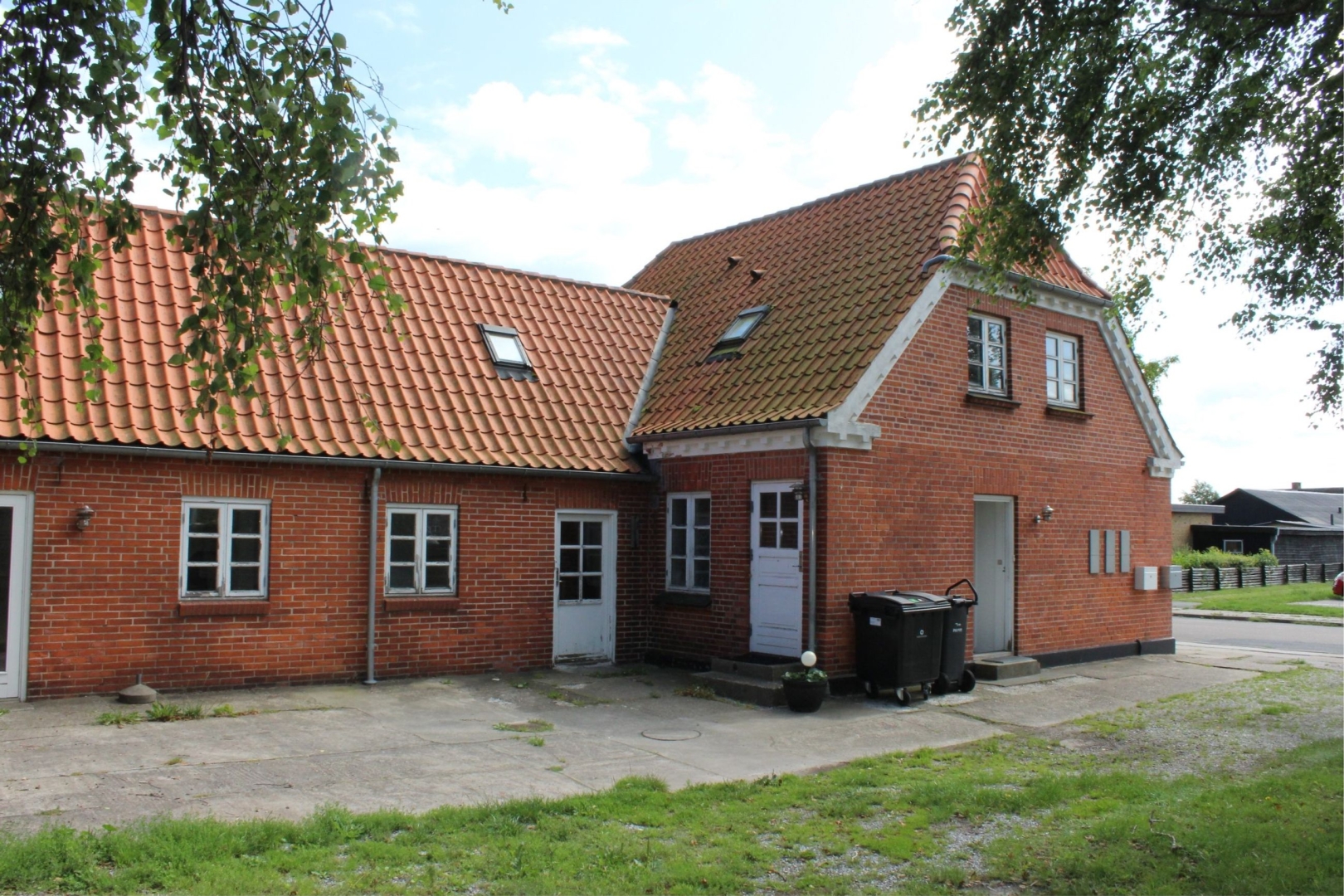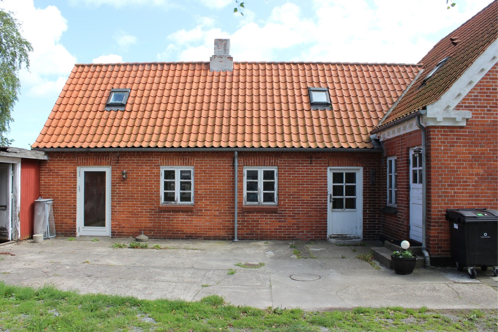 Baghus 74 m²: Entré m trappe til 1. sal- Badeværelse med bruseniche - Køkken - Stue med brændeovn og udgang til gården - Værelse - 1. sal er indrettet med et værelse - Fordelingsgang - Soveværelse. På 1. sal er der ligeledes synlige bjælker.