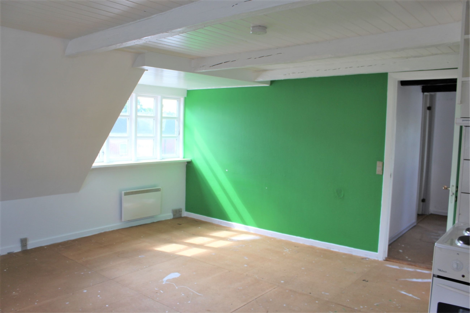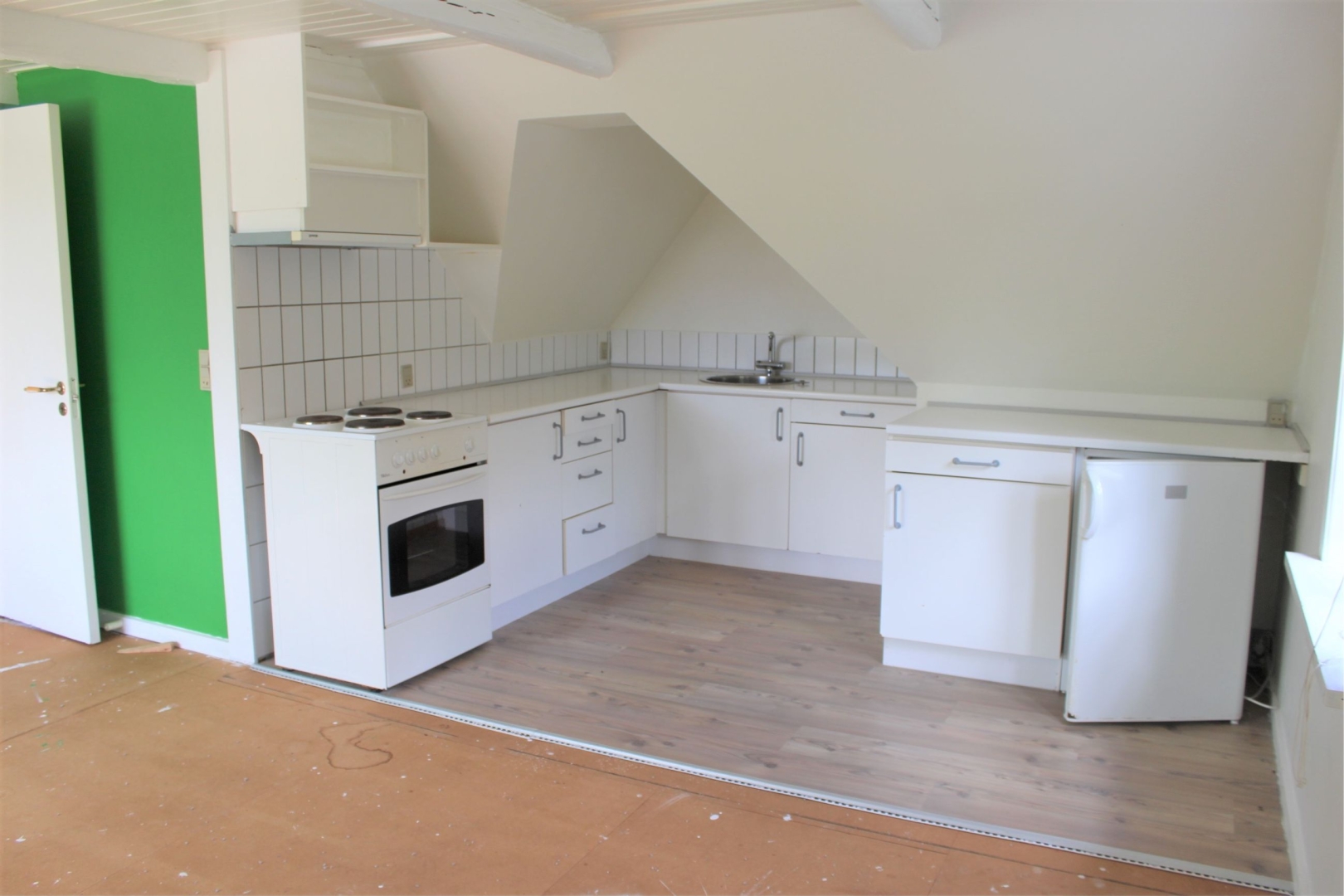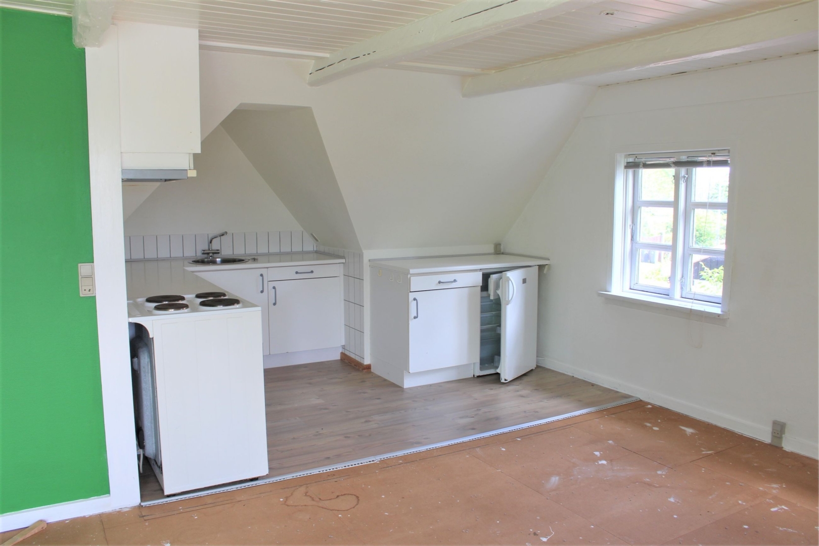 1 sals lejlighed 37 m²: Entré med trappe til 1. sal - Badeværelse med bruseniche - Værelse - Køkken kombineret med stue hvor der er synlige bjælker samt kvist.