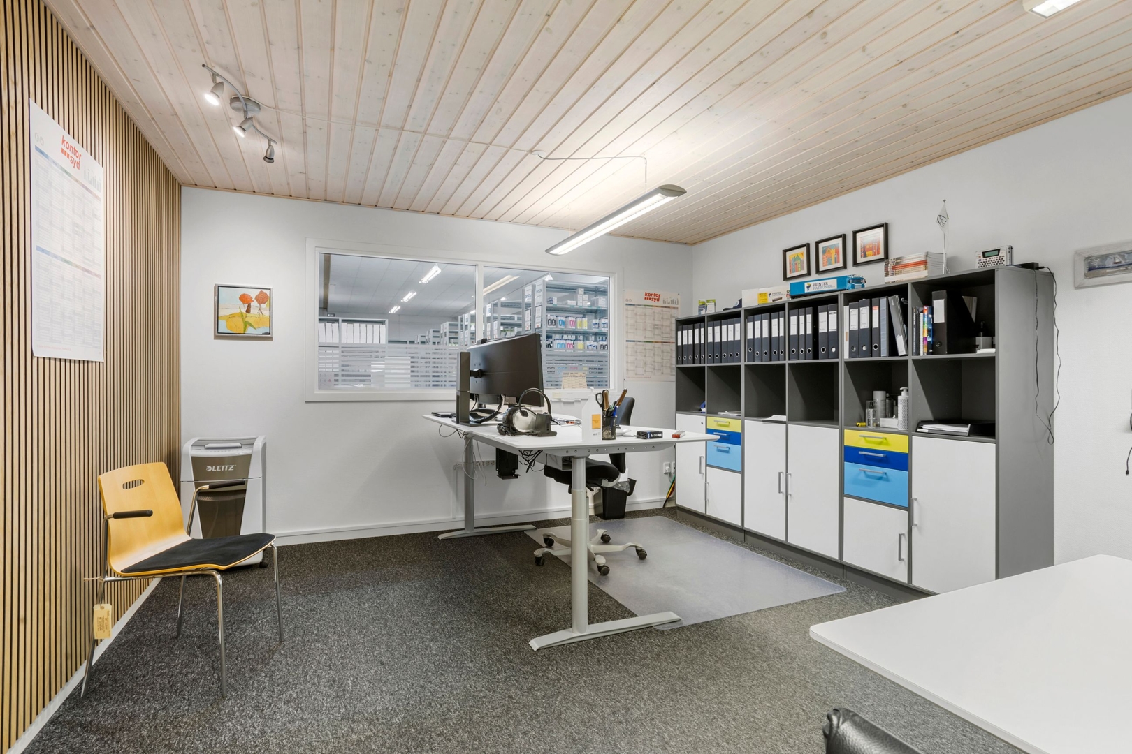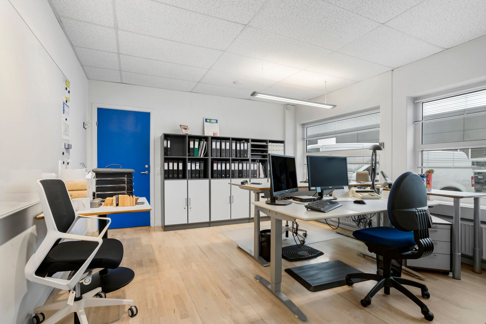 Med ca. 300 m² afskærmet kontorareal rummer ejendommen alt, hvad der behøves til en moderne arbejdsplads. Den store, markante indgang til administrationen skaber et professionelt førstehåndsindtryk. Indeholder blandt andet forkontor med plads til 4 skriveborde og udstilling, en rummelig kantine med et praktisk køkken – som kan opdeles med en foldevæg til et separat mødelokale. Derudover er der chefkontor, mødelokale og moderne toiletter.