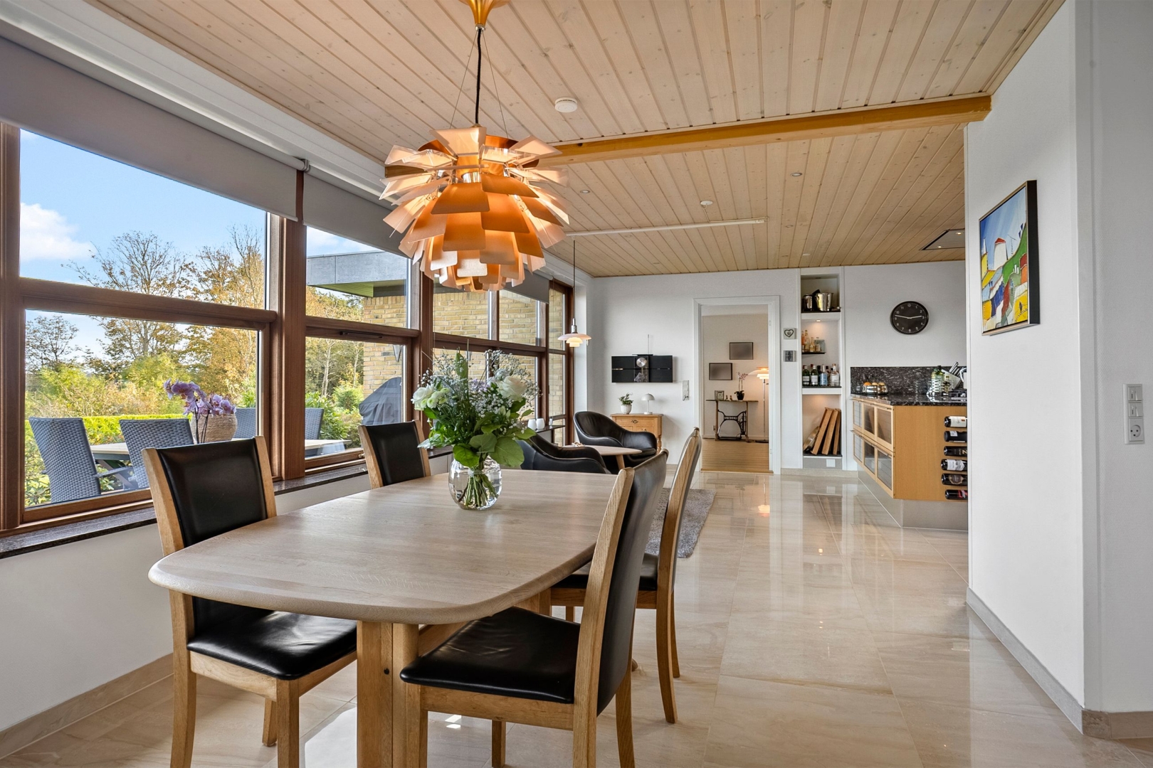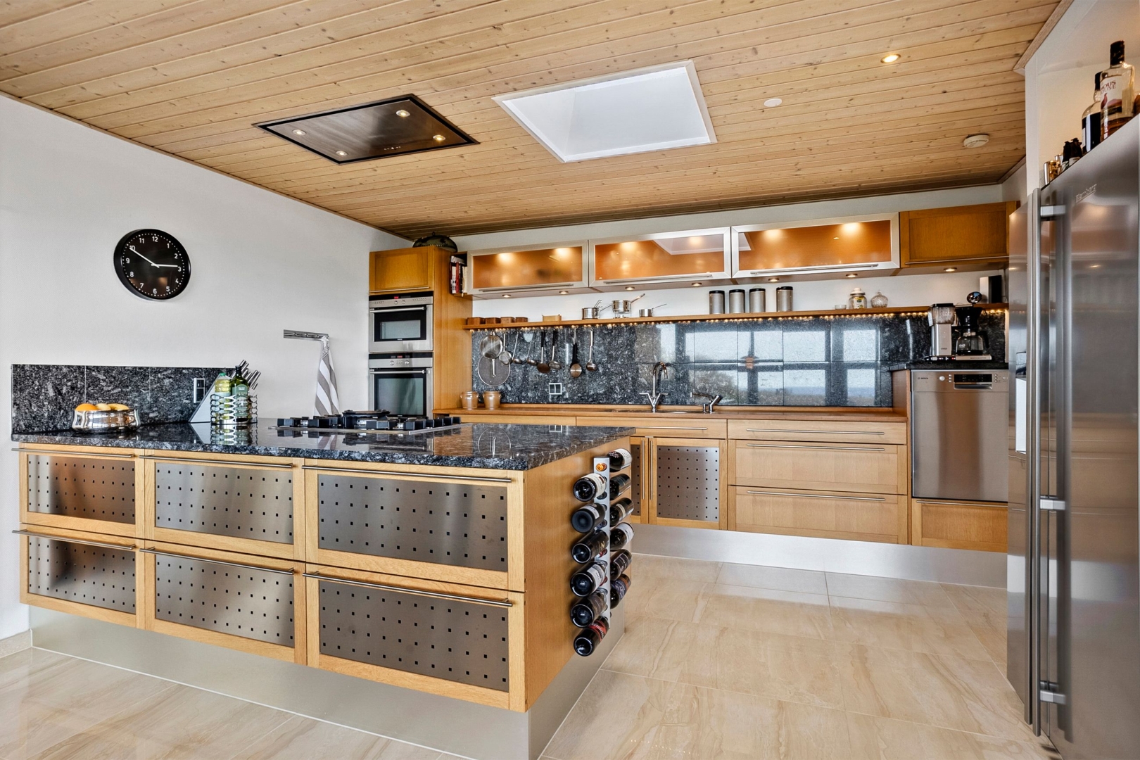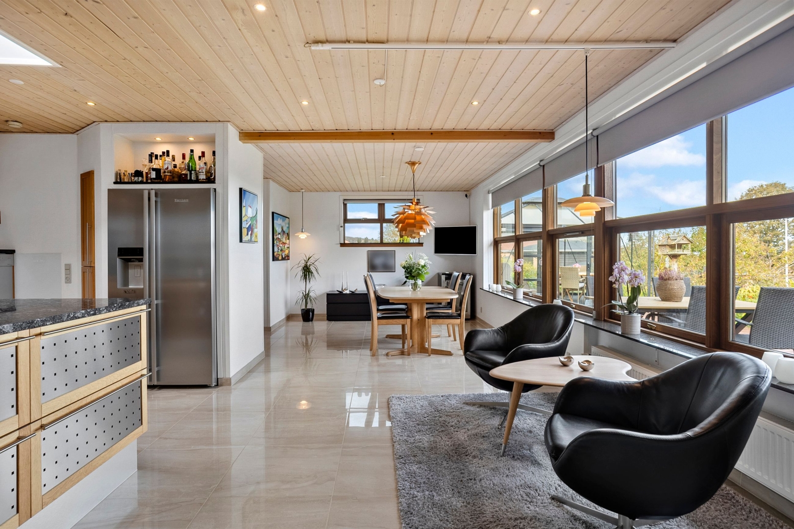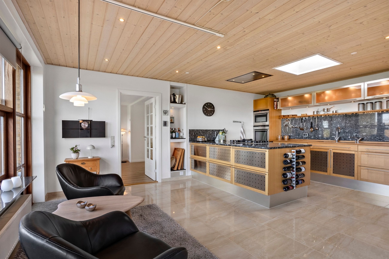 Indenfor byder villaen velkommen i en lys og venlig entré med god garderobeplads, hvorfra man træder ind i det store og indbydende køkken/alrum. Her er der lagt flotte, polerede italienske klinker, og de store vinduespartier sikrer et imponerende lysindfald og en panoramaudsigt, der kan nydes året rundt. Fra køkkenet er der udgang til den store træterrasse, hvor udsigten strækker sig fra by og hav til marker og skov.