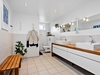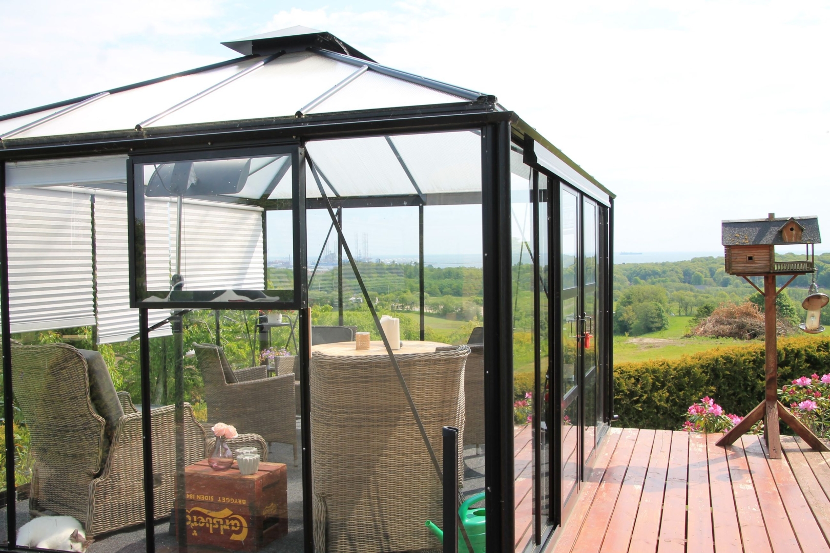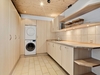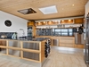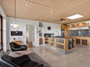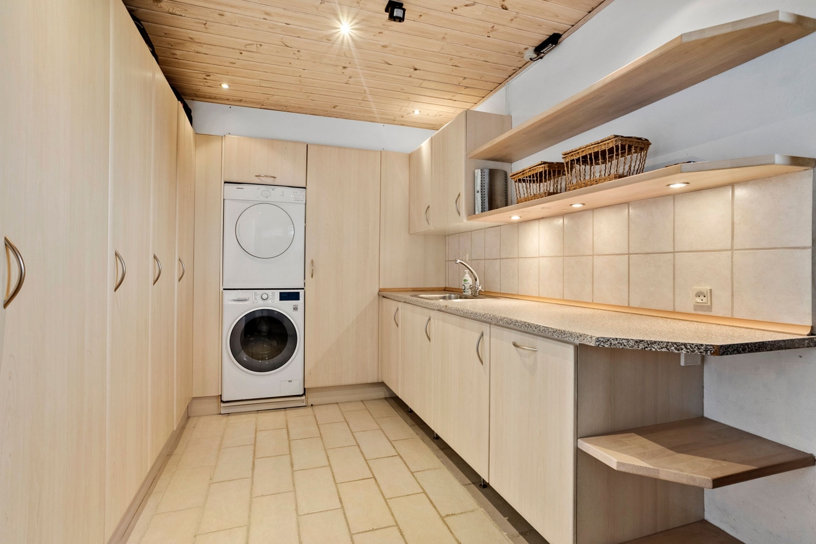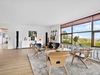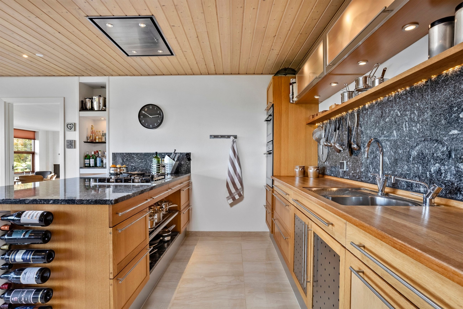 Indenfor byder villaen velkommen i en lys og venlig entré med god garderobeplads, hvorfra man træder ind i det store og indbydende køkken/alrum. Her er der lagt flotte, polerede italienske klinker, og de store vinduespartier sikrer et imponerende lysindfald og en panoramaudsigt, der kan nydes året rundt. Fra køkkenet er der udgang til den store træterrasse, hvor udsigten strækker sig fra by og hav til marker og skov.