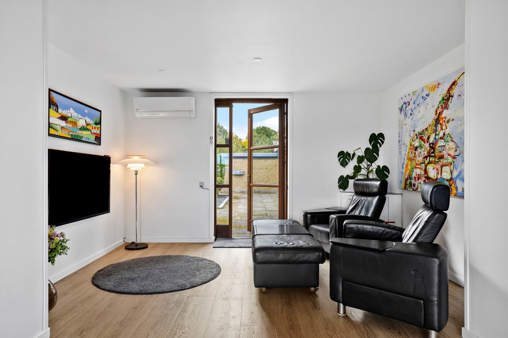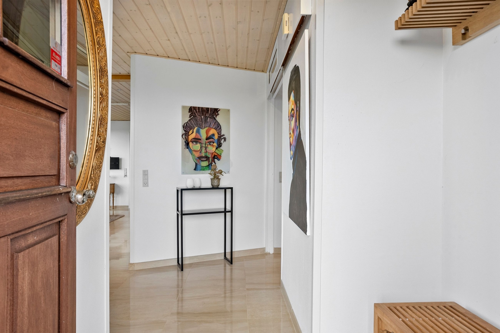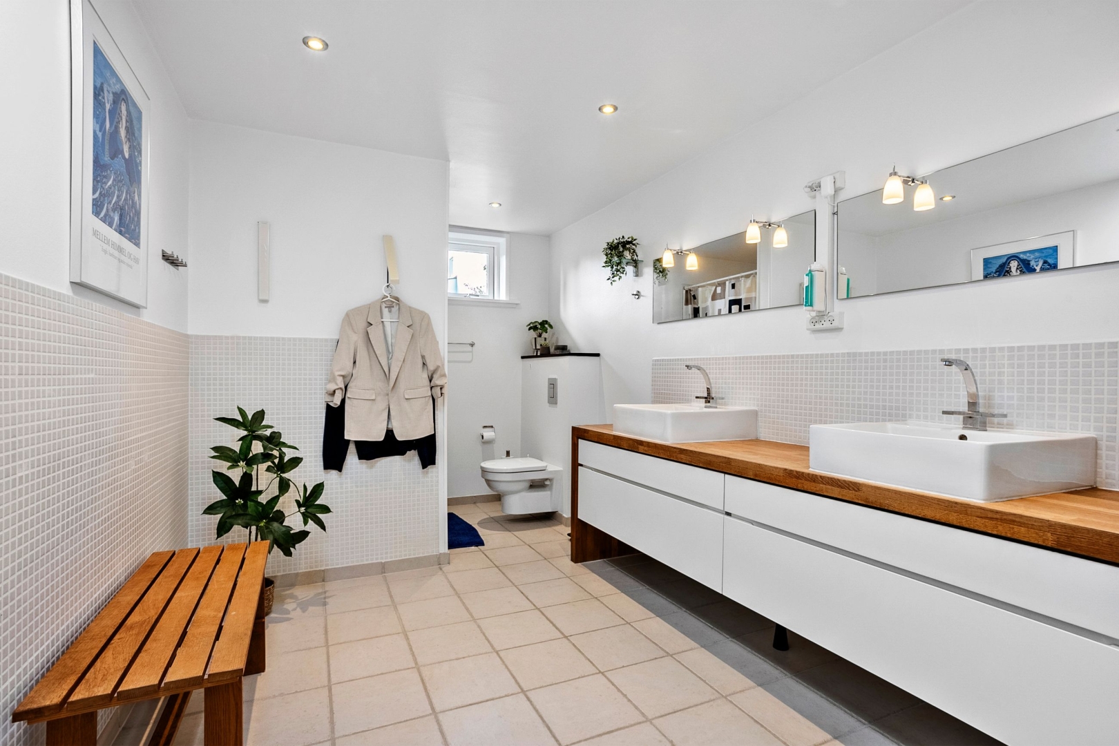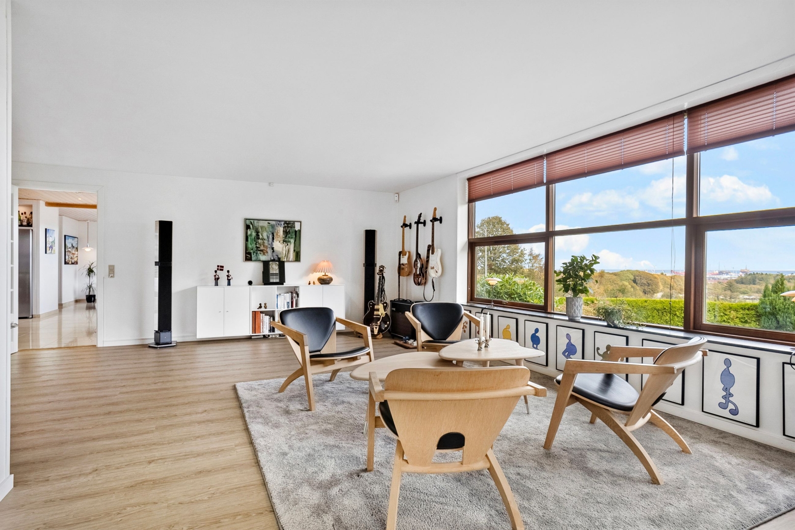 Boligen rummer desuden en lys fordelingsgang, et gæstebadeværelse, to gode værelser, et hyggeligt opholdsområde med bar og direkte adgang til den sydvendte gårdhave, et stort soveværelse med skabsvæg samt et badeværelse med dobbeltvask og rummelig bruseniche. Stuerne er placeret, så udsigten kan nydes i fulde drag, og opholdsstuen byder på en stemningsfuld pejseindsats samt adgang til et ekstra værelse eller kontor.