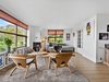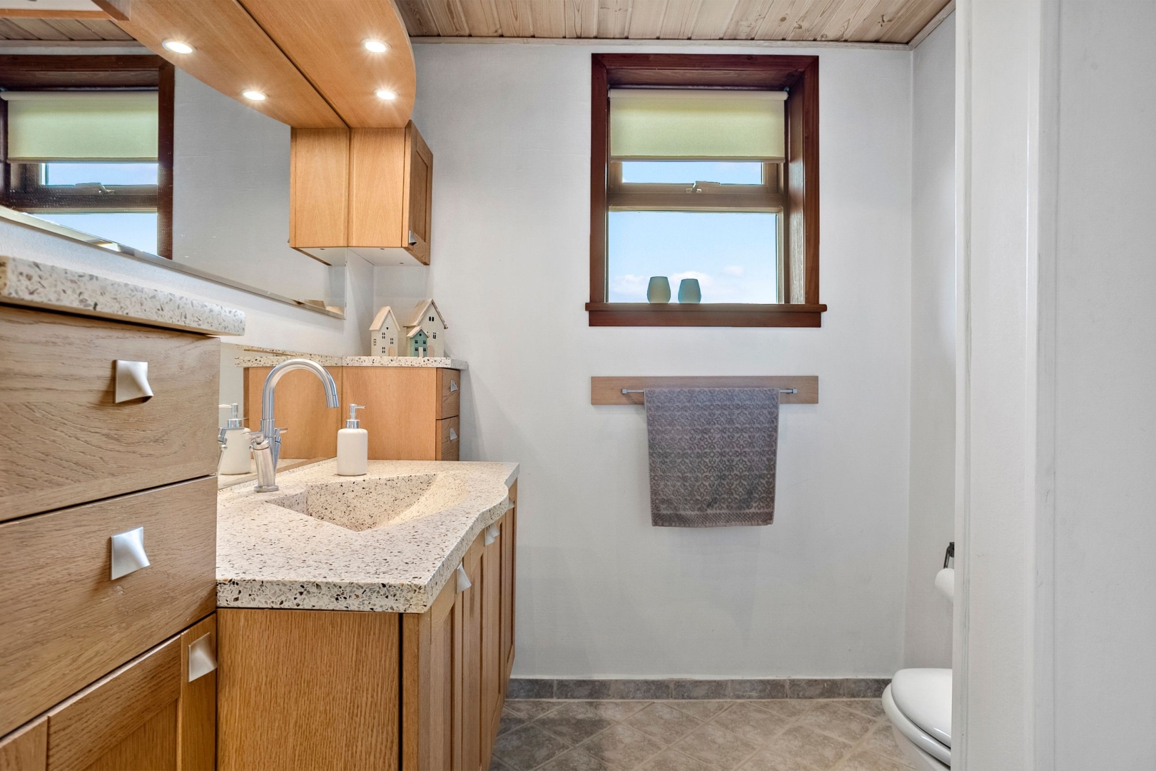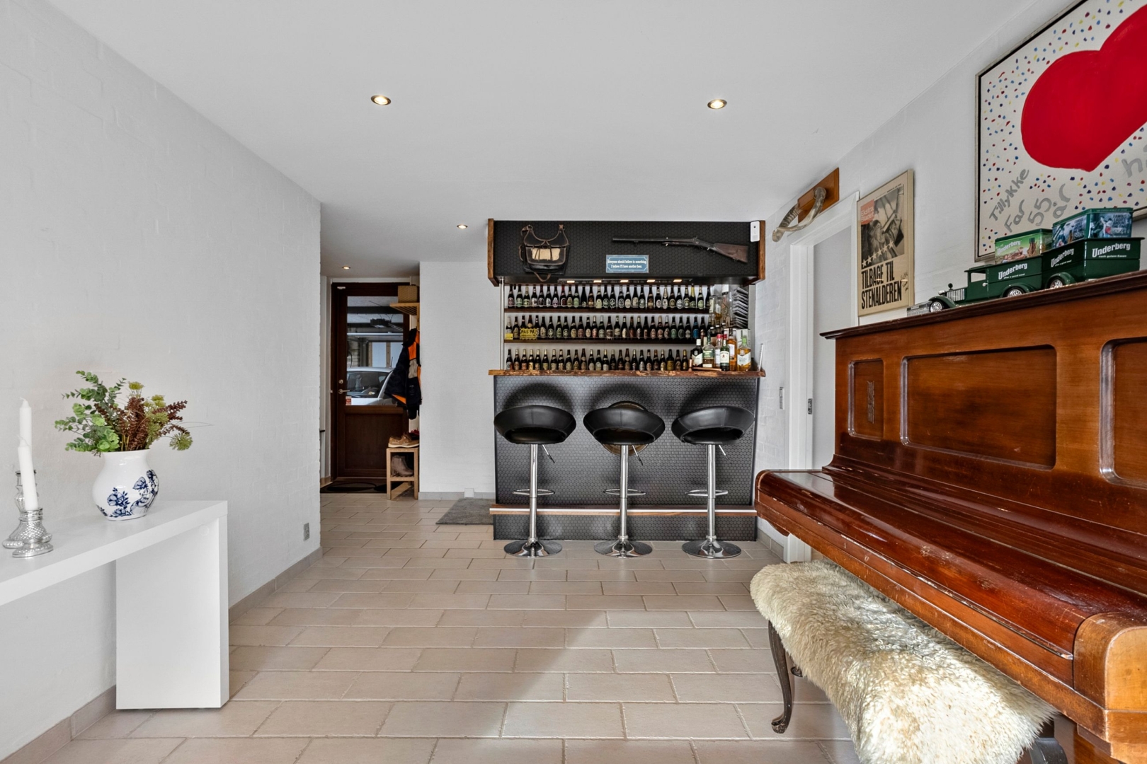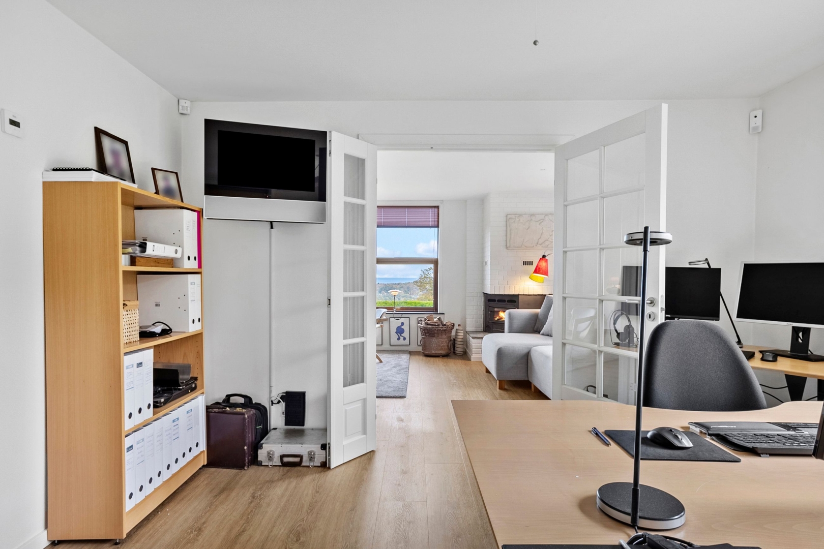 Boligen rummer desuden en lys fordelingsgang, et gæstebadeværelse, to gode værelser, et hyggeligt opholdsområde med bar og direkte adgang til den sydvendte gårdhave, et stort soveværelse med skabsvæg samt et badeværelse med dobbeltvask og rummelig bruseniche. Stuerne er placeret, så udsigten kan nydes i fulde drag, og opholdsstuen byder på en stemningsfuld pejseindsats samt adgang til et ekstra værelse eller kontor.