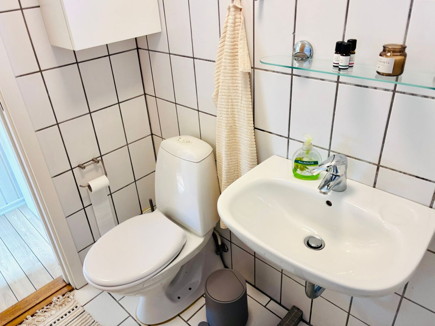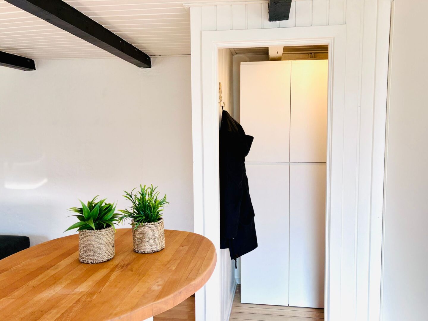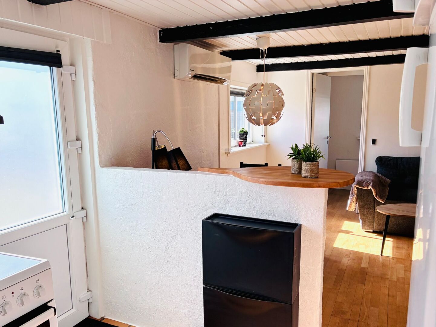 Boligen indeholder et køkken med hvide fronter, sort bordplade og klinkegulv i åben forbindelse med opholdsstuen, hvor der er installeret luft-luft-varmepumpe og etableret en halvmur mod køkkenet. Herudover rummer boligen et badeværelse med bruseniche og hvide klinker på både gulv og vægge samt et mindre soveværelse.