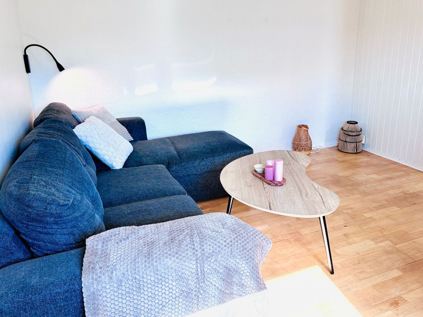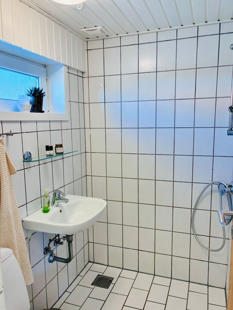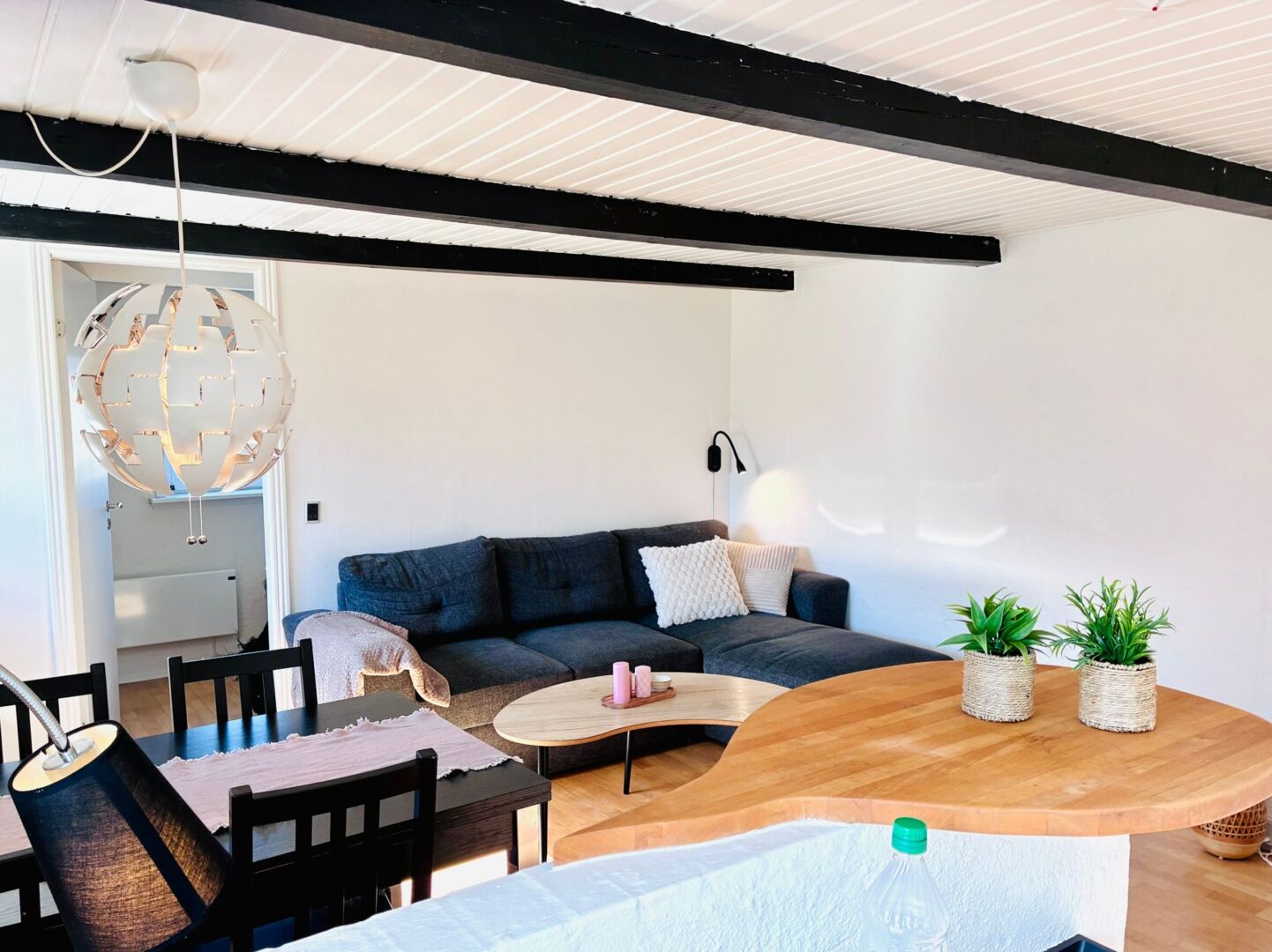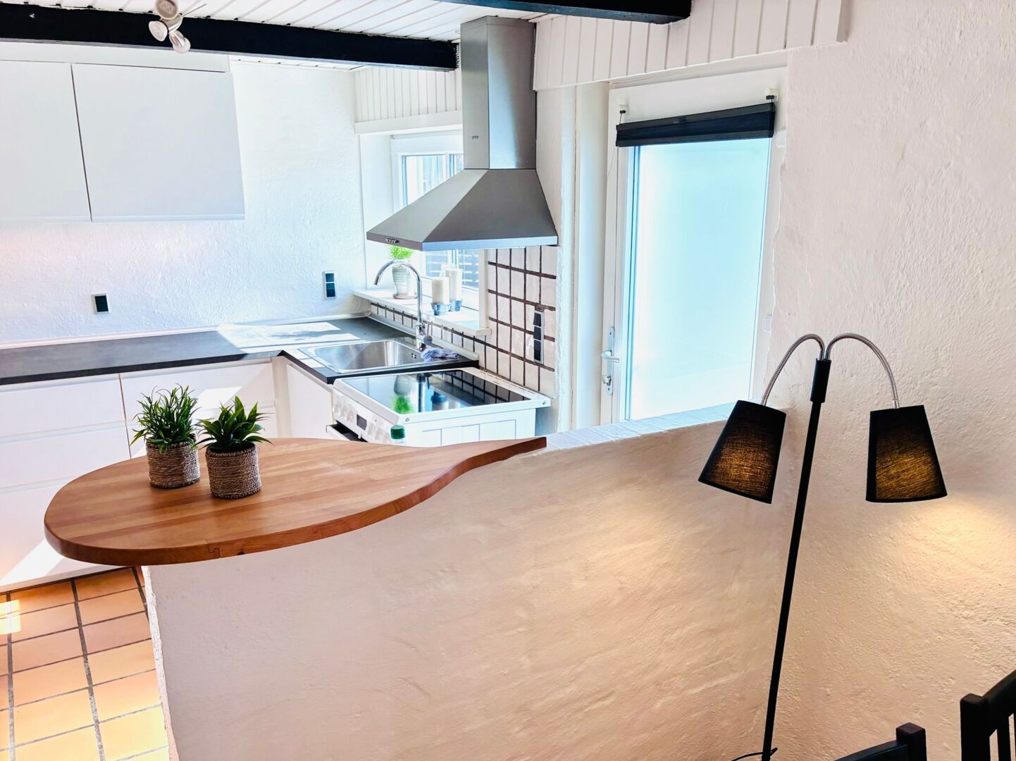 Boligen indeholder et køkken med hvide fronter, sort bordplade og klinkegulv i åben forbindelse med opholdsstuen, hvor der er installeret luft-luft-varmepumpe og etableret en halvmur mod køkkenet. Herudover rummer boligen et badeværelse med bruseniche og hvide klinker på både gulv og vægge samt et mindre soveværelse.