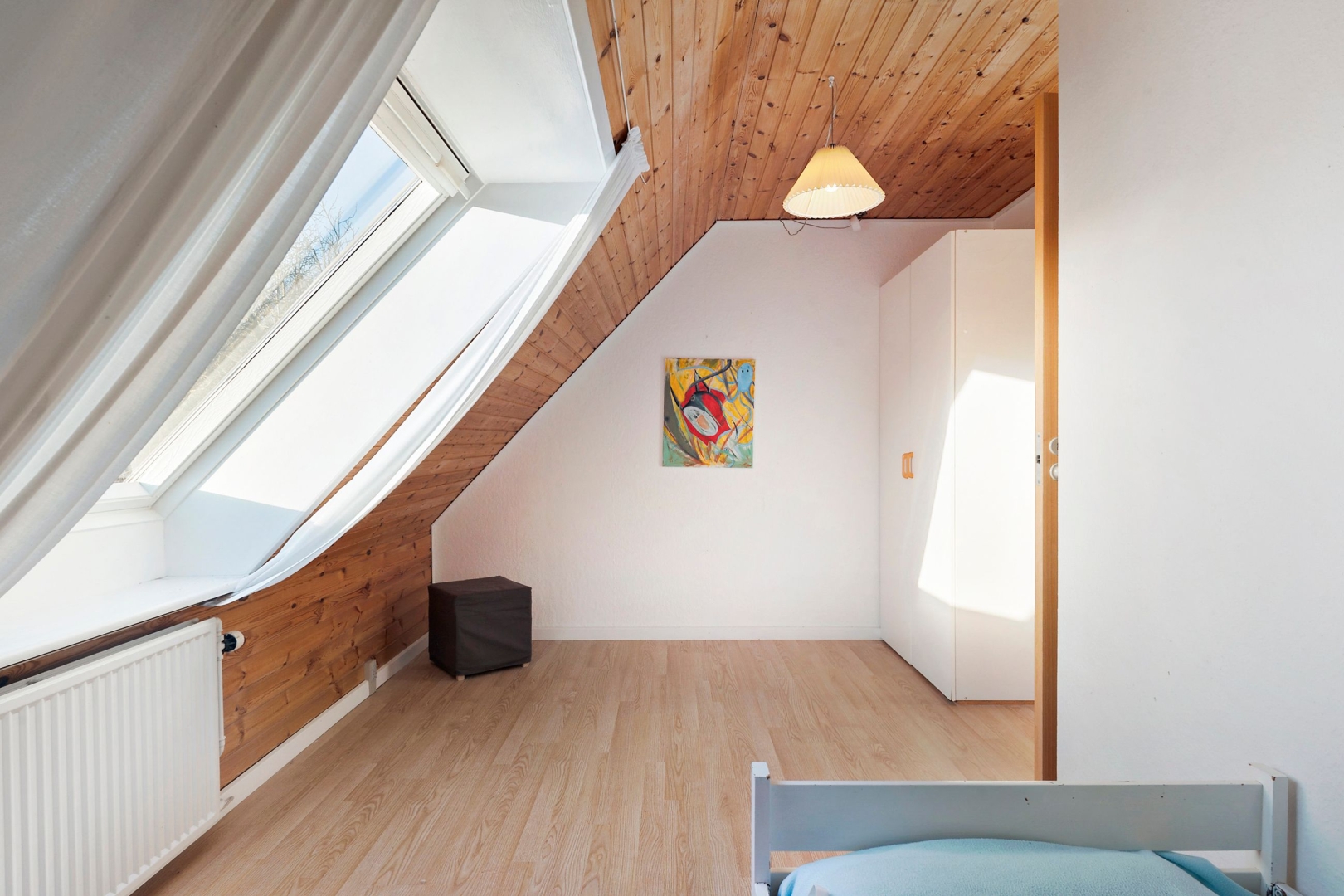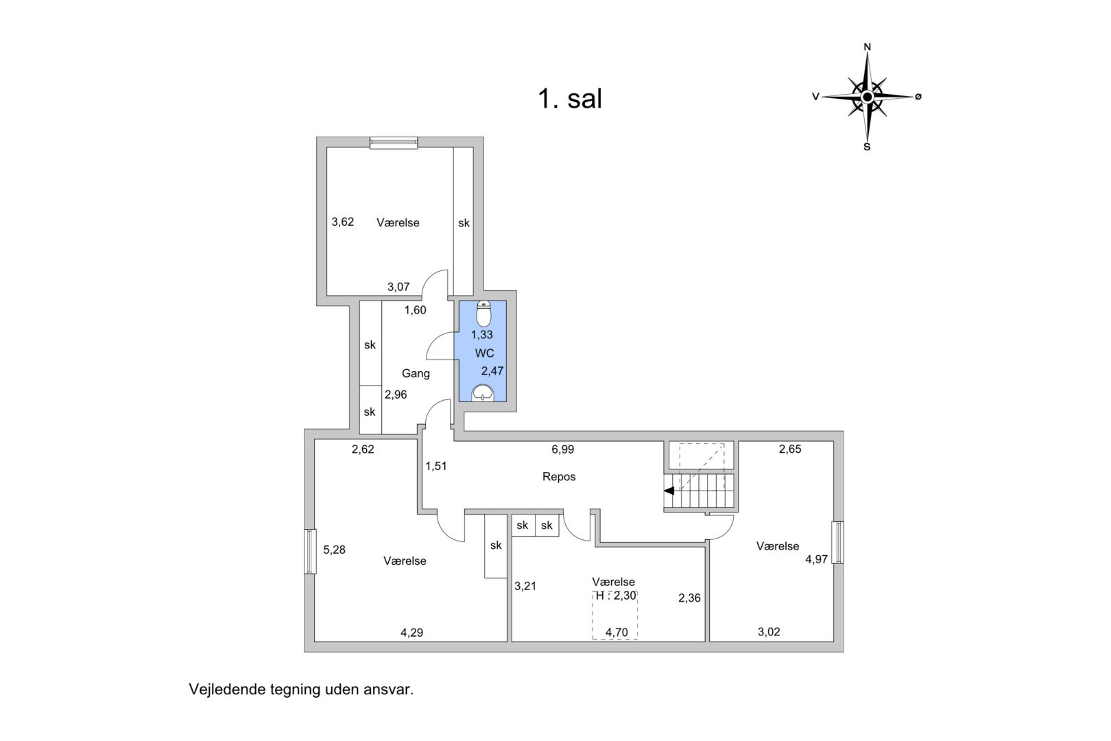 1. sal indeholder: Soveværelse - 3 gode børneværelser - Mellemgang med skabe - Toilet - Repos med tagvindue