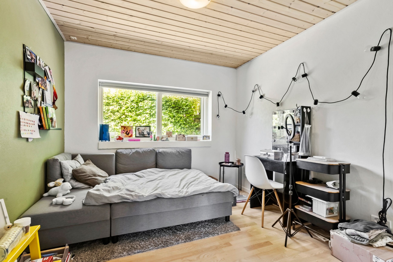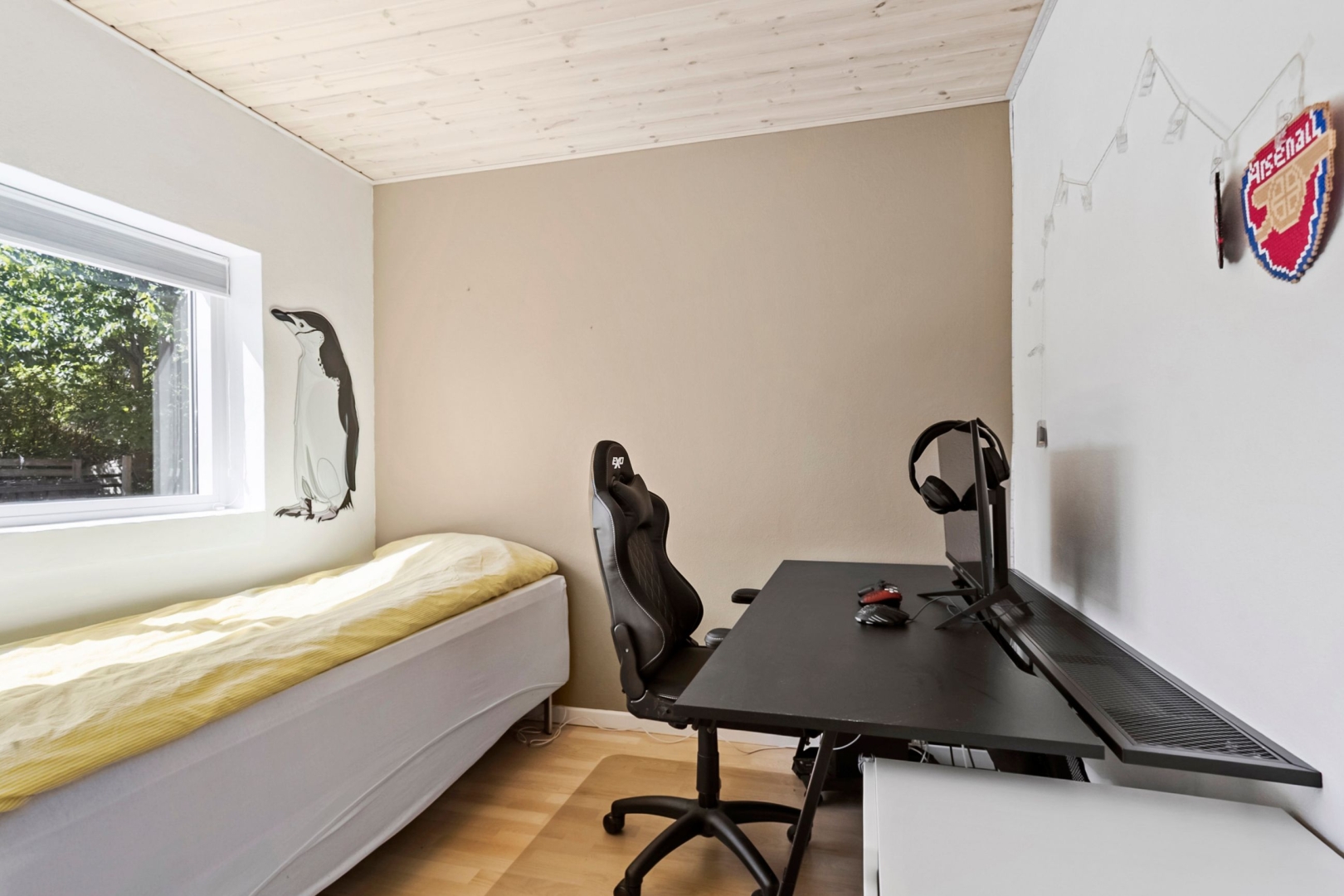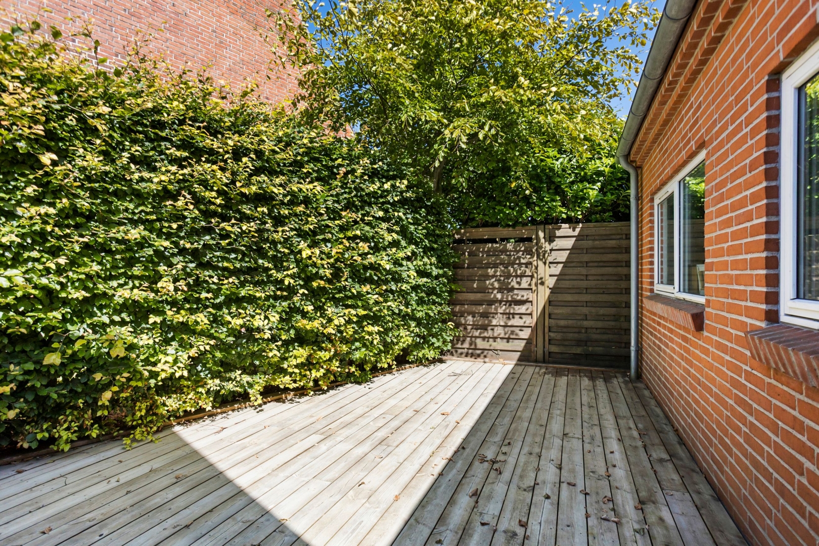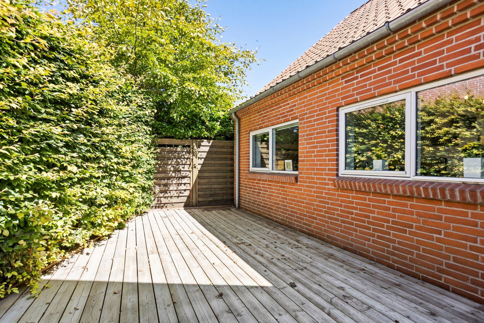 Grunden er overskuelig med sine 273 kvadratmeter, og haven kræver derfor kun et minimum af arbejde. I stedet kan I nyde udelivet på den sydvendte, ugenerede fliseterrasse eller slappe af i skyggen på den træbelagte terrasse mod nord.