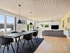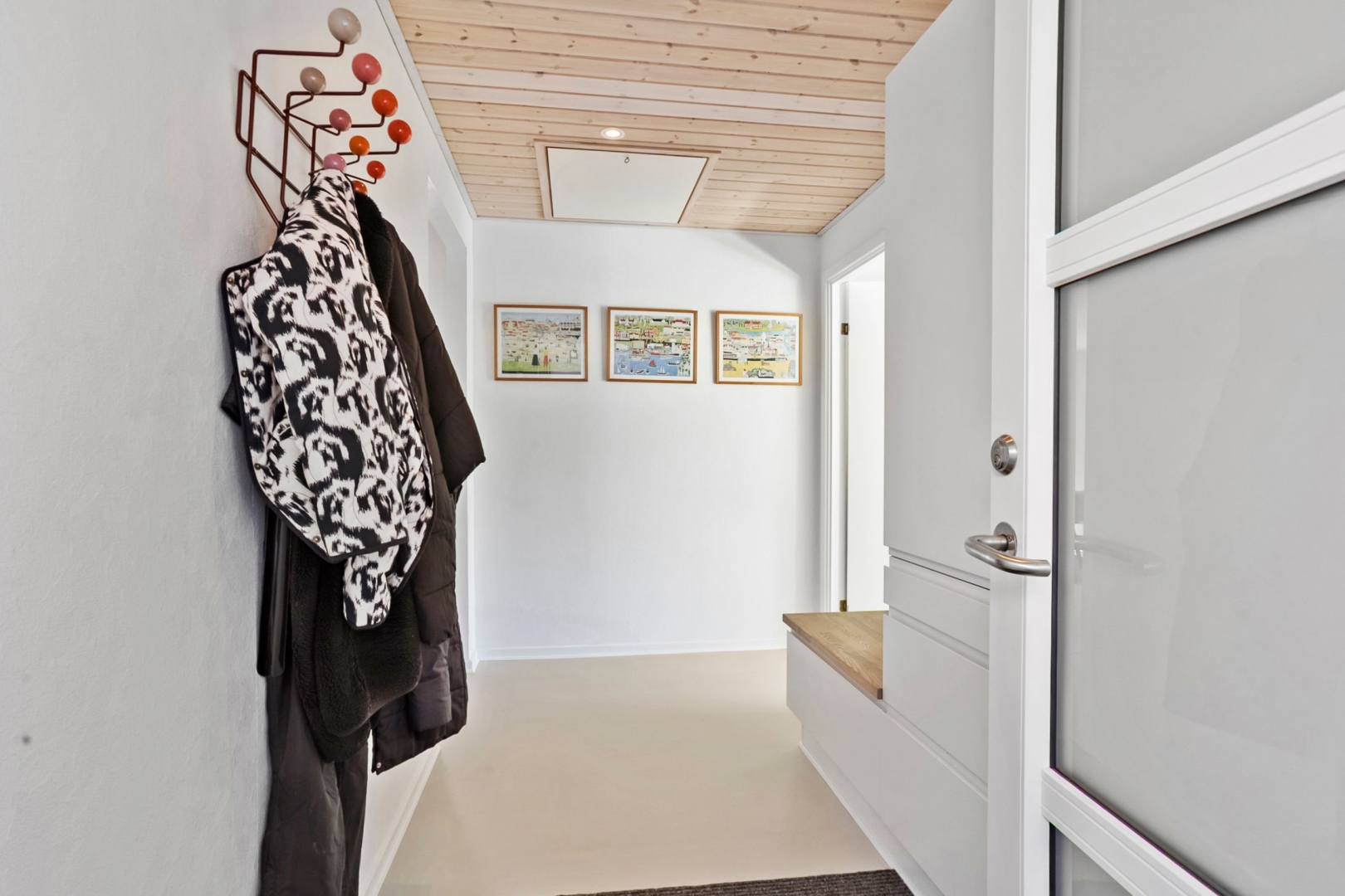 Indvendigt byder boligen på en praktisk entré med adgang direkte fra carporten. Her er der indbyggede skabe, epoxybelægning og spots i loftet. Et lyst børneværelse med skydedørsskabe og trægulv. Designa køkkenet er fra 2020 og fremstår moderne med epoxy gulv og åben forbindelse til opholdsstuen. I stuen er der trægulv, god plads til spisebordet og direkte udgang til den sydvendte terrasse. Soveværelset har ligeledes skydedørsskabe og trægulv, og badeværelset er indrettet med bruseniche, klinkegulv med gulvvarme samt plads til vaskesøjle.