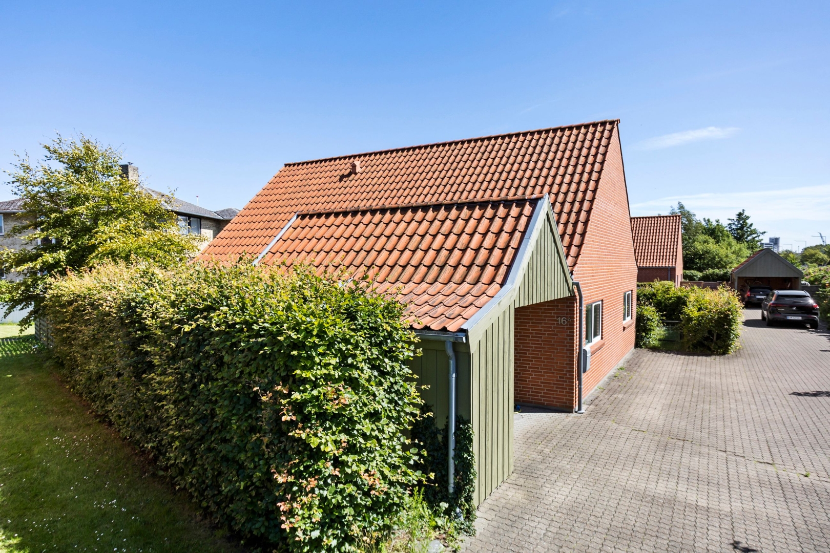 Ejendommen fremstår både solid og vedligeholdelsesvenlig med murede gavle og uden udhæng og med de store træ/aluvinduer fra 2021 i stuen, hvilket minimerer behovet for udvendig vedligeholdelse. Det klassiske røde tegltag bidrager til et charmerende og tidløst udtryk.