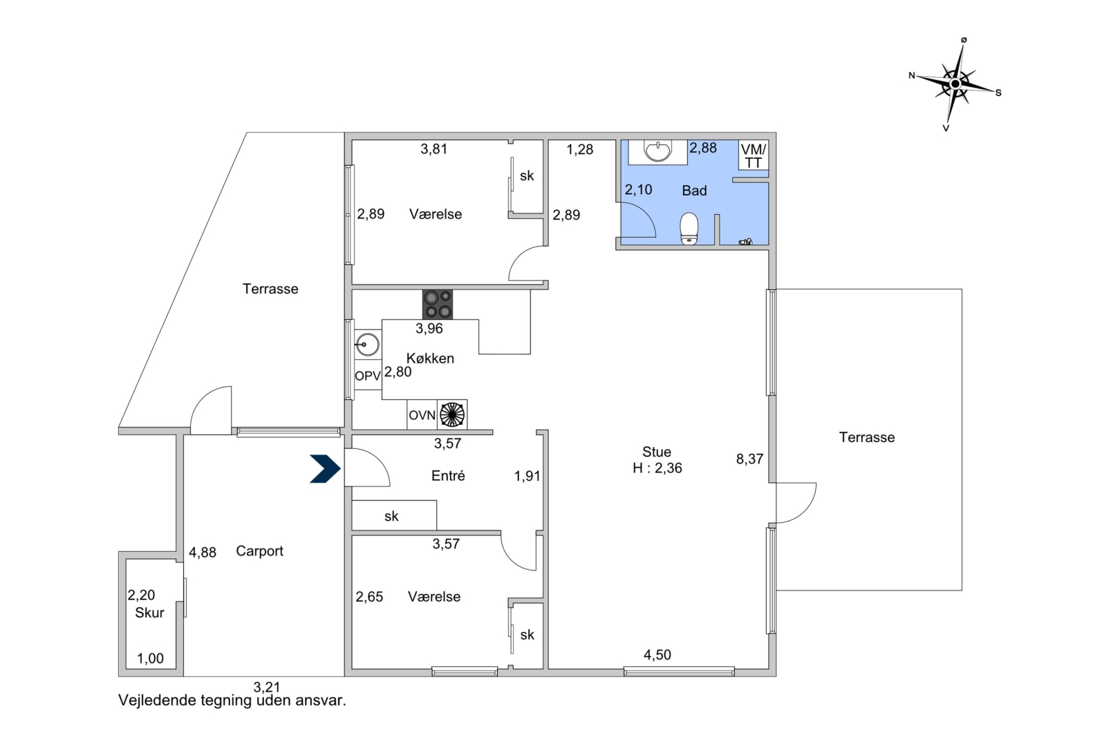 Boligen har et veludnyttet boligareal på 100 kvadratmeter og en carportbygning med tegltag på 21 kvadratmeter, hvoraf 3 kvadratmeter udgør et praktisk, integreret udhus.