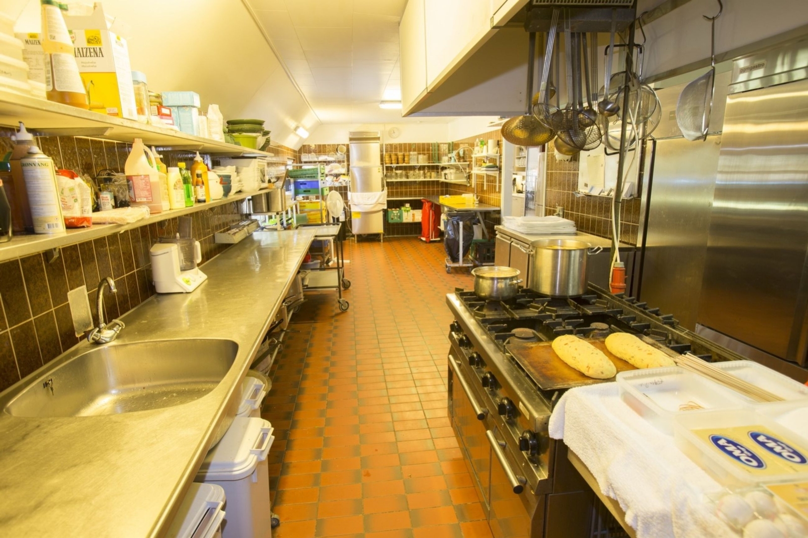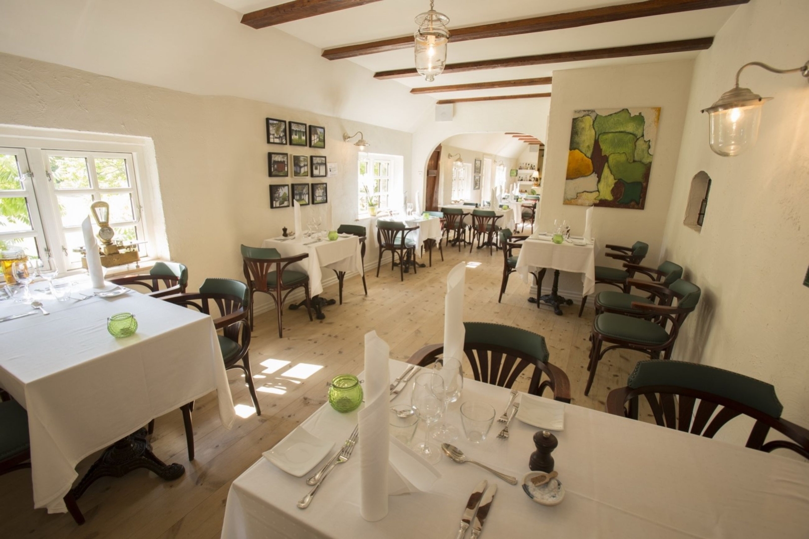 Hovedhuset indeholder endv. Forstue med garderobe, kundetoilet, aftenrestaurant med plads til 40 siddende gæster, ludet trægulve, og udgang til træbelagte terrasser, anretter køkken, vinlager og fint funktionsdygtig og restaurationskøkken.