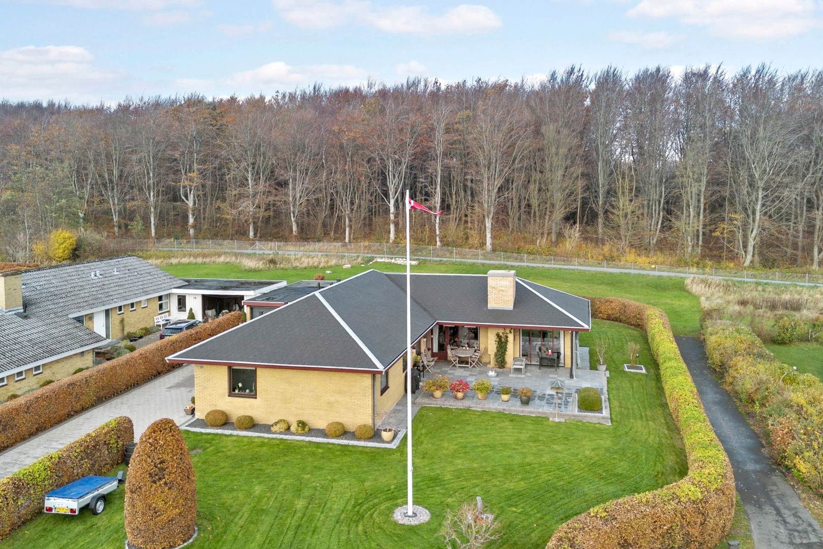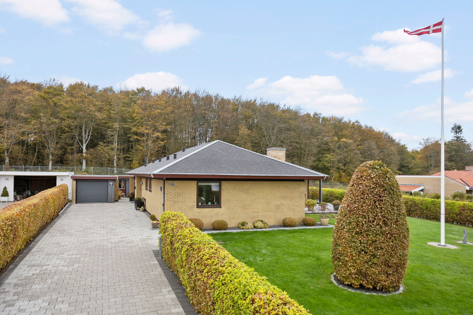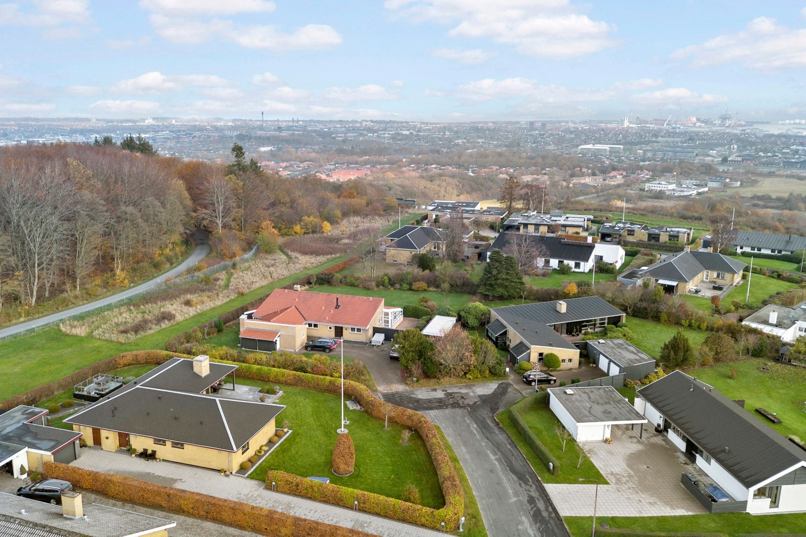 I det rolige og højtbeliggende Kilden-område, på en blind villavej, udbydes nu denne velholdte villa på 180 m² med valmet tag, som siden opførelsen i 1976 har været i samme ejers varetægt. Den flisebelagte indkørsel fører fra Capellavej op til den murede garage med elhejseport samt to isolerede udhuse, hvoraf det ene er muret.