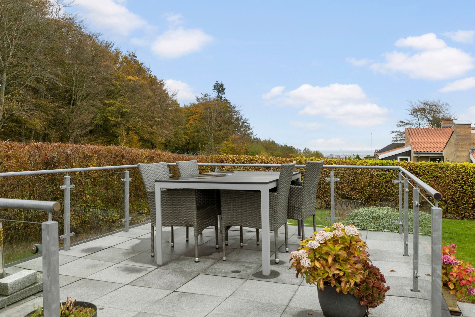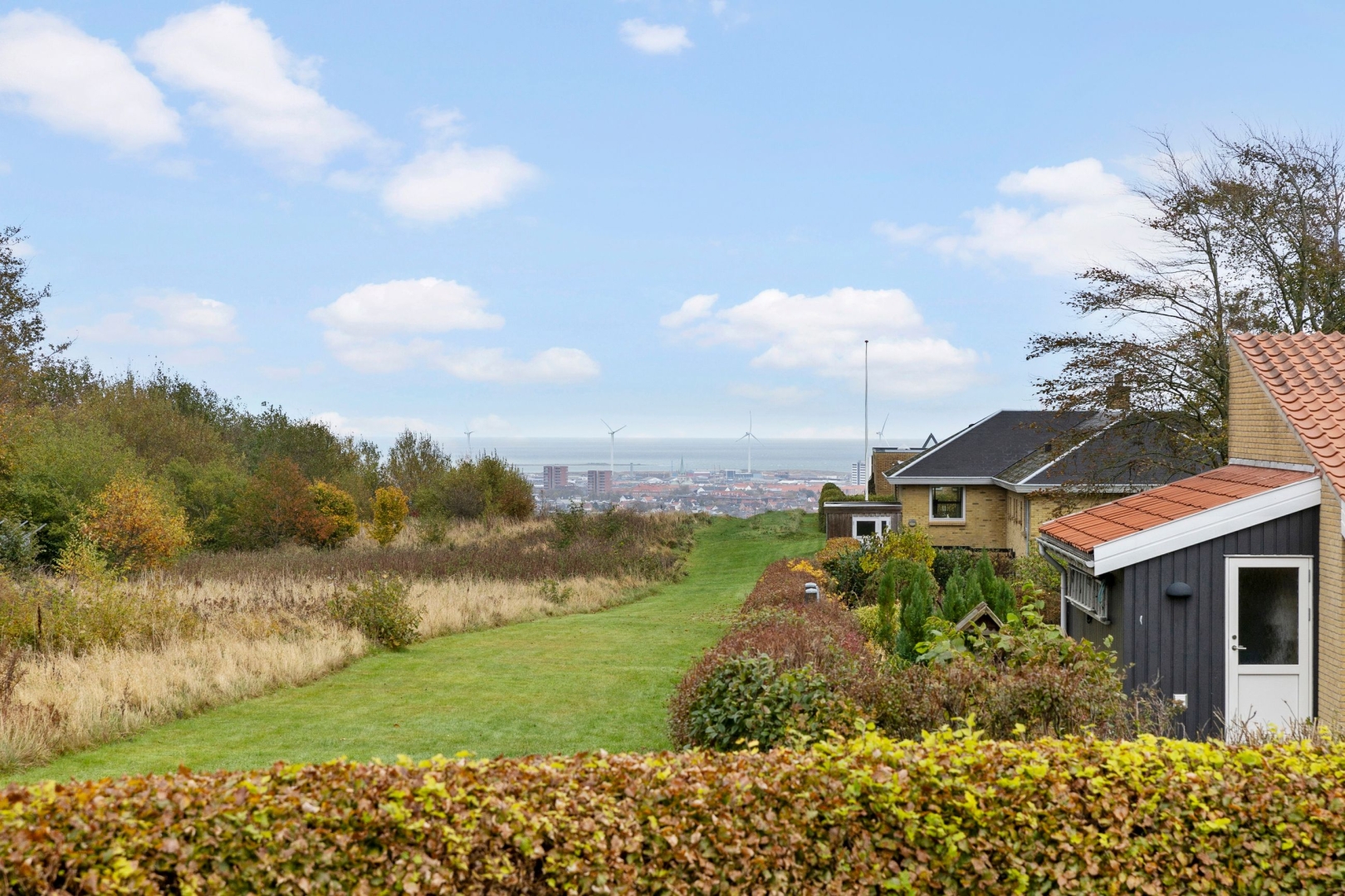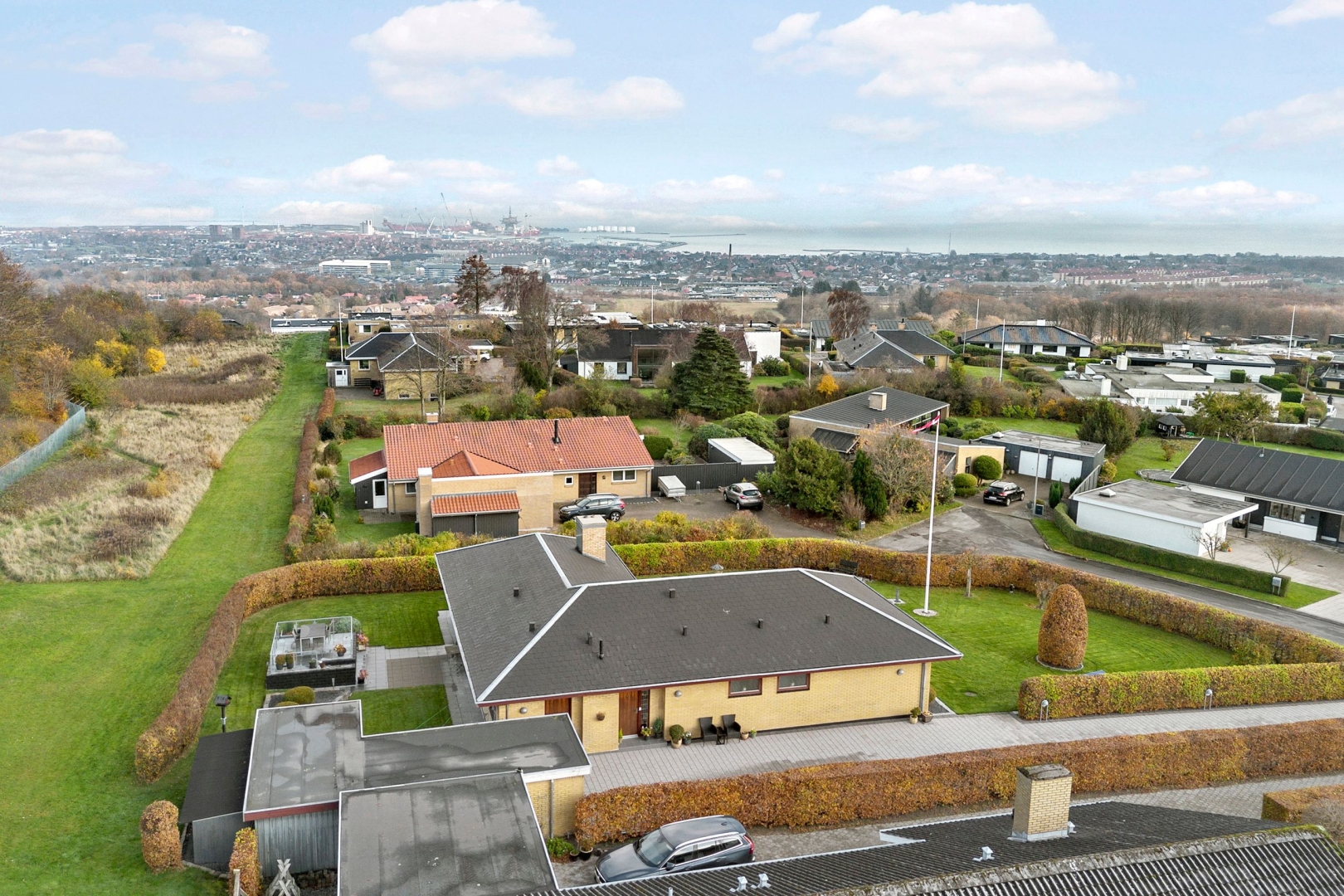 Ejendommen ligger på en skøn grund på 1.105 m², der trods sin størrelse er nem at holde, da den primært er anlagt med græs, flisebelagte terrasse- og indkørselsarealer samt enkelte fritstående træer og højbede. Her er der rig mulighed for at nyde fritiden på den rummelige sydvendte terrasse eller på den hævede nordvendte udsigtsterrasse, hvor man i horisonten kan nyde både vandet, havnen og byen. Begge terrasser er belagt med flotte granitfliser, som giver et eksklusivt og tidløst udtryk.