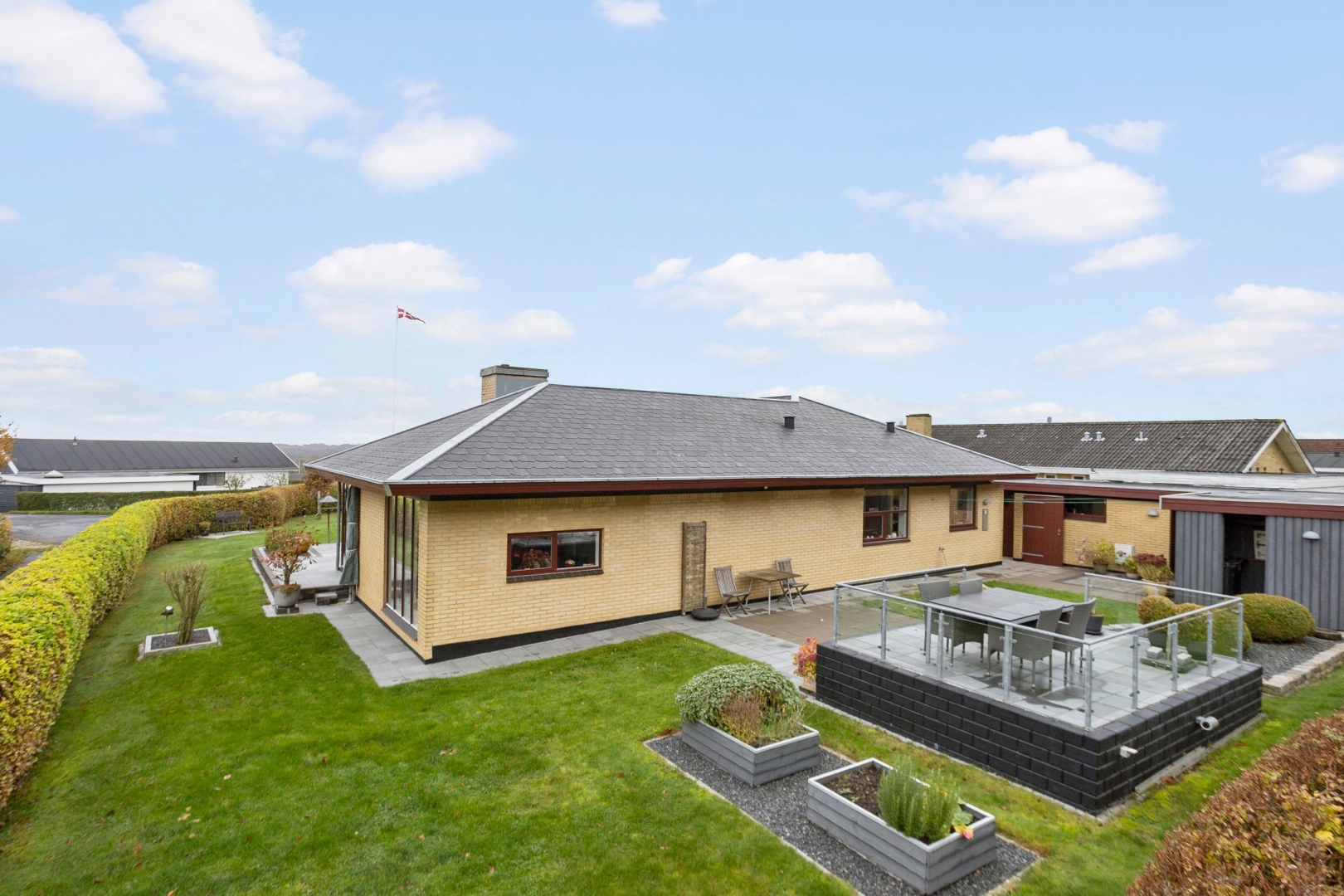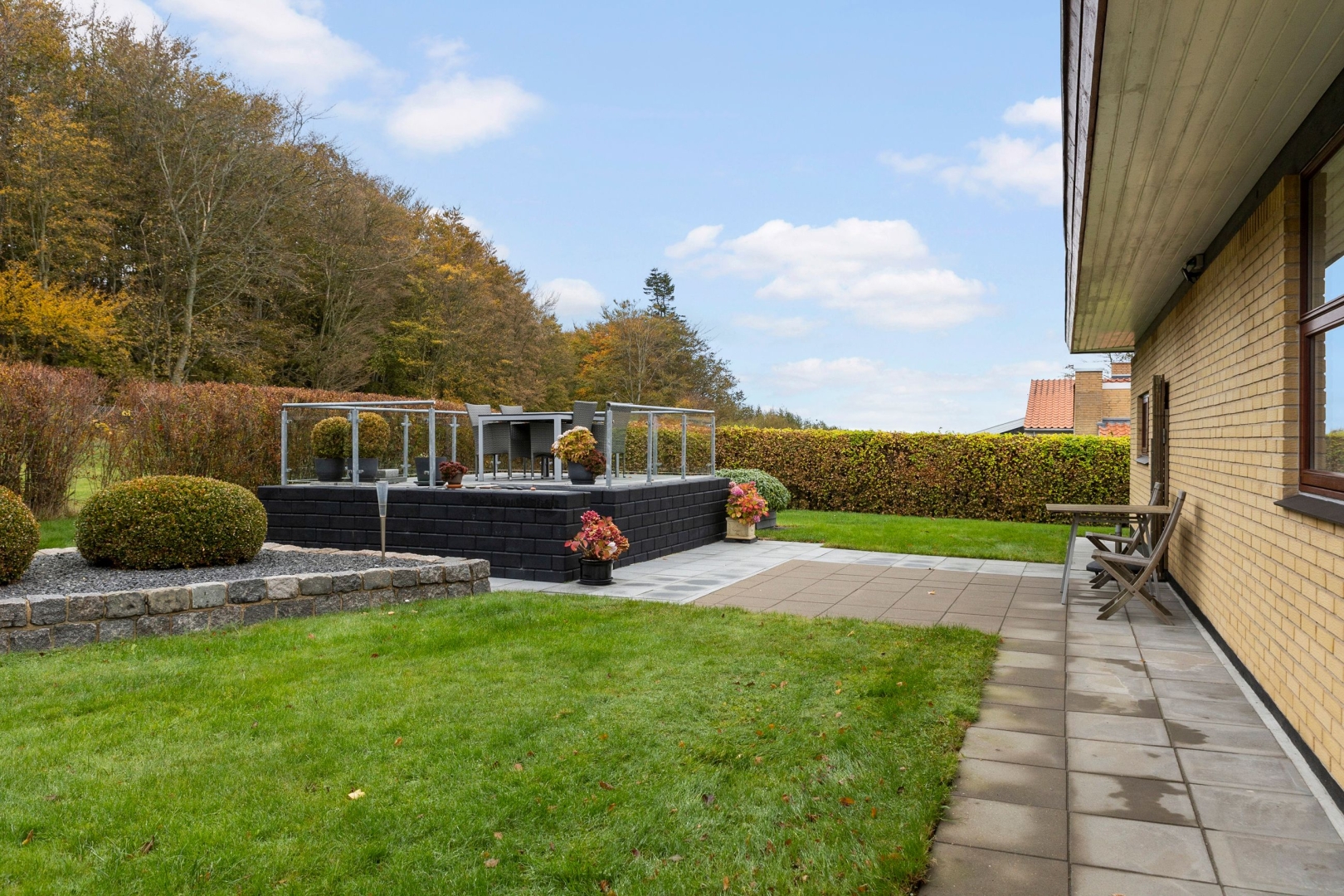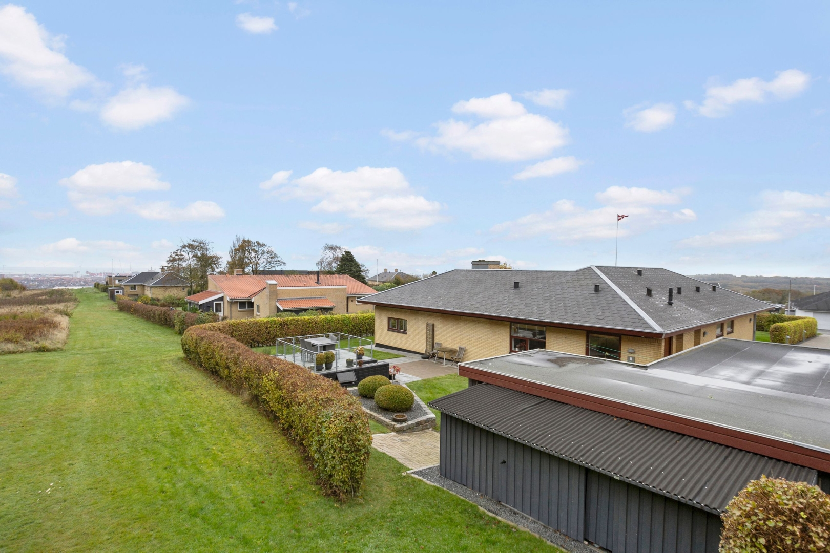 Ejendommen ligger på en skøn grund på 1.105 m², der trods sin størrelse er nem at holde, da den primært er anlagt med græs, flisebelagte terrasse- og indkørselsarealer samt enkelte fritstående træer og højbede. Her er der rig mulighed for at nyde fritiden på den rummelige sydvendte terrasse eller på den hævede nordvendte udsigtsterrasse, hvor man i horisonten kan nyde både vandet, havnen og byen. Begge terrasser er belagt med flotte granitfliser, som giver et eksklusivt og tidløst udtryk.