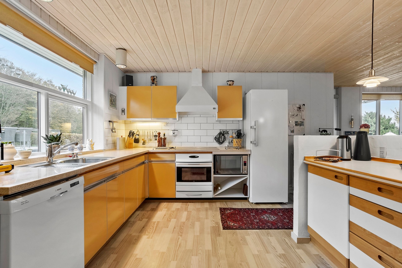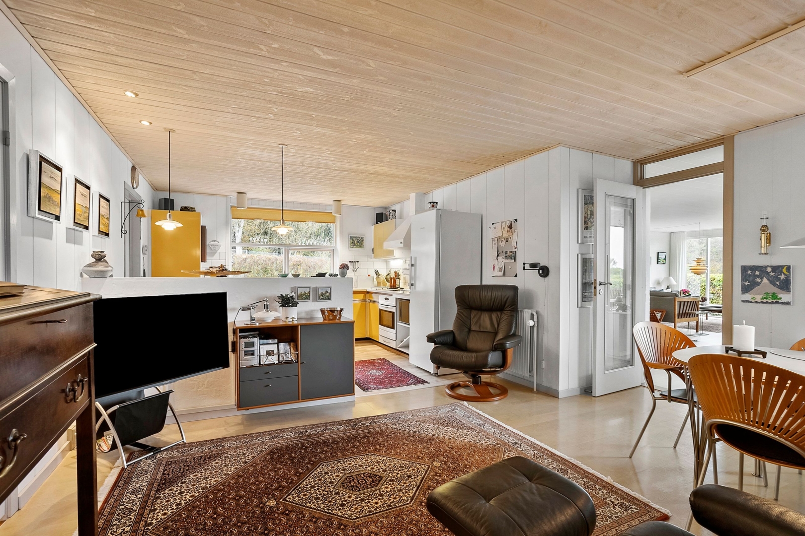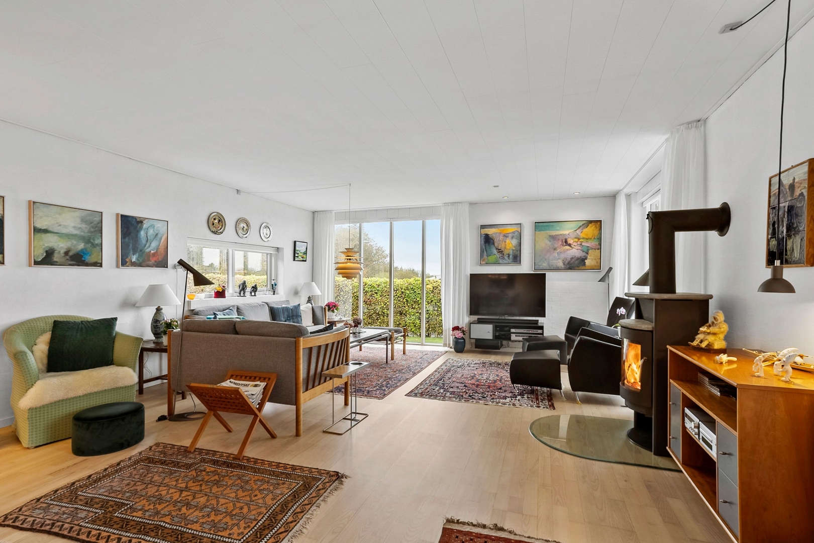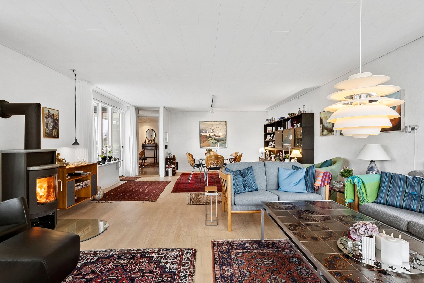 Villaen er løbende blevet vedligeholdt af sælger og byder på et køkken-alrum med glasdør til opholdsstuen og en halvmur, der elegant adskiller køkkenet fra alrummet. Opholdsstuen fremstår lys og indbydende med Rais brændeovn, gulvvarme, trægulv, et østvendt og et sydvendt gulv-til-loft vinduesparti samt endnu et vinduesparti med udgang til den store sydvendte og delvist overdækkede terrasse med åben pejs. Herudover rummer boligen et stort børneværelse, som tidligere har været opdelt i to og nemt kan opdeles igen, et godt soveværelse med faste skabe og trægulv samt endnu et børneværelse med trægulv og skabe.Herudover et rummeligt badeværelse med dobbelt håndvask, badekar, bruseniche, adgang til sauna/opbevaringsrum samt klinkegulv med gulvvarme. Derudover er der et flot gæstebadeværelse med bruseniche og klinkegulv med gulvvarme. Boligen rummer desuden et praktisk bryggers med klinkegulv og gulvvarme, bordplads samt plads til vaskemaskine og tørretumbler. Planløsningen fuldendes af en fordelingsgang og en indbydende entré med klinkegulv og gulvvarme.