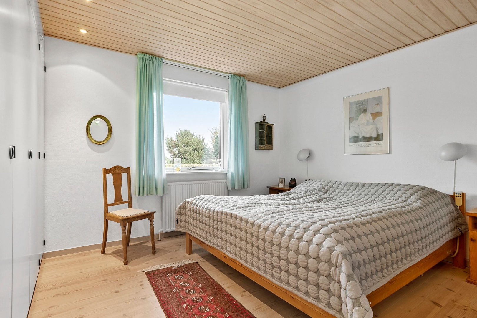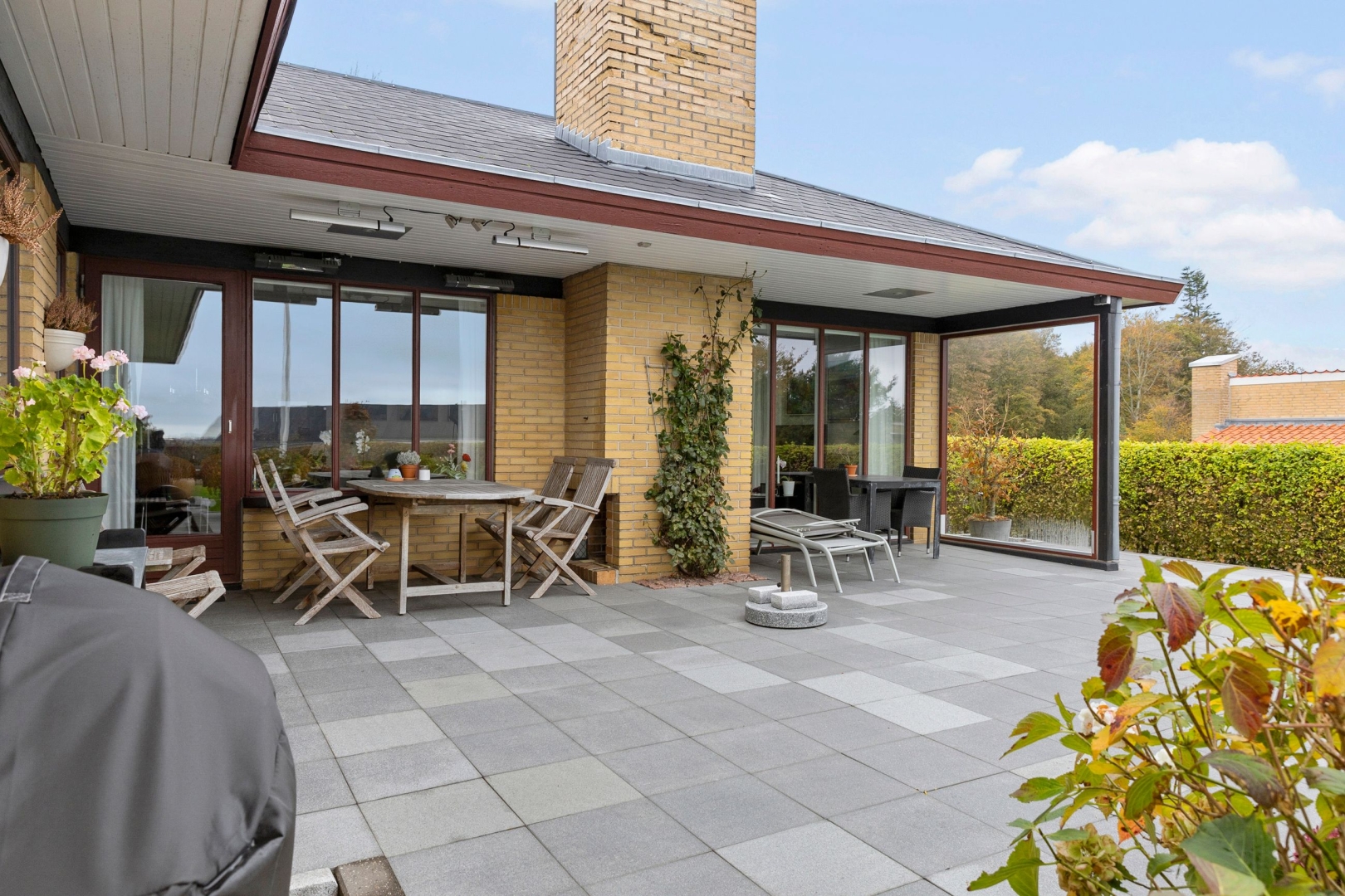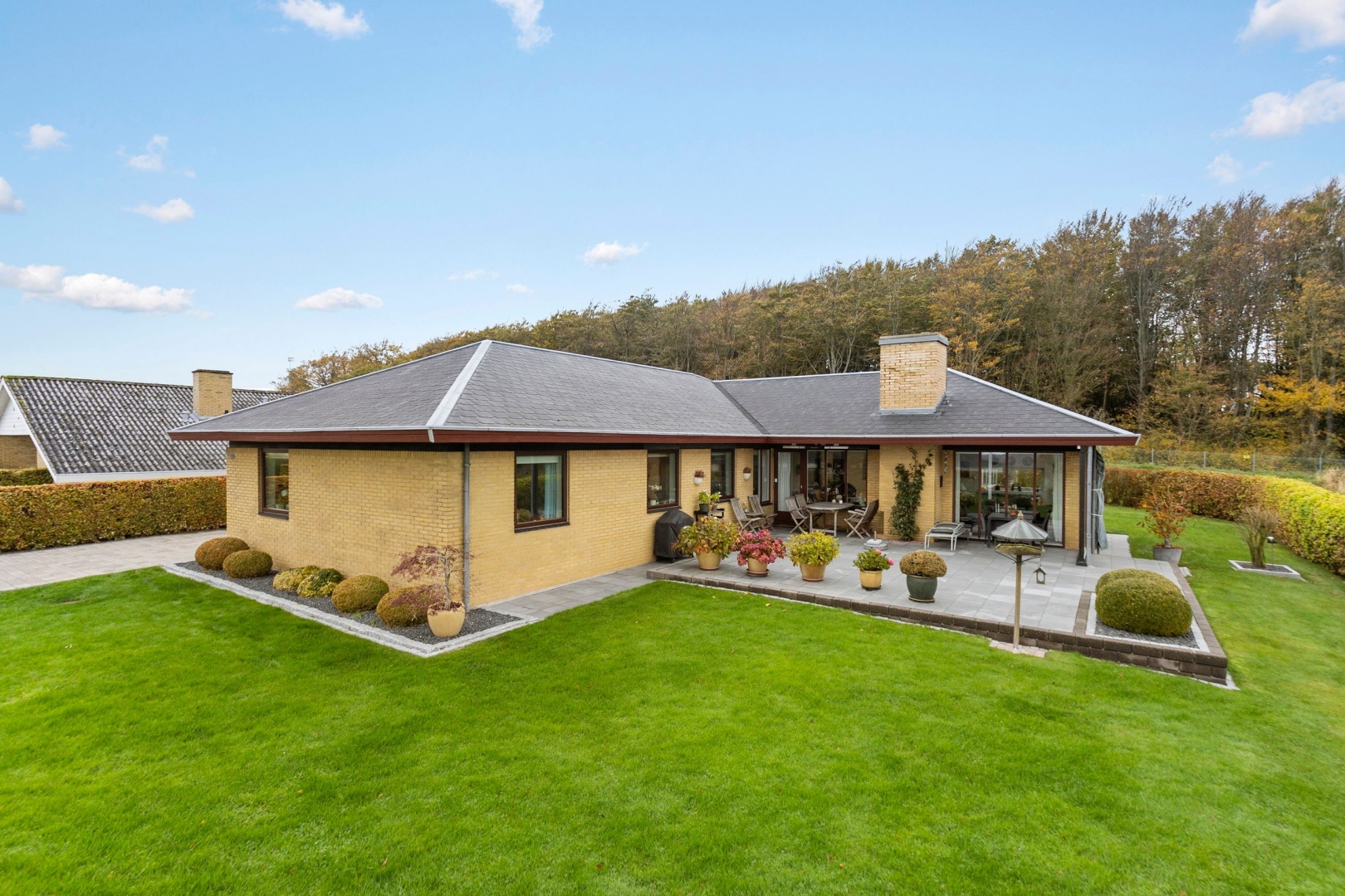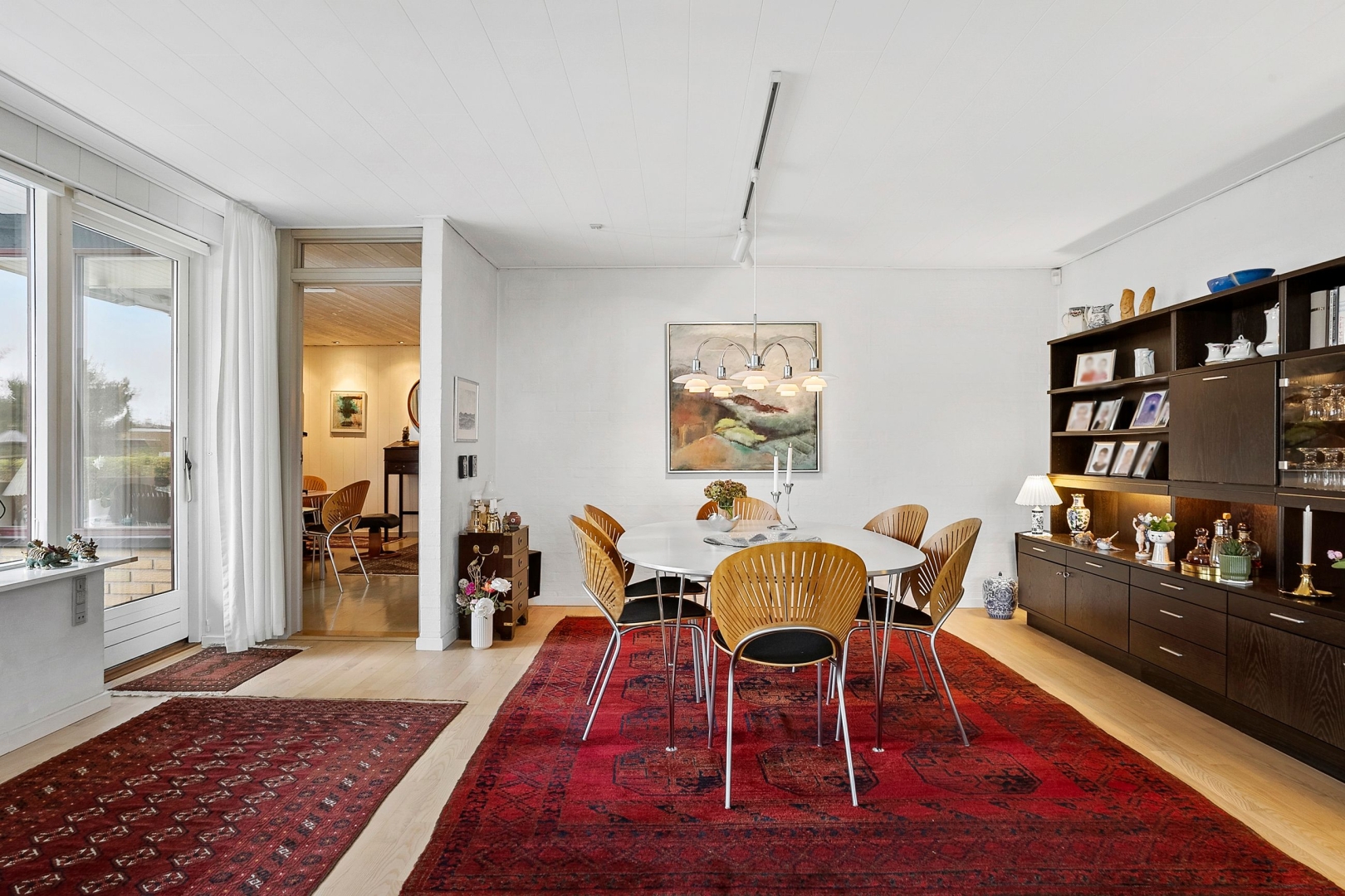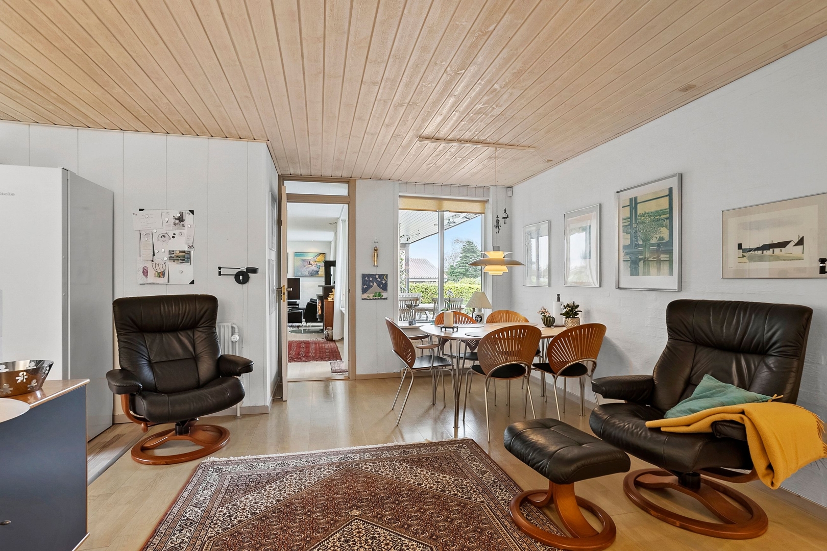 Villaen er løbende blevet vedligeholdt af sælger og byder på et køkken-alrum med glasdør til opholdsstuen og en halvmur, der elegant adskiller køkkenet fra alrummet. Opholdsstuen fremstår lys og indbydende med Rais brændeovn, gulvvarme, trægulv, et østvendt og et sydvendt gulv-til-loft vinduesparti samt endnu et vinduesparti med udgang til den store sydvendte og delvist overdækkede terrasse med åben pejs. Herudover rummer boligen et stort børneværelse, som tidligere har været opdelt i to og nemt kan opdeles igen, et godt soveværelse med faste skabe og trægulv samt endnu et børneværelse med trægulv og skabe.Herudover et rummeligt badeværelse med dobbelt håndvask, badekar, bruseniche, adgang til sauna/opbevaringsrum samt klinkegulv med gulvvarme. Derudover er der et flot gæstebadeværelse med bruseniche og klinkegulv med gulvvarme. Boligen rummer desuden et praktisk bryggers med klinkegulv og gulvvarme, bordplads samt plads til vaskemaskine og tørretumbler. Planløsningen fuldendes af en fordelingsgang og en indbydende entré med klinkegulv og gulvvarme.