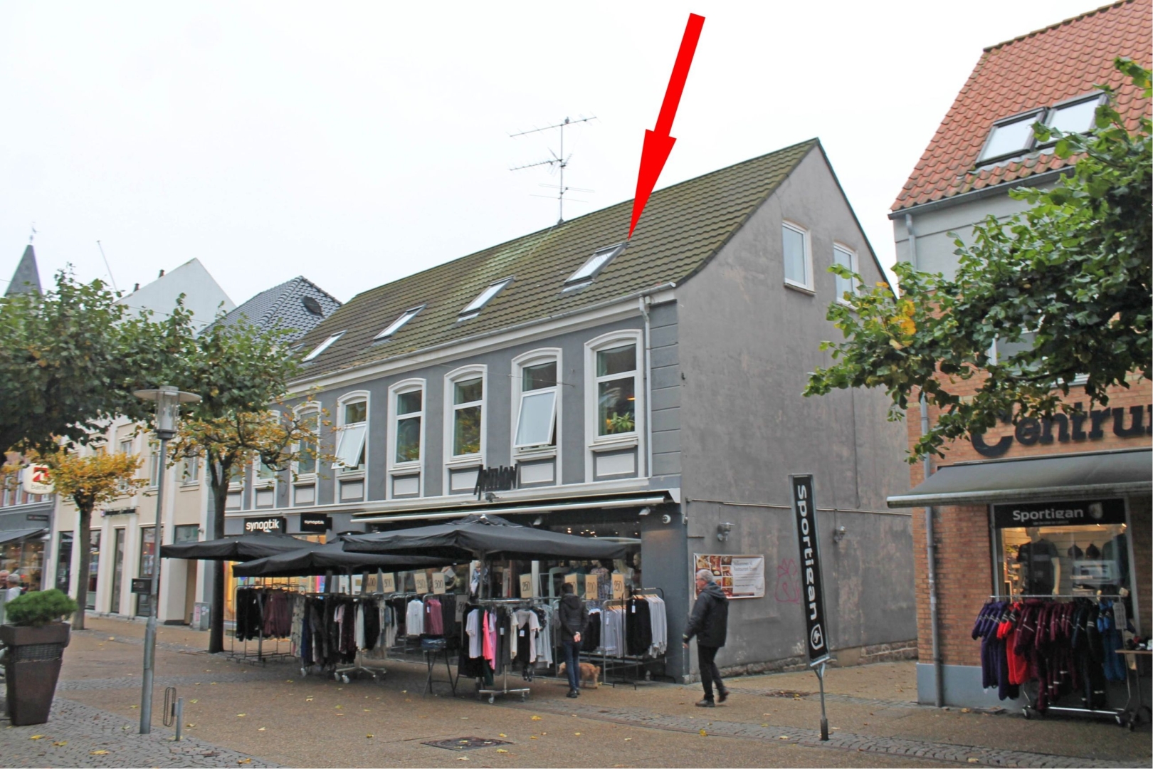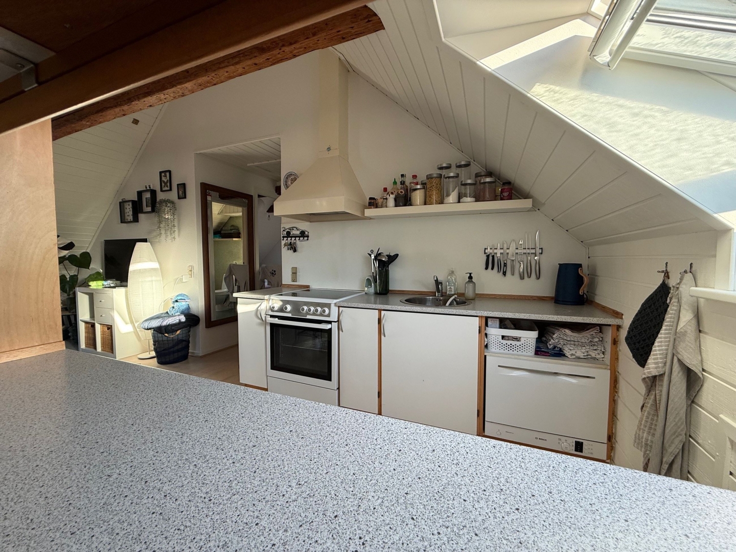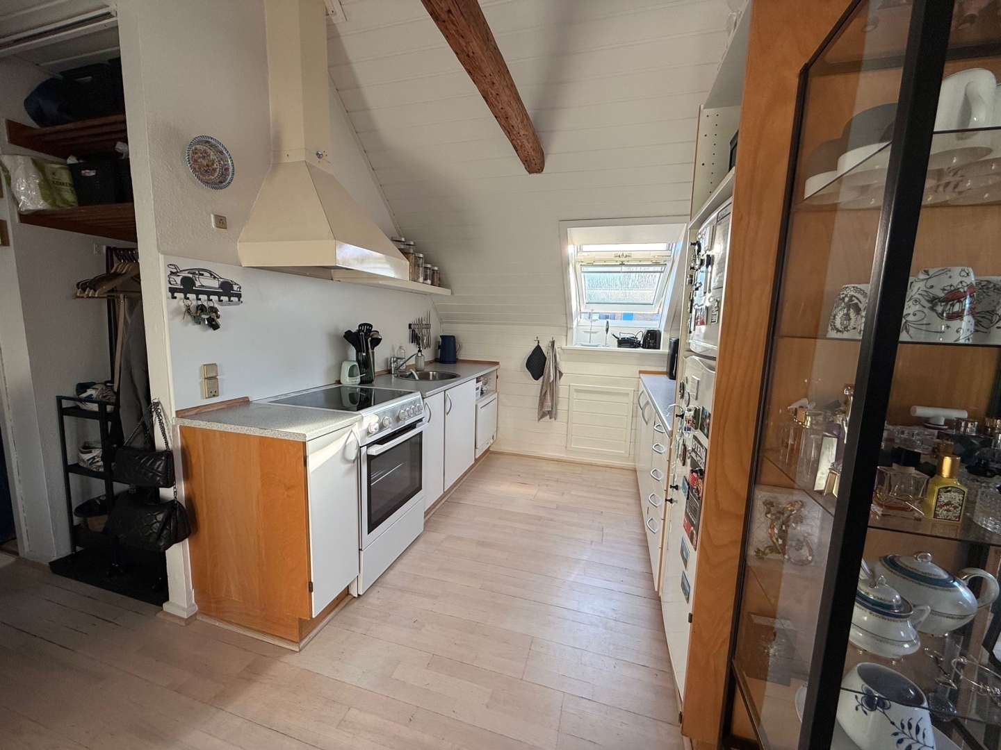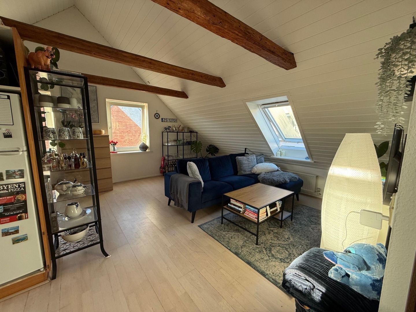Lejligheden indeholder: Fælles entré med 2.th lejligheden - Gang med garderobe - Mindre soveværelse med skabe - Badeværelse med bruseniche og vaskemaskine - Køkken med åben forbindelse til hyggelig vinkel stue med loft til kip.