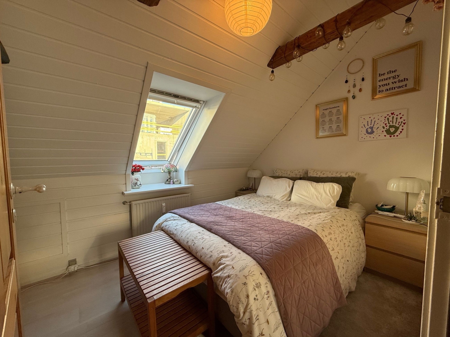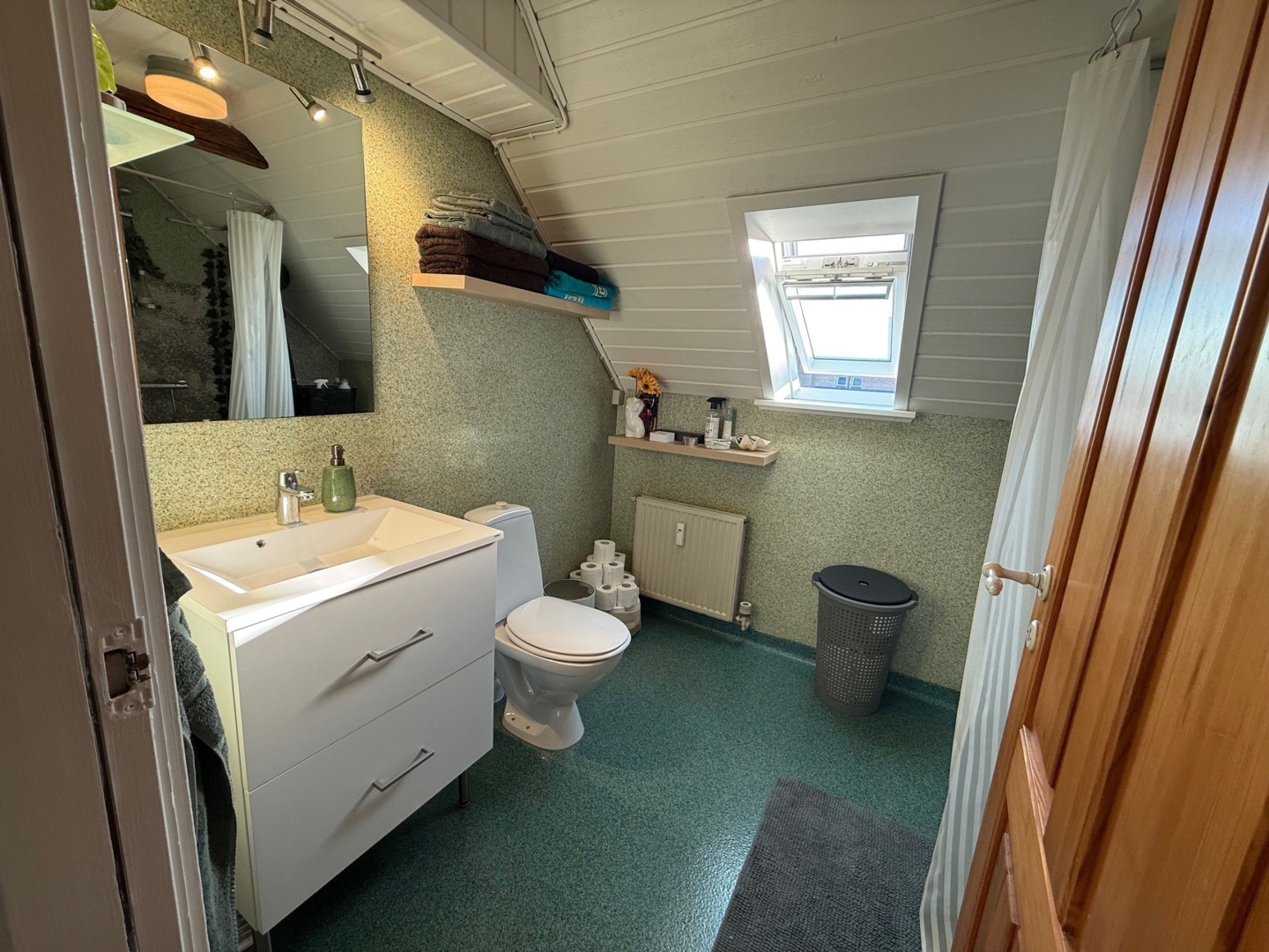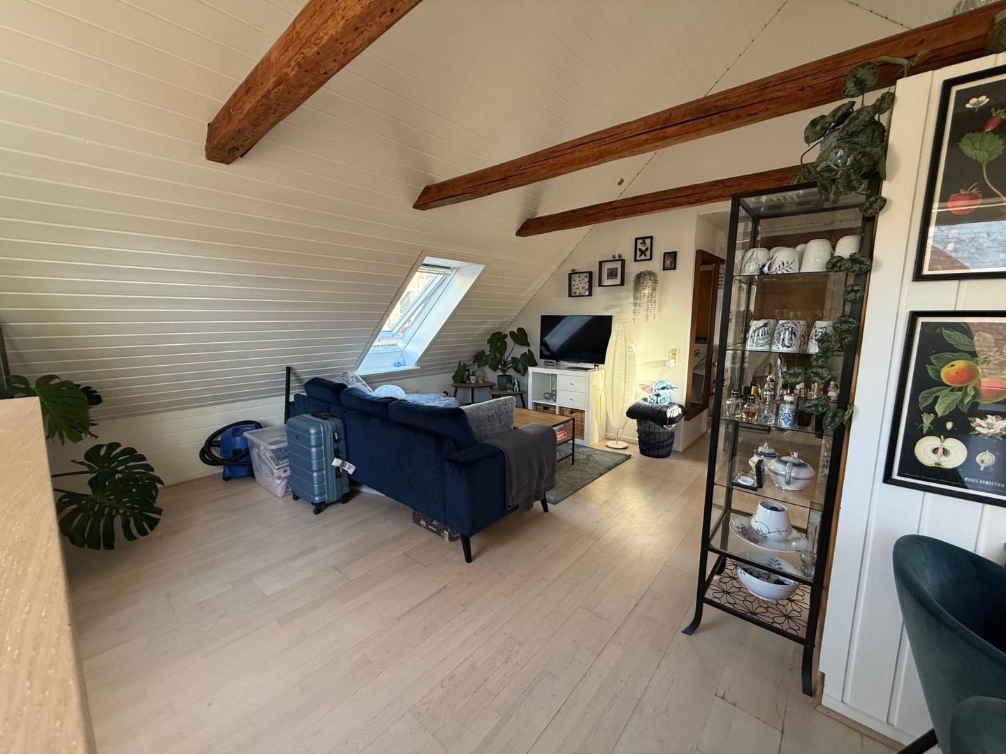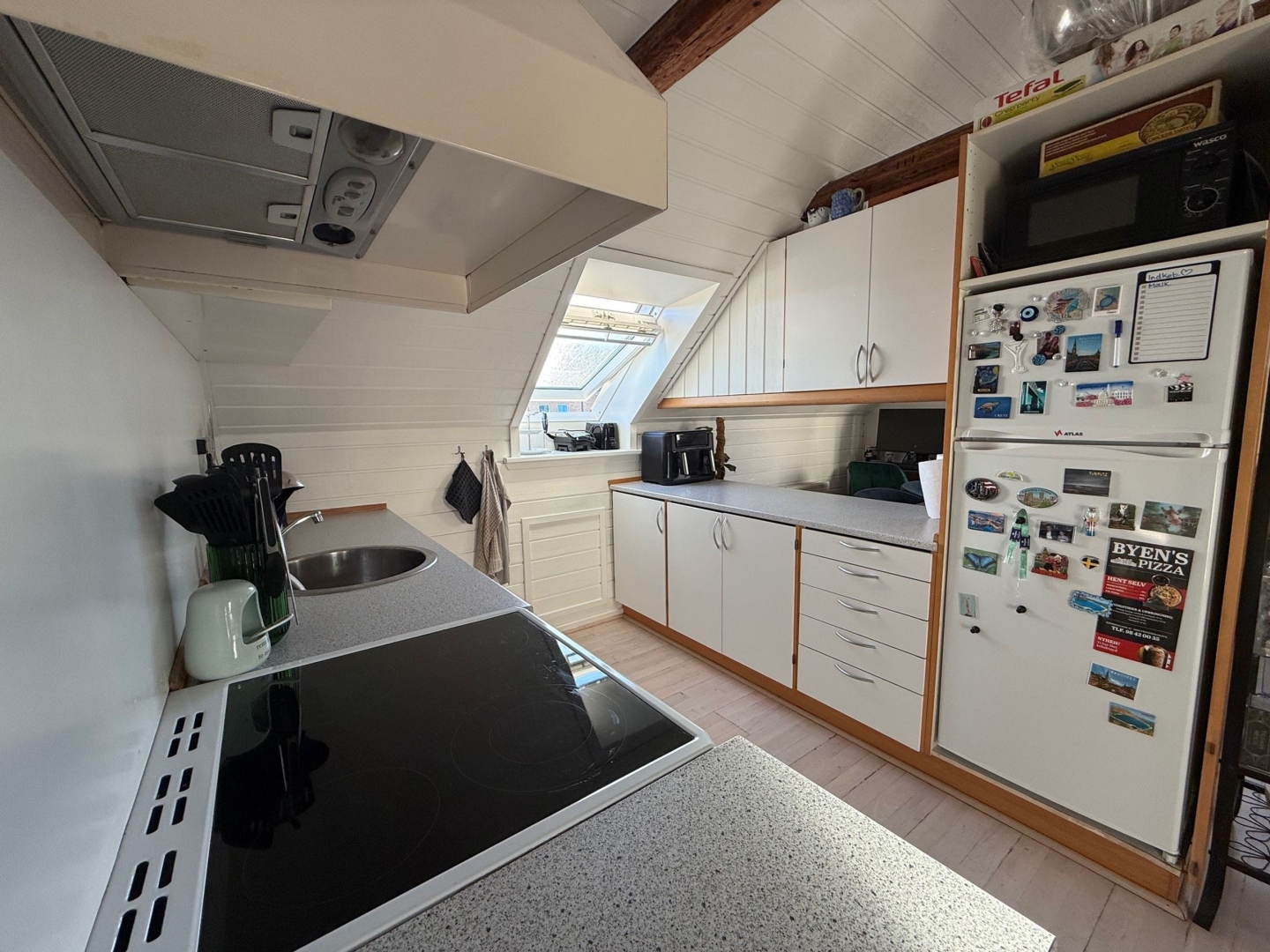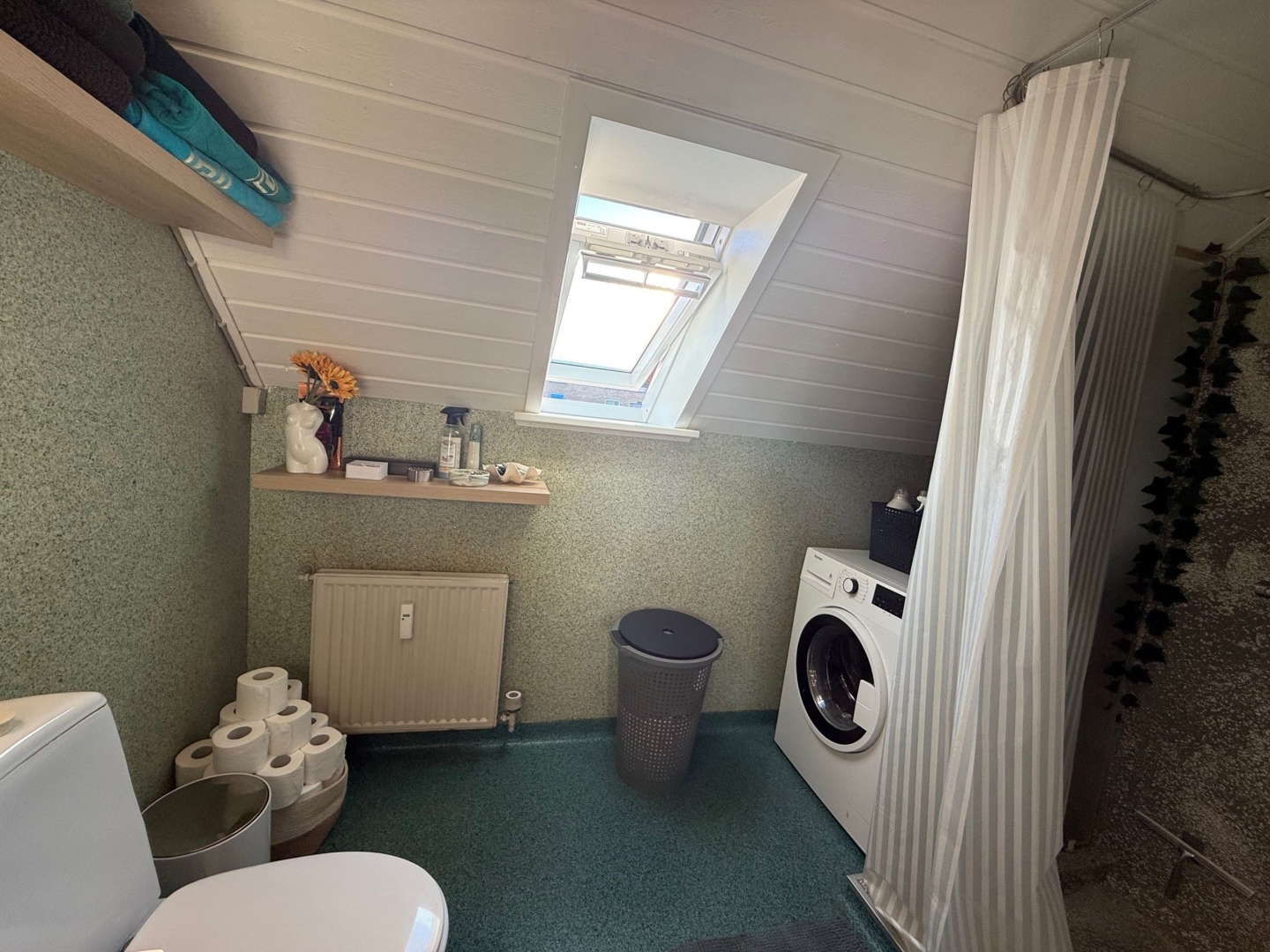 Lejligheden indeholder: Fælles entré med 2.th lejligheden - Gang med garderobe - Mindre soveværelse med skabe - Badeværelse med bruseniche og vaskemaskine - Køkken med åben forbindelse til hyggelig vinkel stue med loft til kip.