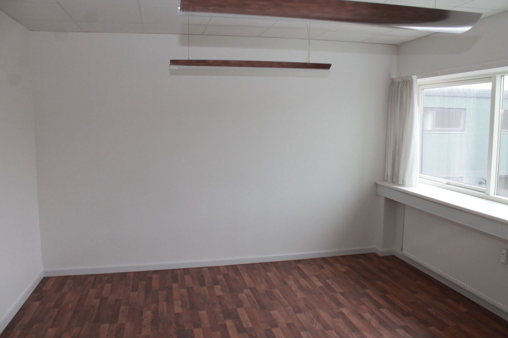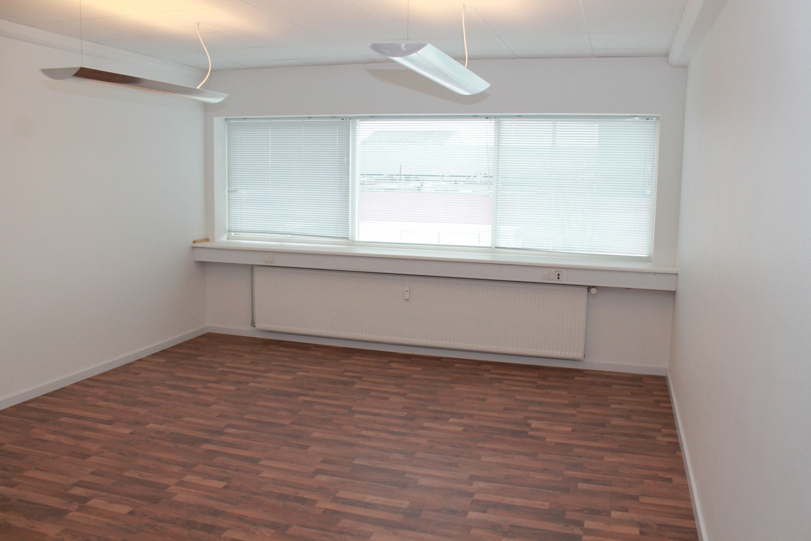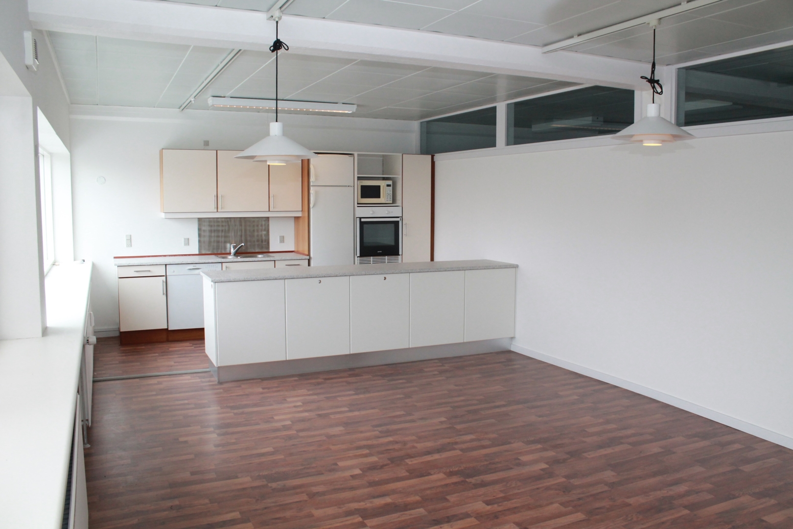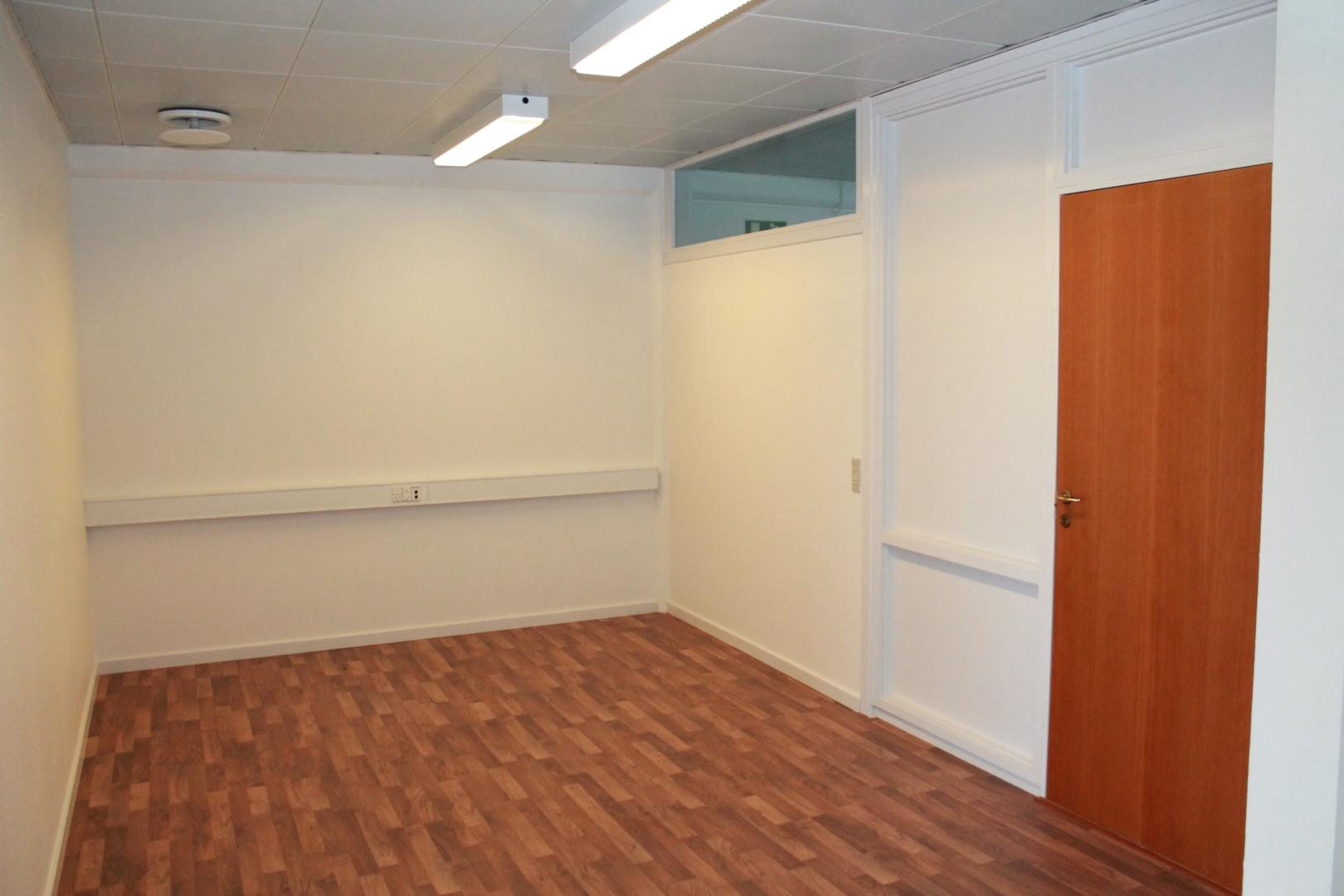 Fælles hall/gangareal - 3 kontorer med laminatgulv og fast belysning - Gang med laminatgulv - Kopirum - 2 kontorer med tæppegulvbelægning - Kantine med flot køkkenarrangement og laminatgulv - Allrum -