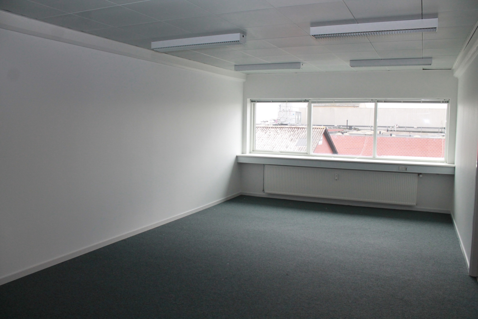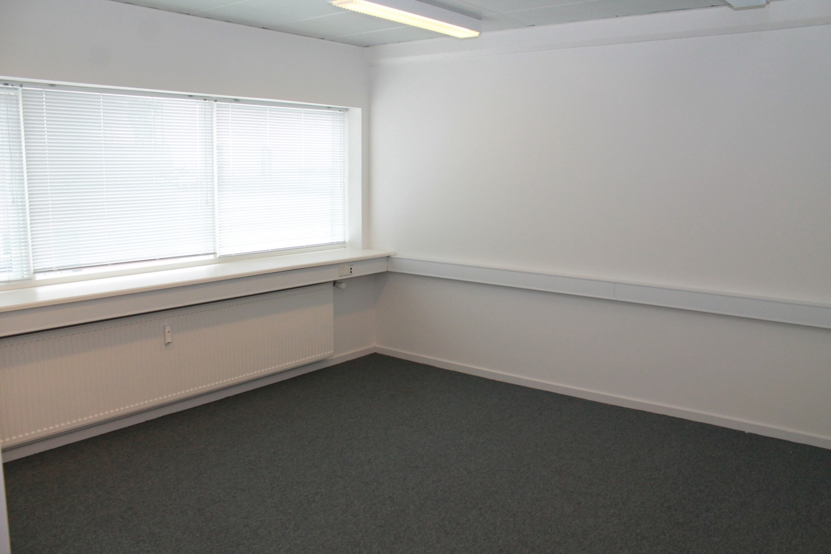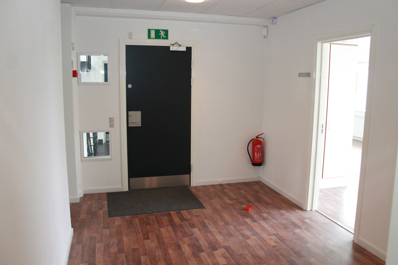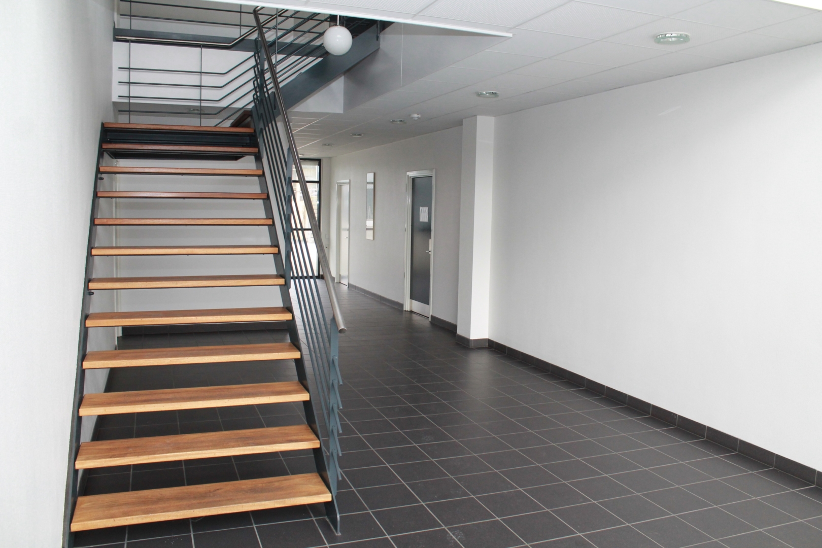 Fælles hall/gangareal - 3 kontorer med laminatgulv og fast belysning - Gang med laminatgulv - Kopirum - 2 kontorer med tæppegulvbelægning - Kantine med flot køkkenarrangement og laminatgulv - Allrum -