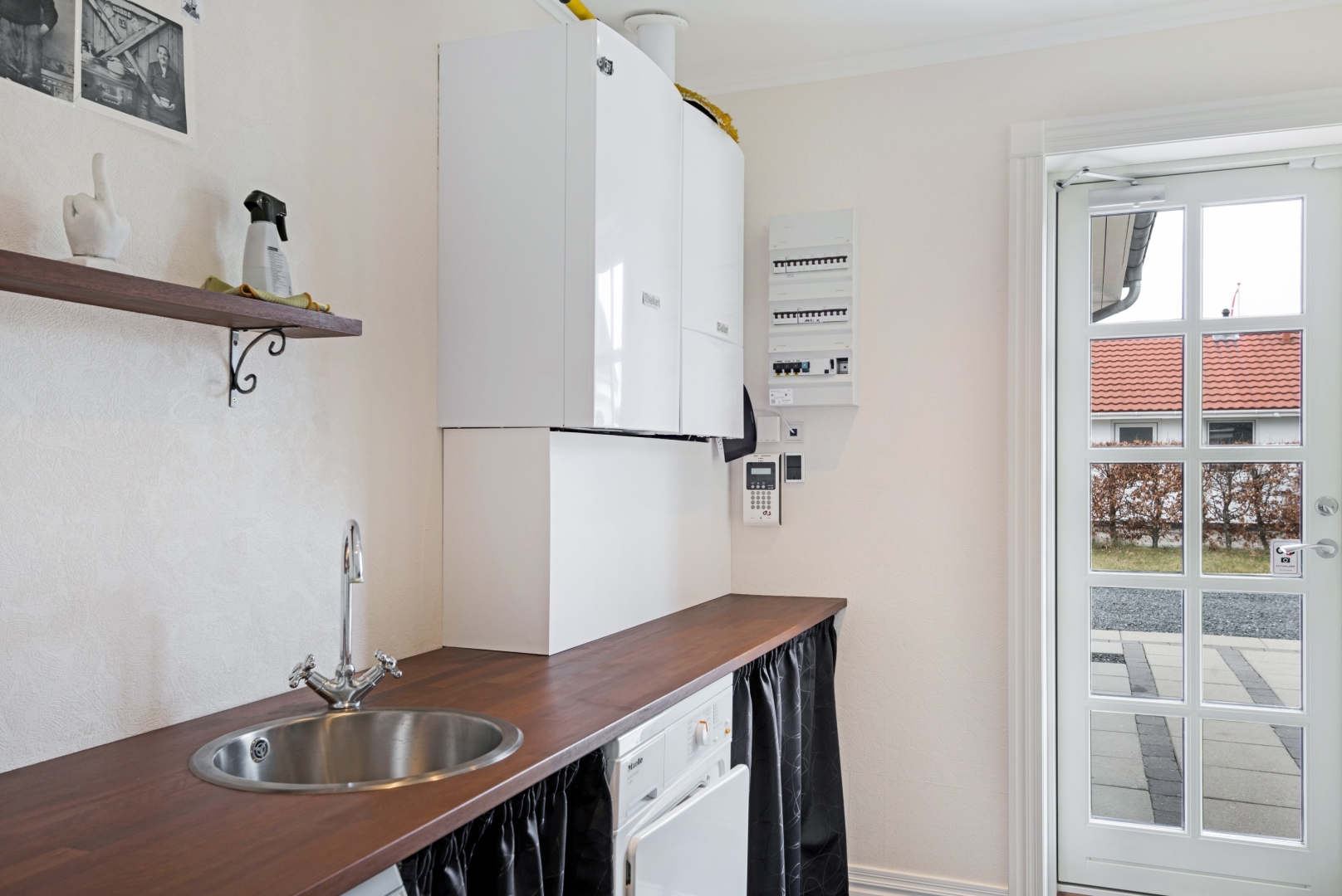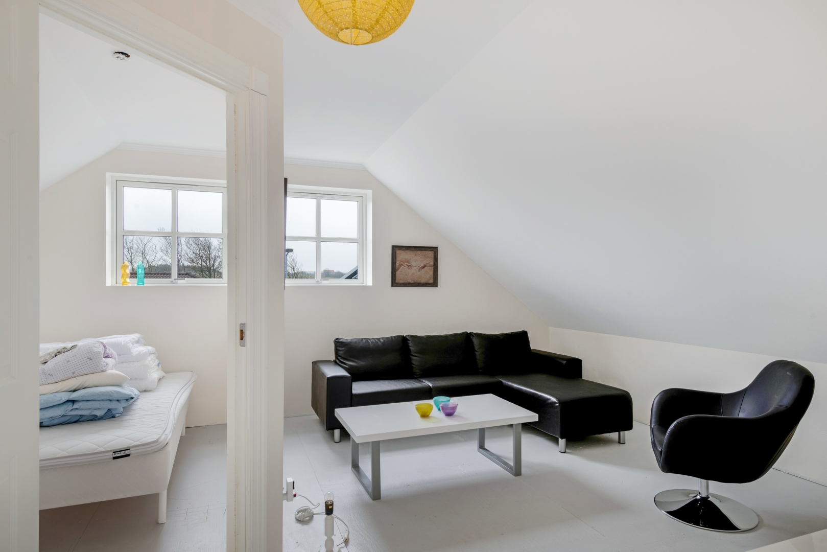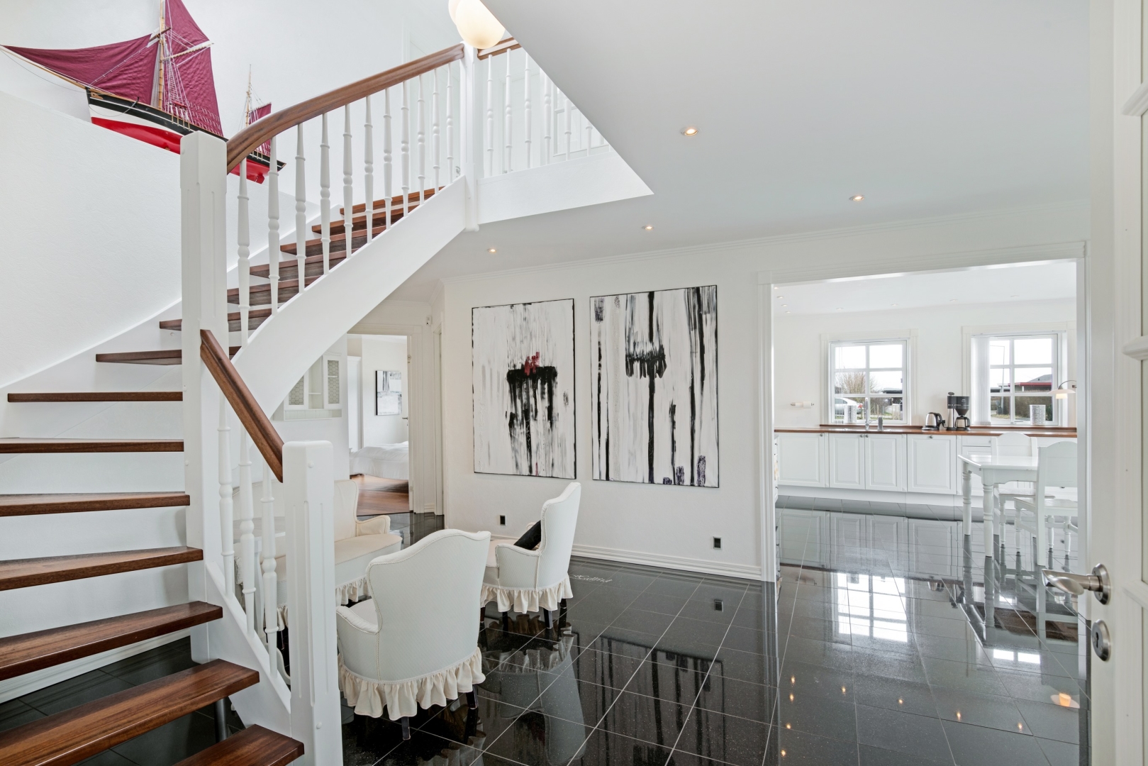 Villaen har 9 m² overdækning i forbindelse med indgang til boligen, som er indrettet med stor imødekommende hall med sorte klinker på gulv og flot hvidmalet trappe med maghonitrin til 1. sal, fra hall fransk dobbelt dør til stort lækkert stilrent og funktionelt køkken holdt i hvidt og med sorte klinker på gulv og med god spiseplads. Det store vinduesparti mod syd giver et fantastisk godt lysindfald til køkkenet. Særdeles dejlig opholdsstue med stort lysindfald fra alle solhjørner og med fransk dobbelt dør til hall, soveværelse, smagfuldt og stilrent badeværelse holdt i samme inventar som i køkken og med sorte klinker på gulv, stor bruseniche med glasdør, fritstående badekar på løvefødder, pænt gæstetoilet, værelse, bryggers. 1. sal med 2 værelser og det øvrige areal kan indrettes efter behov.