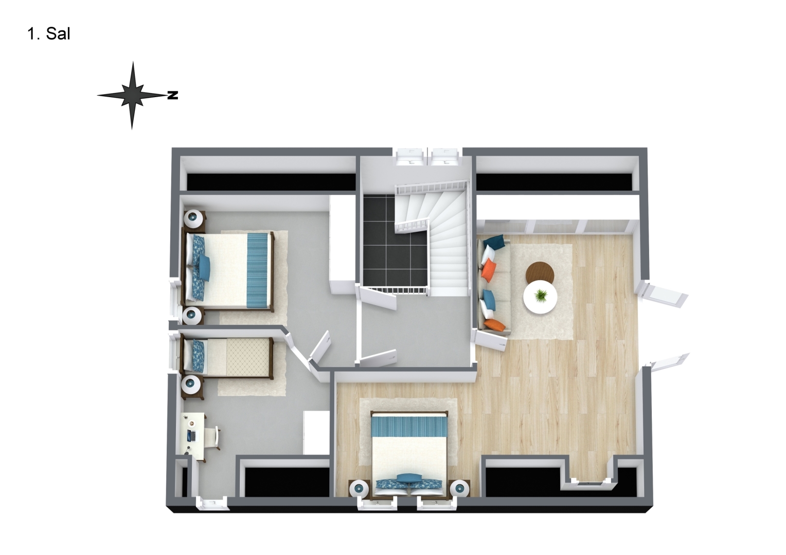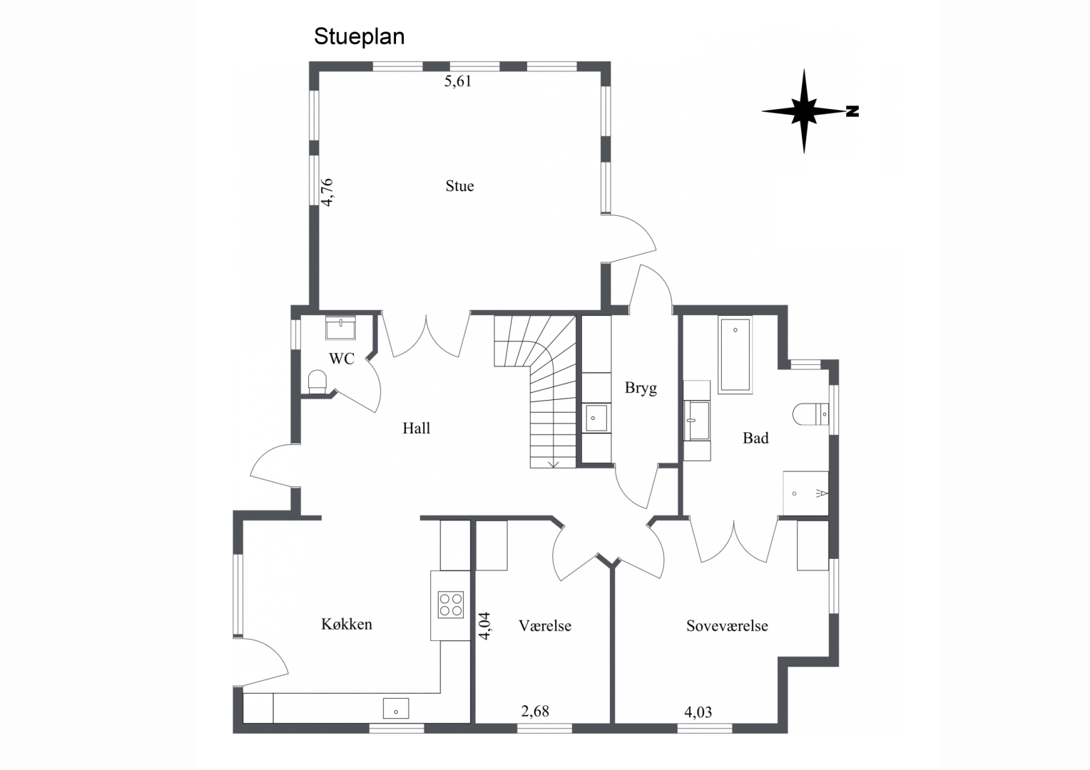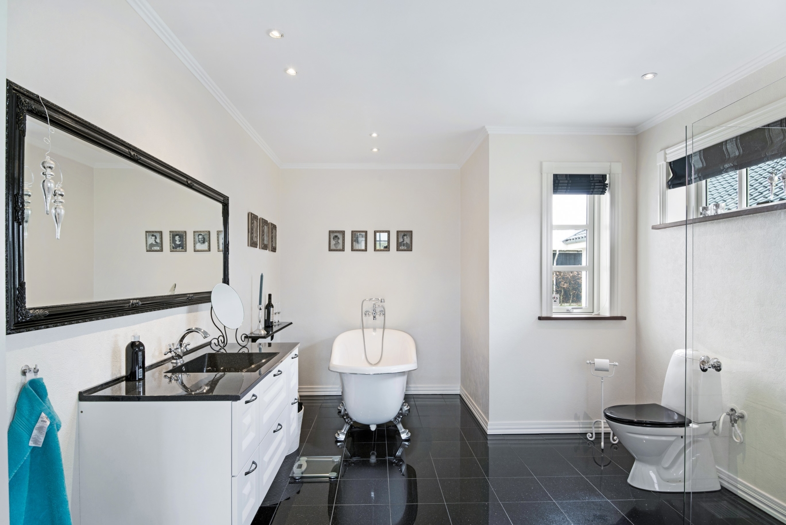 Villaen har 9 m² overdækning i forbindelse med indgang til boligen, som er indrettet med stor imødekommende hall med sorte klinker på gulv og flot hvidmalet trappe med maghonitrin til 1. sal, fra hall fransk dobbelt dør til stort lækkert stilrent og funktionelt køkken holdt i hvidt og med sorte klinker på gulv og med god spiseplads. Det store vinduesparti mod syd giver et fantastisk godt lysindfald til køkkenet. Særdeles dejlig opholdsstue med stort lysindfald fra alle solhjørner og med fransk dobbelt dør til hall, soveværelse, smagfuldt og stilrent badeværelse holdt i samme inventar som i køkken og med sorte klinker på gulv, stor bruseniche med glasdør, fritstående badekar på løvefødder, pænt gæstetoilet, værelse, bryggers. 1. sal med 2 værelser og det øvrige areal kan indrettes efter behov.