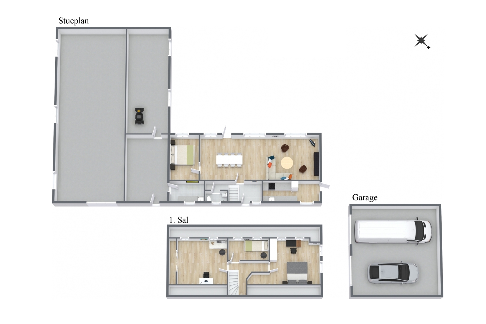 Boligen er i 2 plan, stueplan med bryggers, entre, køkken med spiseplads og udgang til have, spise- og opholdsstue, værelse, badeværelse. Trappeopgang fra entre til 1. sal med repos, 3 værelser og soveværelse.