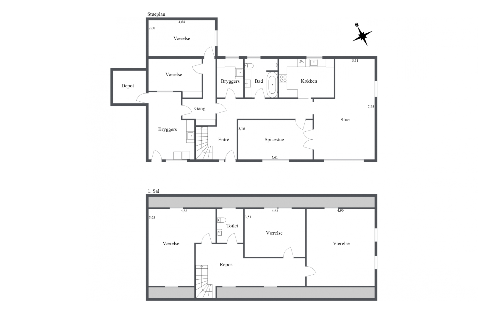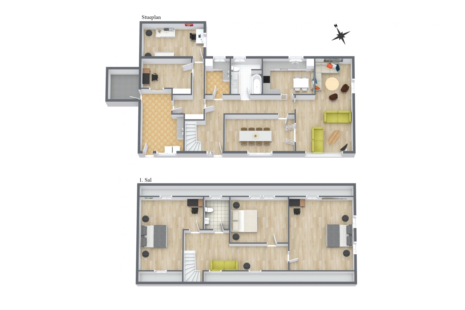 260 m² bolig i 2 plan. Stueplan med stort bryggers med adgang til nedsænket viktualierum, endnu et bryggers med oliefyr, fordelingsgang, lyst køkken med spiseplads, spisestue med fransk dobbeltdør til dejlig lys opholdsstue, badeværelse med kar og bruseniche, 2 værelser, entré med god trappeopgang til 1. sal med stor anvendelig repos, 3 pæne værelser samt toilet. Stuehuset har gennemgået en større renovering/modernisering i 2001, bl.a. 1. salen hvor hele tagkontruktionen er fornyet.