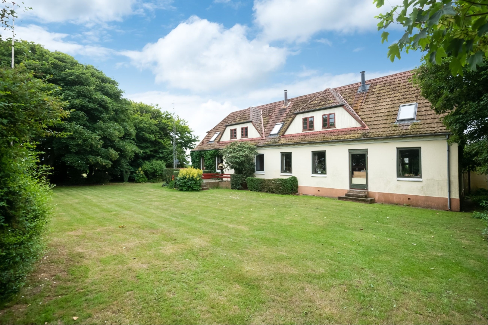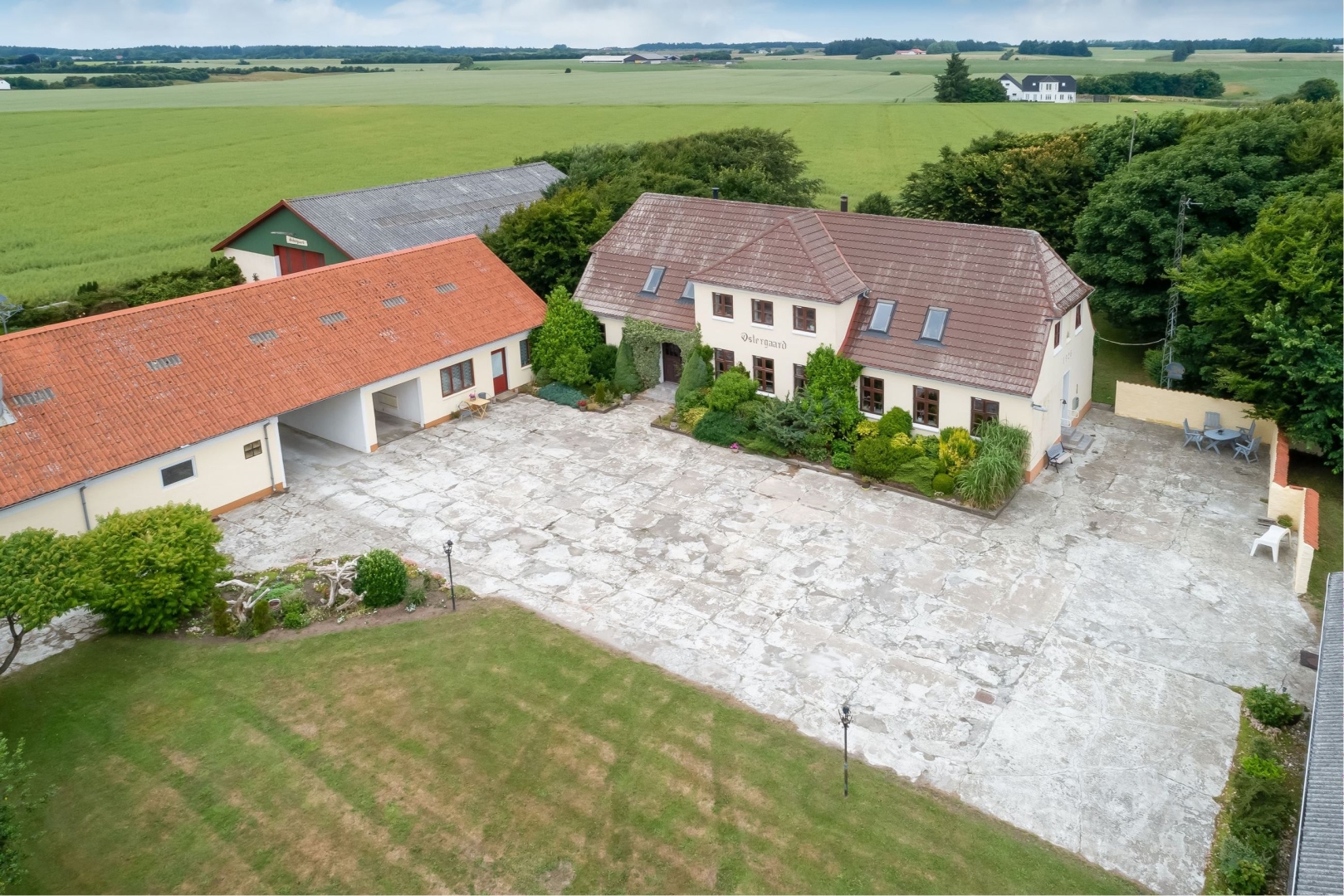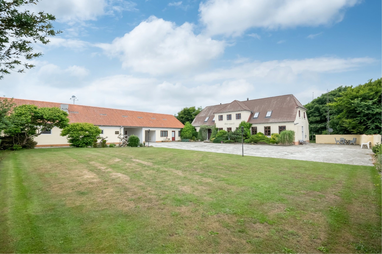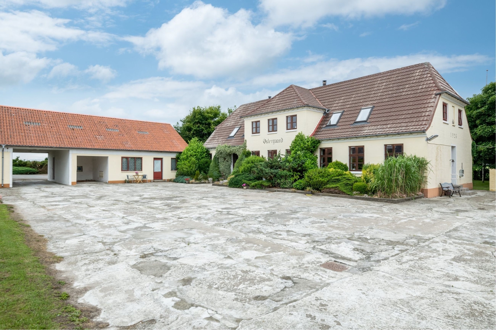 Fra den private vej kommer man ind på gårdspladsen gennem en større vognport og møder her det præsentable fritliggende velholdte stuehus på hele 311 m², som er indrettet med hall med trappeopgang til 1. sal, køkken med god spiseplads og fransk dobbelt dør til spise- og opholdsstue med brændeovn, stor opholdsstue, badeværelse med kar og bruseniche, værelse og bryggers med pænt skabsarrangement. 1. sal med større repos, soveværelse, 4 værelser og badeværelse med brusekabine.