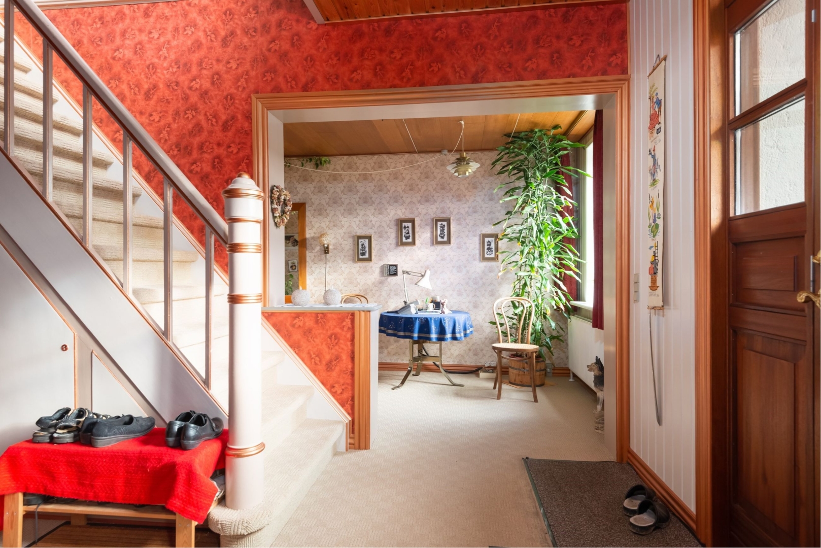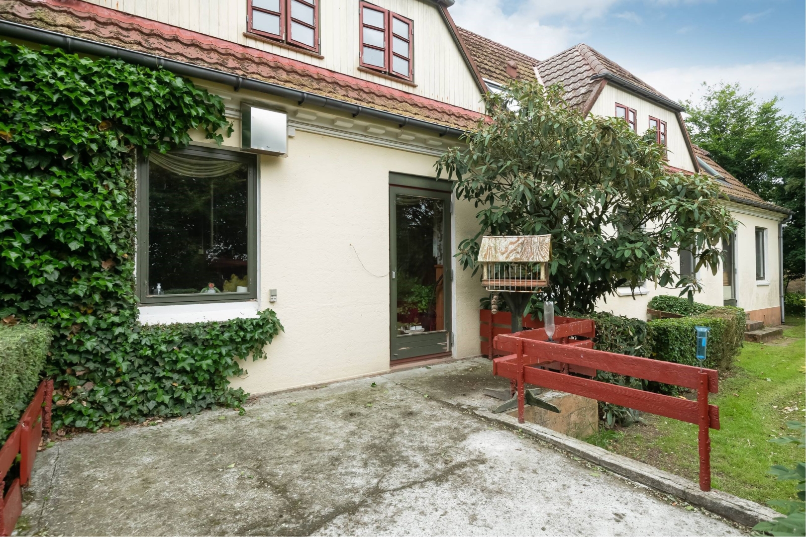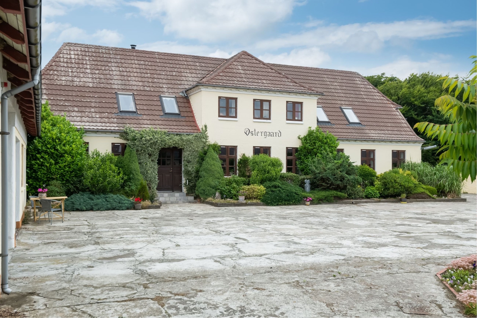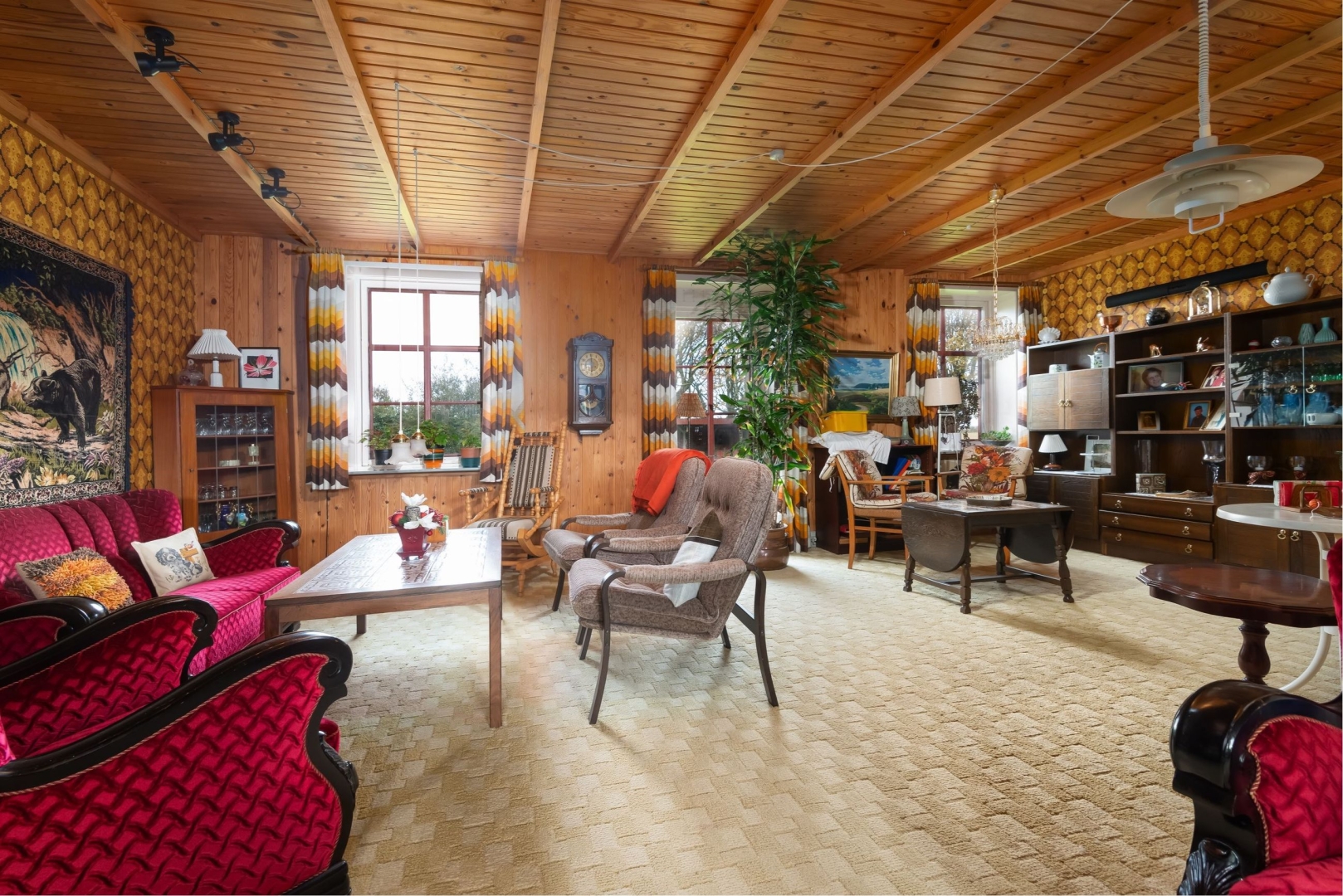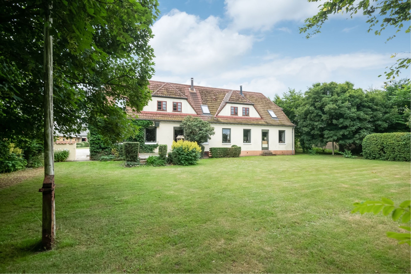 Fra den private vej kommer man ind på gårdspladsen gennem en større vognport og møder her det præsentable fritliggende velholdte stuehus på hele 311 m², som er indrettet med hall med trappeopgang til 1. sal, køkken med god spiseplads og fransk dobbelt dør til spise- og opholdsstue med brændeovn, stor opholdsstue, badeværelse med kar og bruseniche, værelse og bryggers med pænt skabsarrangement. 1. sal med større repos, soveværelse, 4 værelser og badeværelse med brusekabine.