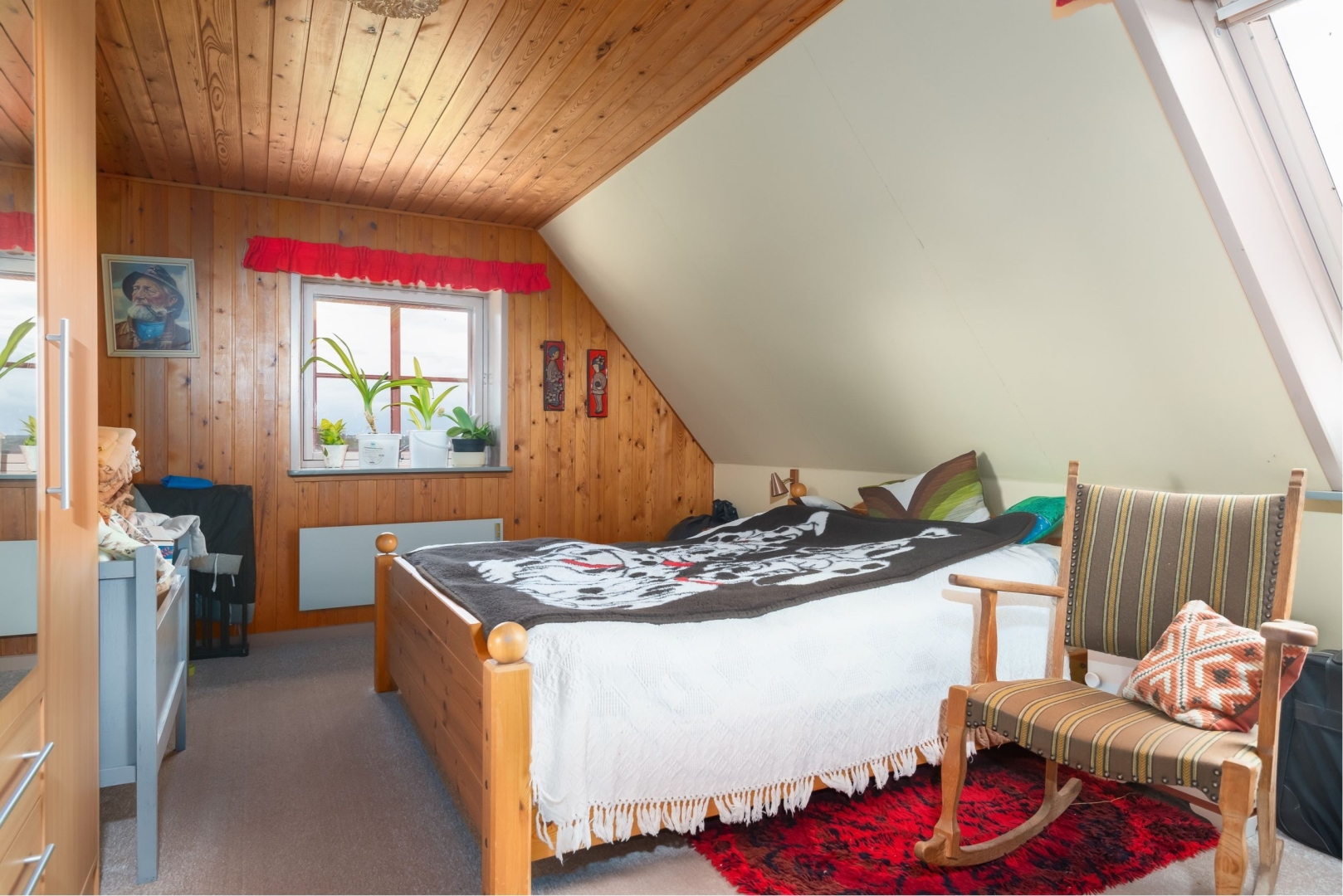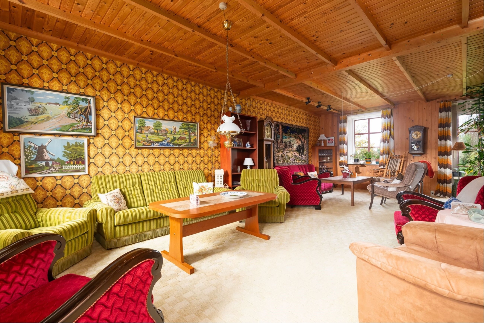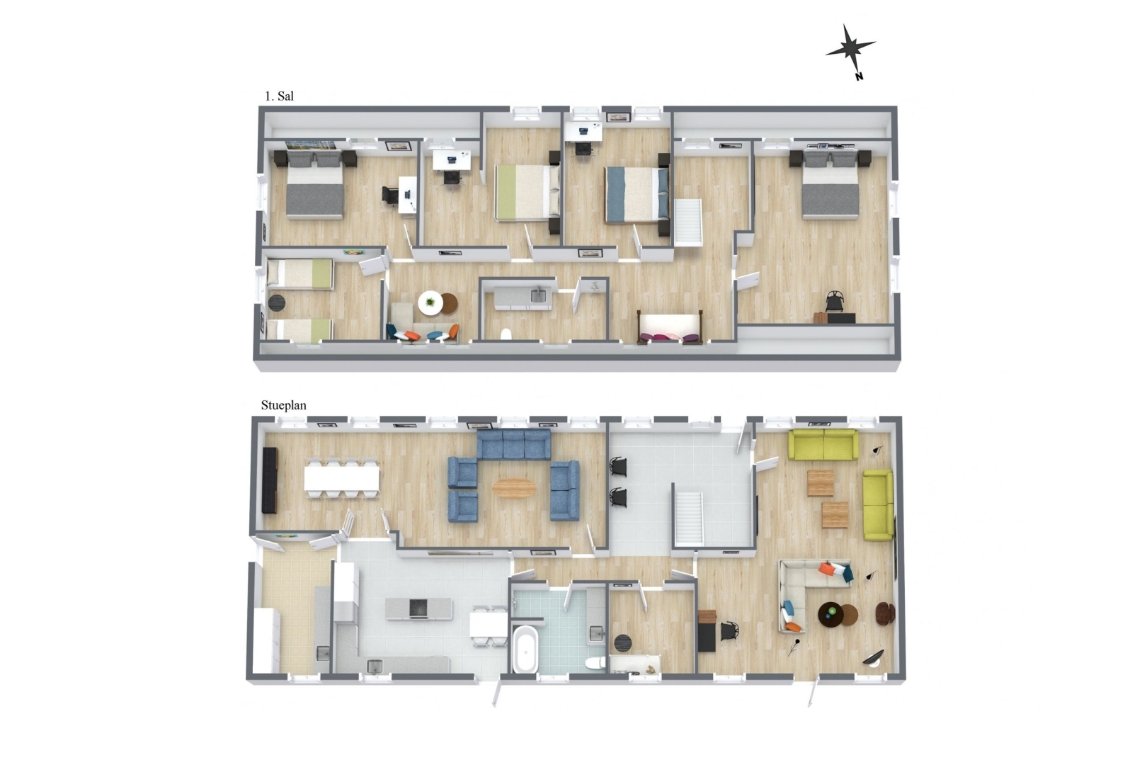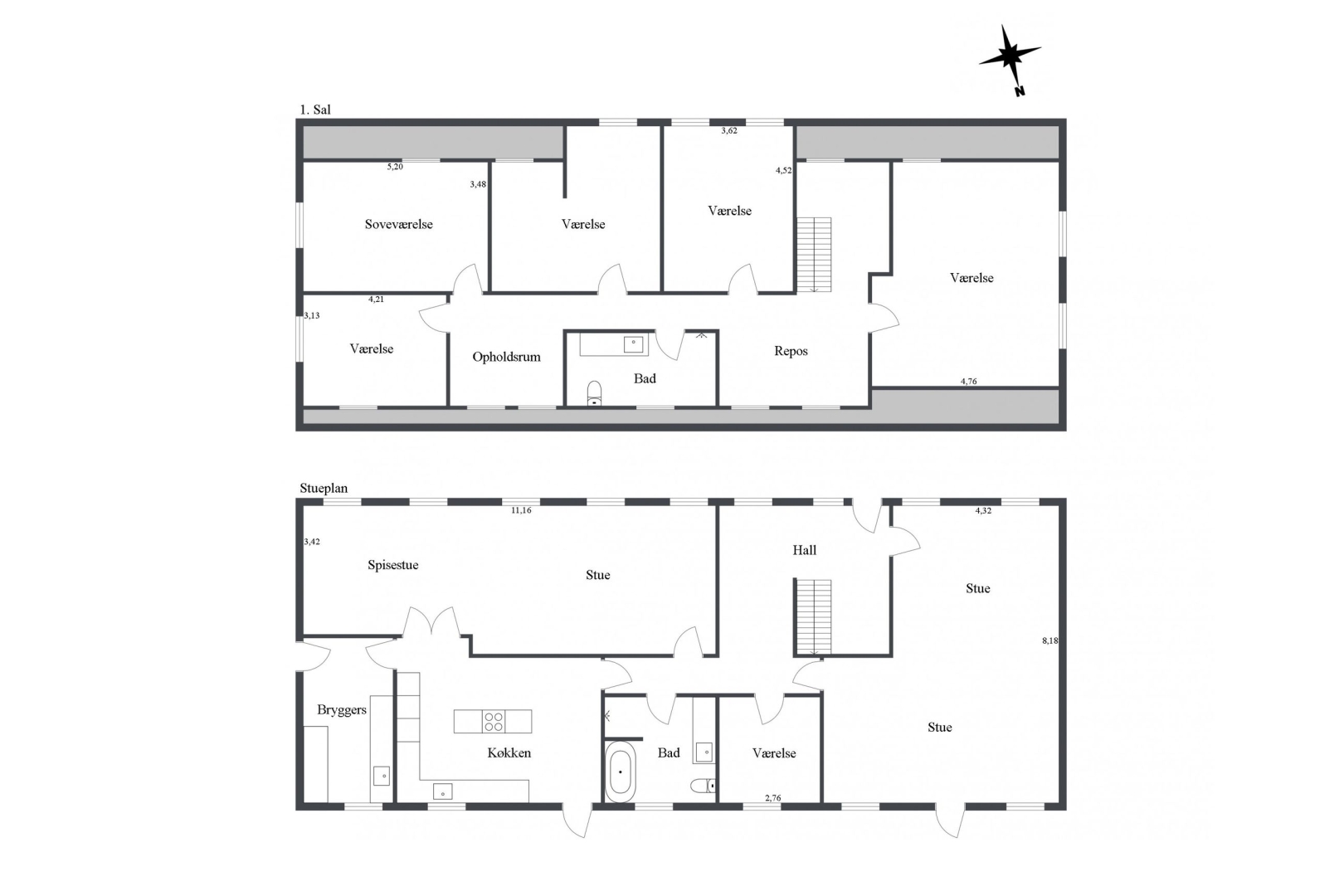 Fra den private vej kommer man ind på gårdspladsen gennem en større vognport og møder her det præsentable fritliggende velholdte stuehus på hele 311 m², som er indrettet med hall med trappeopgang til 1. sal, køkken med god spiseplads og fransk dobbelt dør til spise- og opholdsstue med brændeovn, stor opholdsstue, badeværelse med kar og bruseniche, værelse og bryggers med pænt skabsarrangement. 1. sal med større repos, soveværelse, 4 værelser og badeværelse med brusekabine.