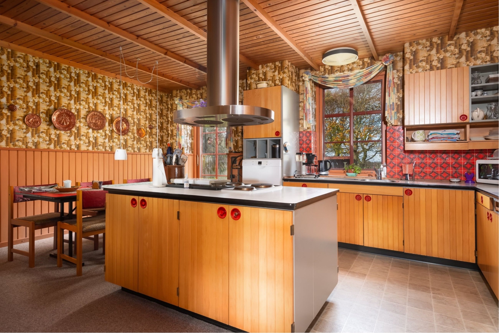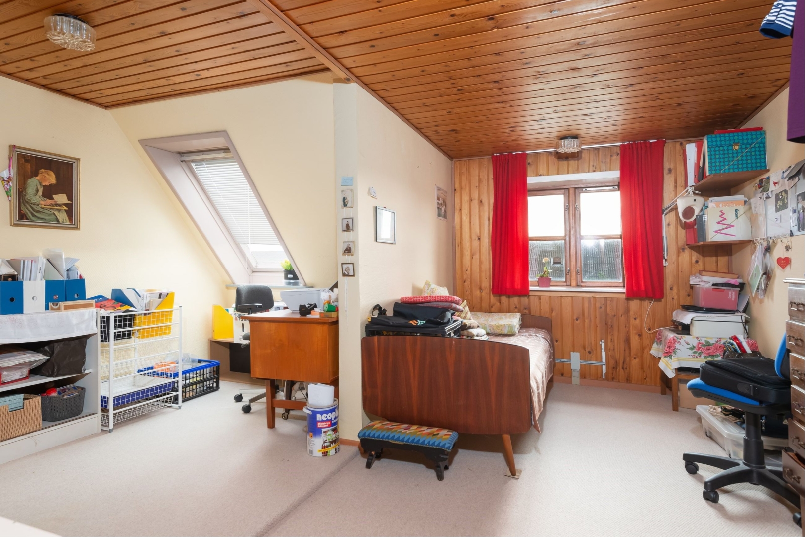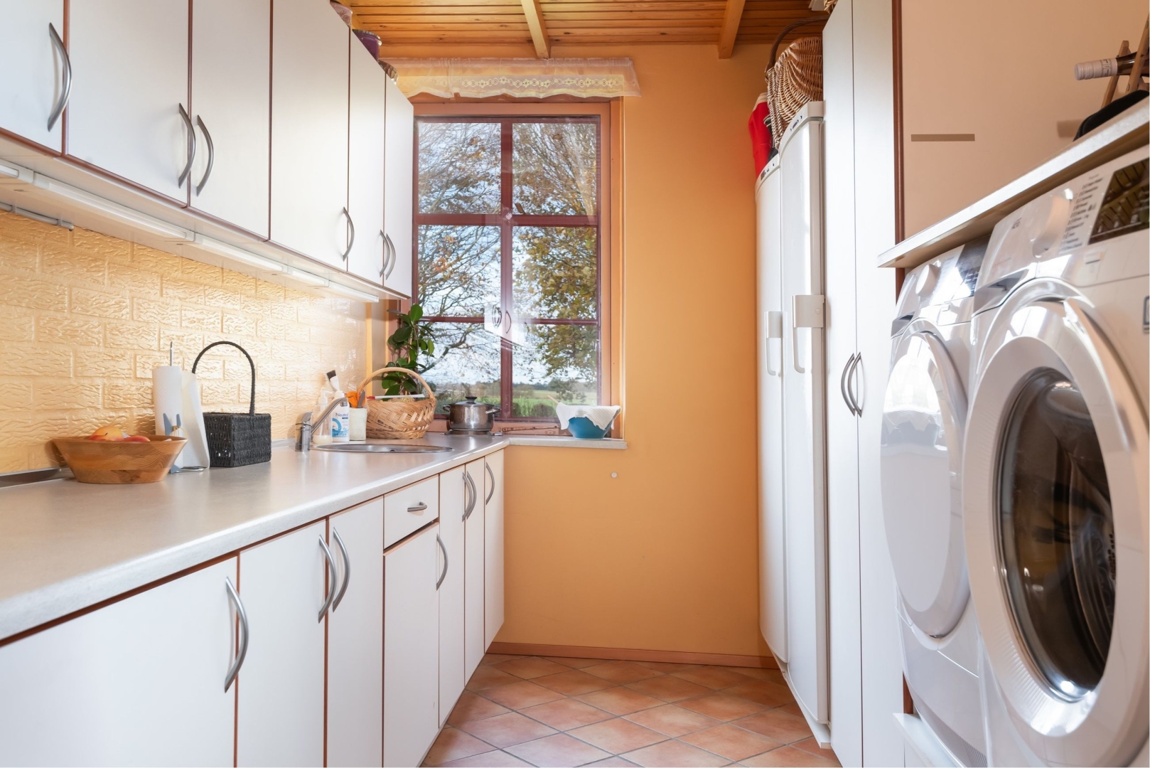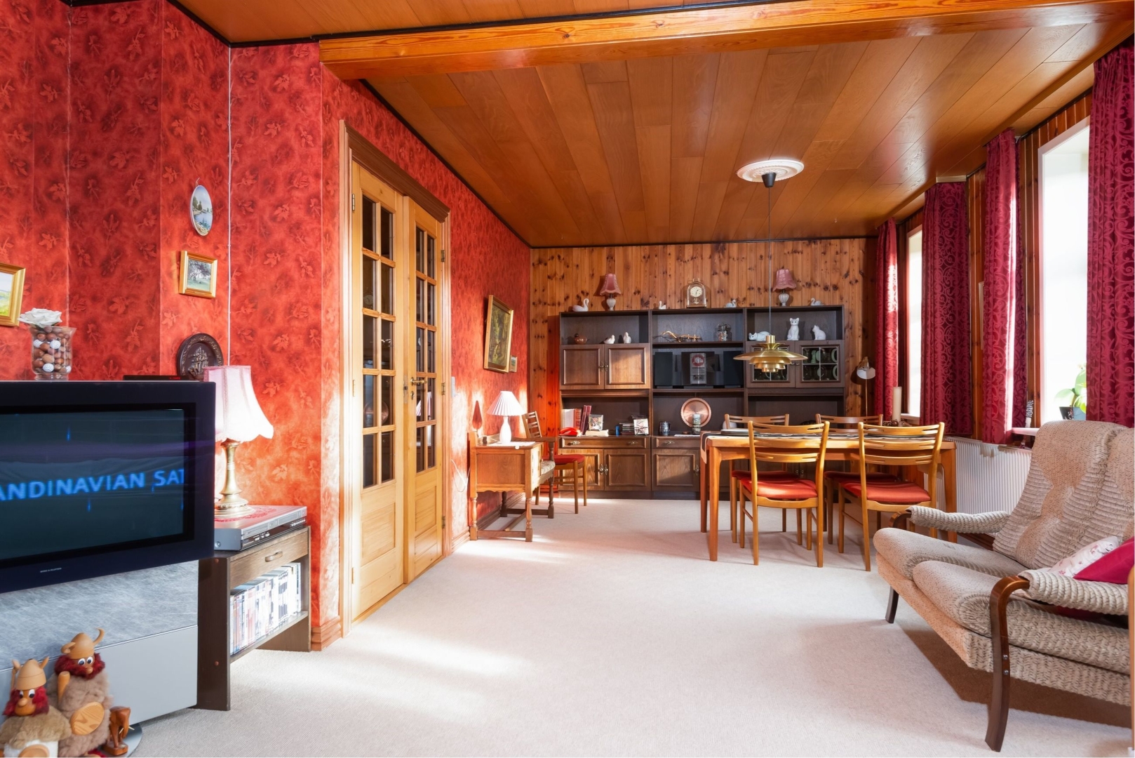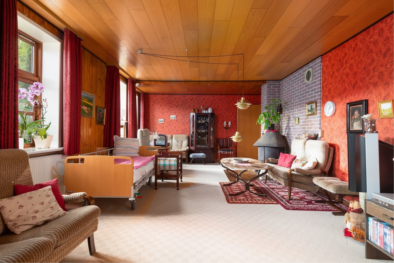 Fra den private vej kommer man ind på gårdspladsen gennem en større vognport og møder her det præsentable fritliggende velholdte stuehus på hele 311 m², som er indrettet med hall med trappeopgang til 1. sal, køkken med god spiseplads og fransk dobbelt dør til spise- og opholdsstue med brændeovn, stor opholdsstue, badeværelse med kar og bruseniche, værelse og bryggers med pænt skabsarrangement. 1. sal med større repos, soveværelse, 4 værelser og badeværelse med brusekabine.