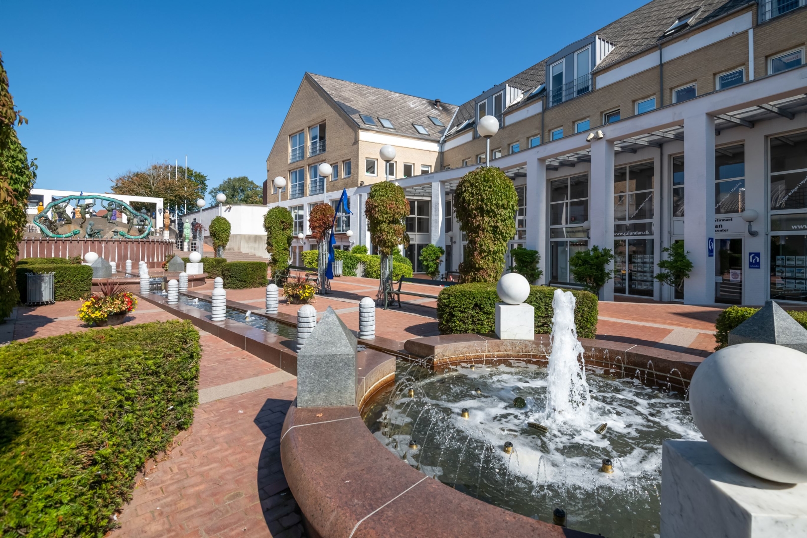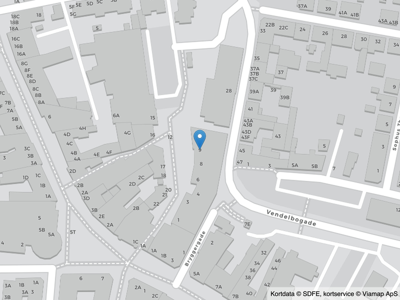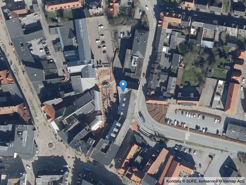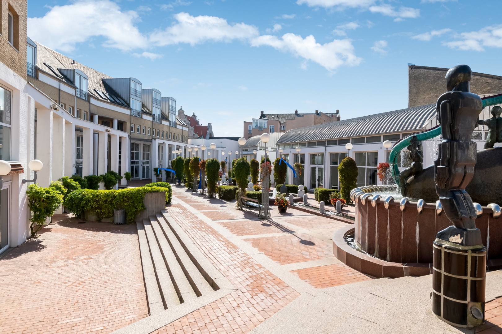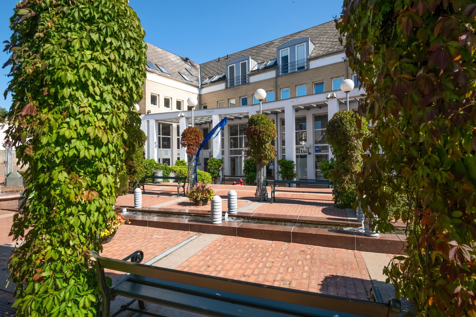 Er beliggende på den smukke P. Nørkjærs Plads, med international attraktion af kunstværk og vandløb gennem pladsen.