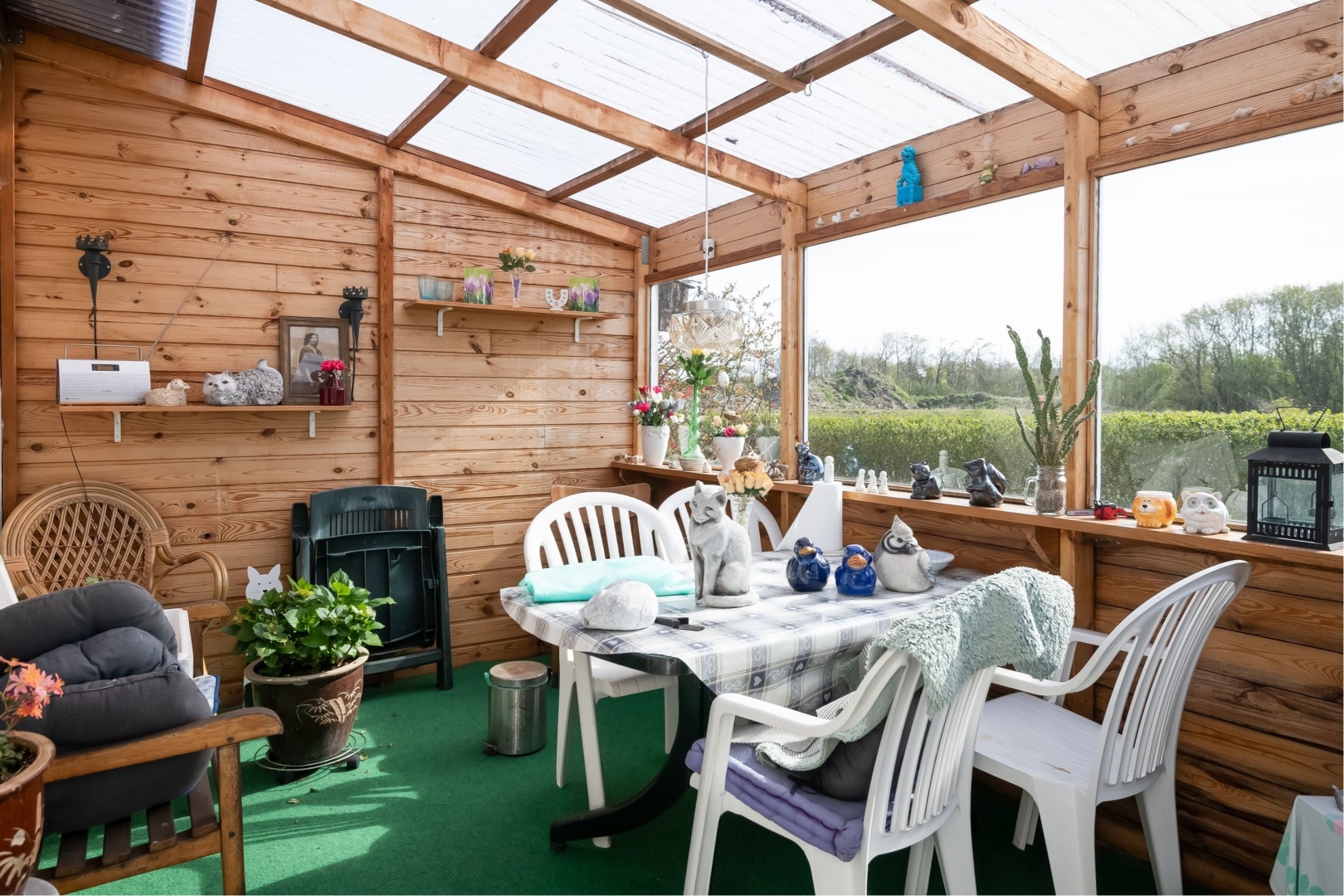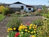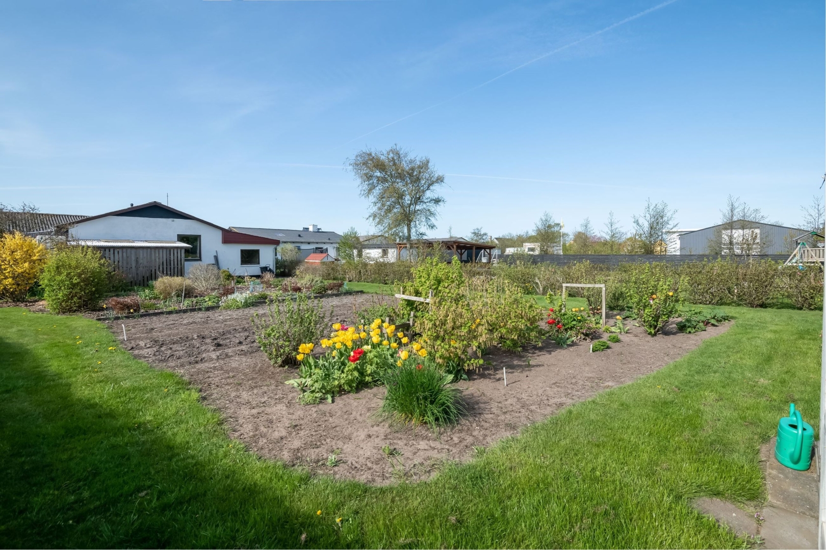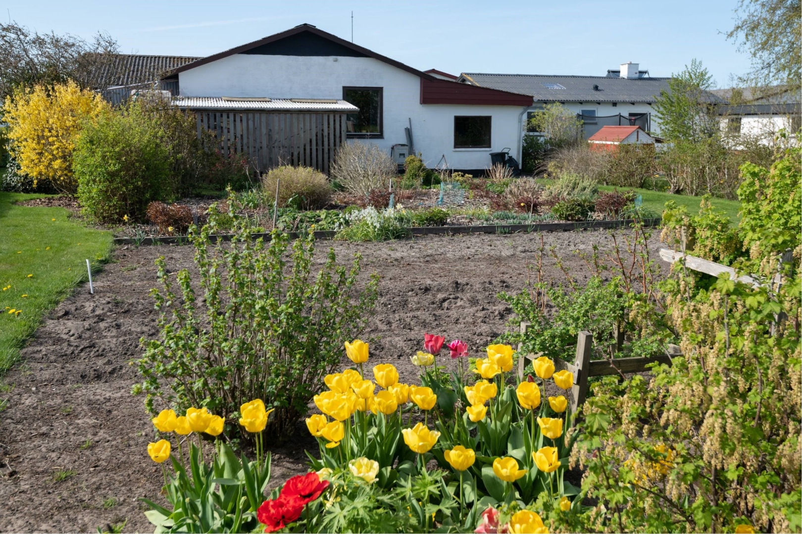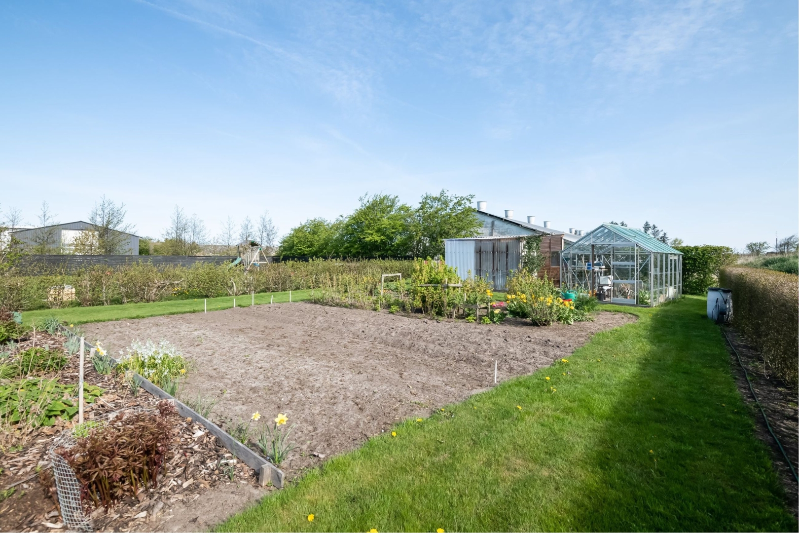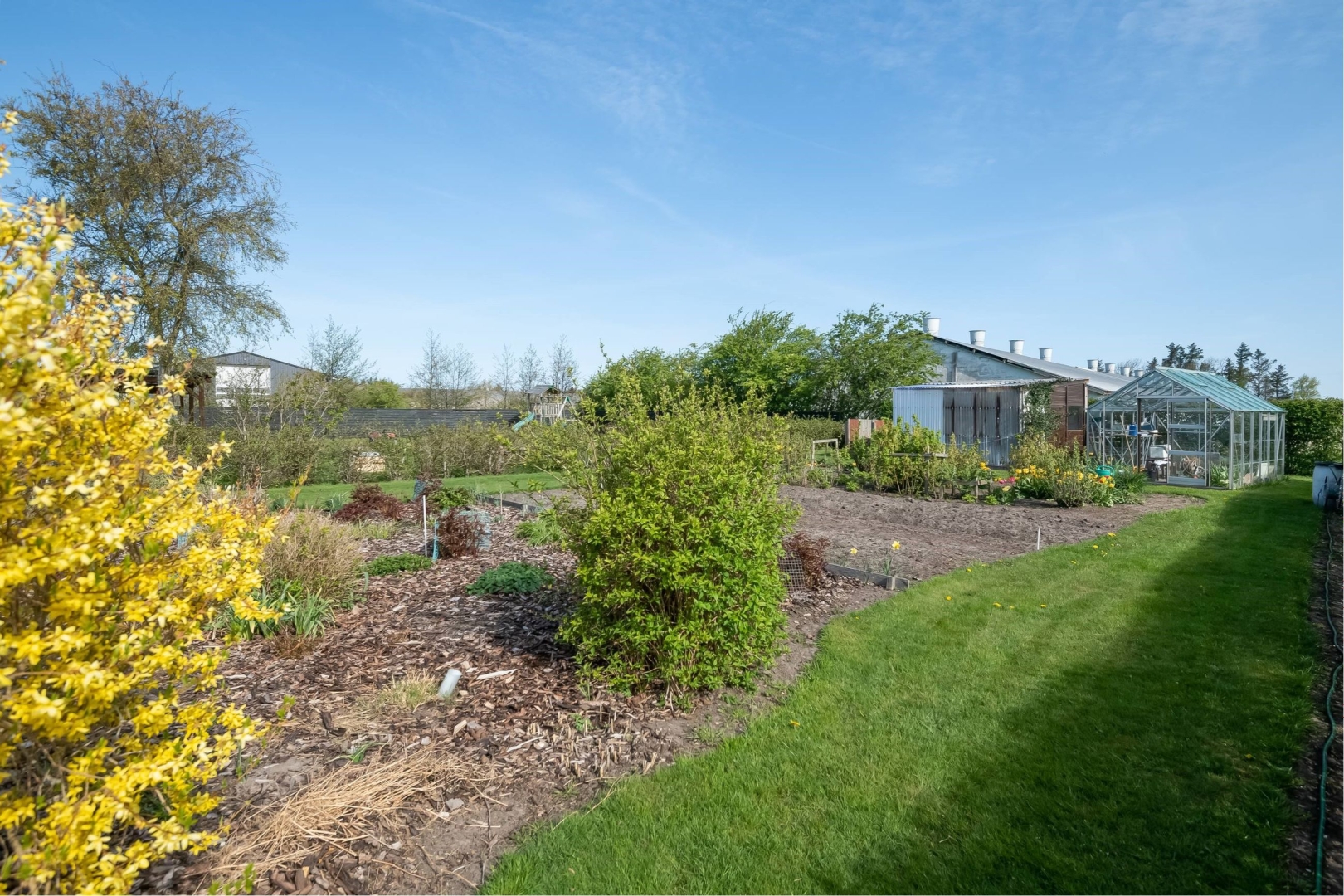 Stor velplejet have med drivhus og mindre havehus. En del af haven er anlagt som nyttehave.