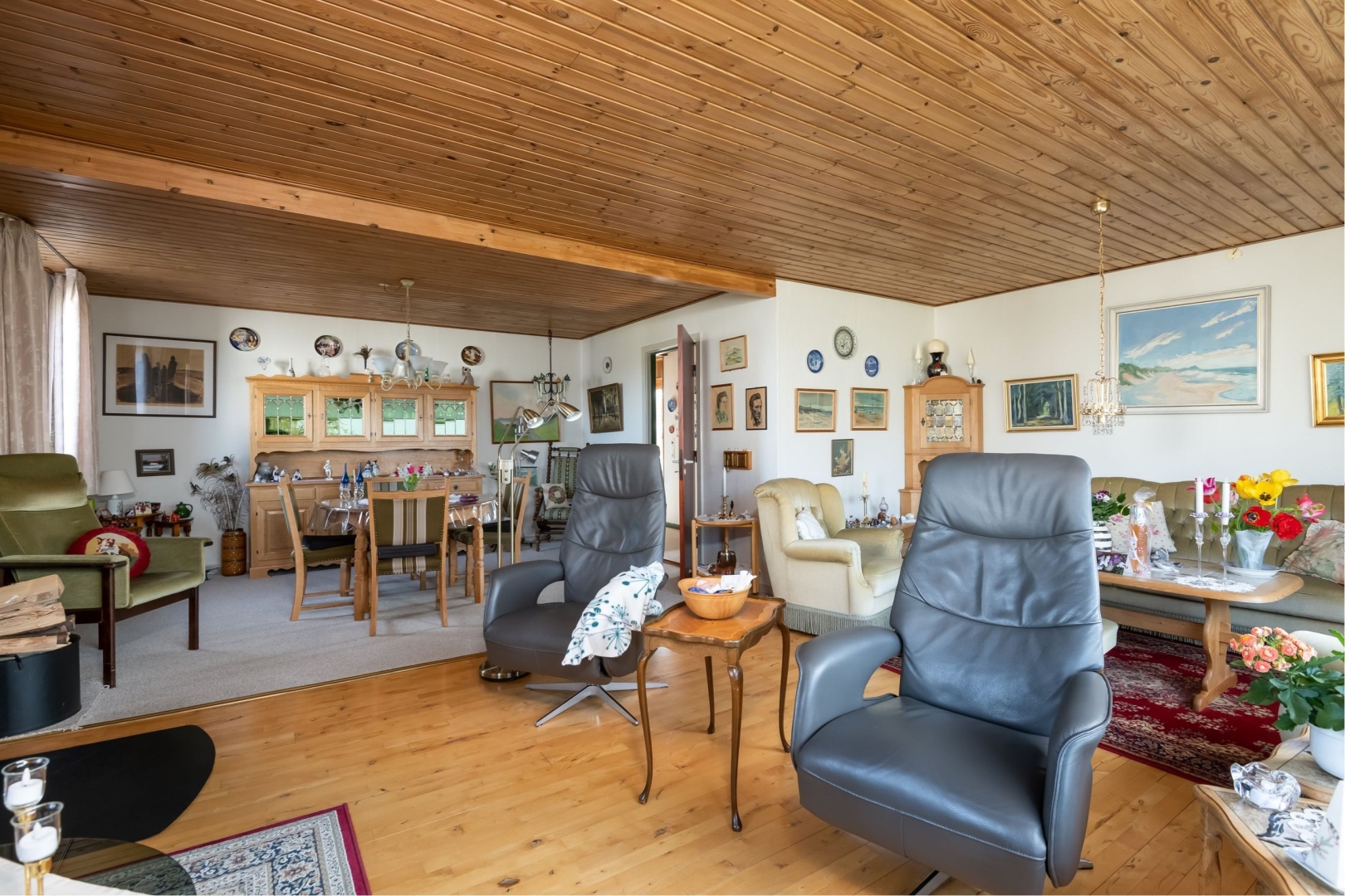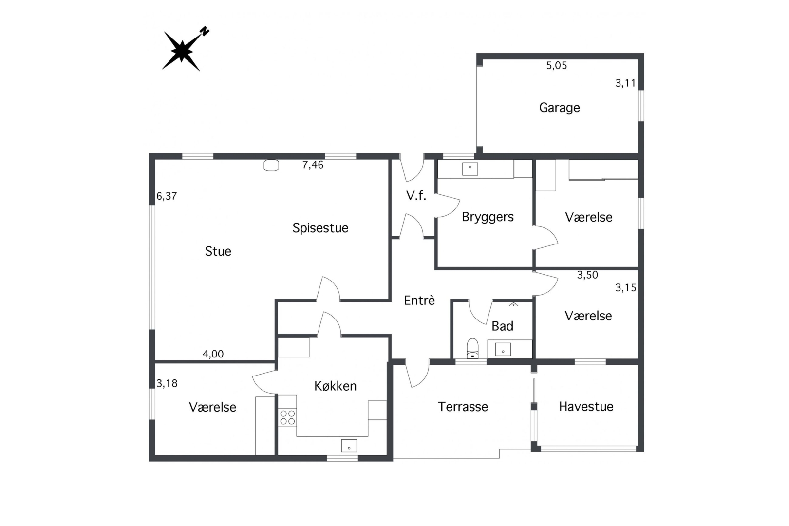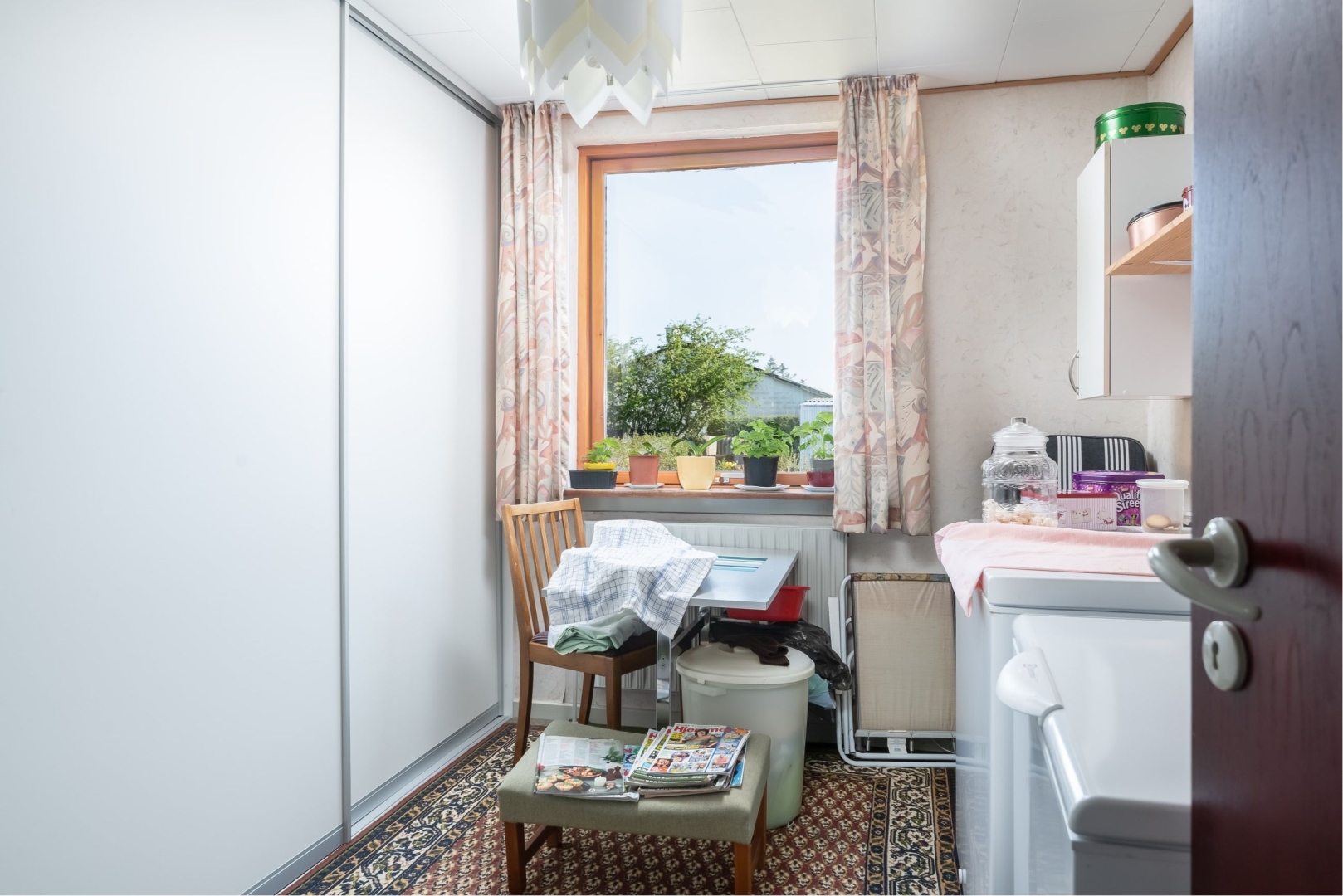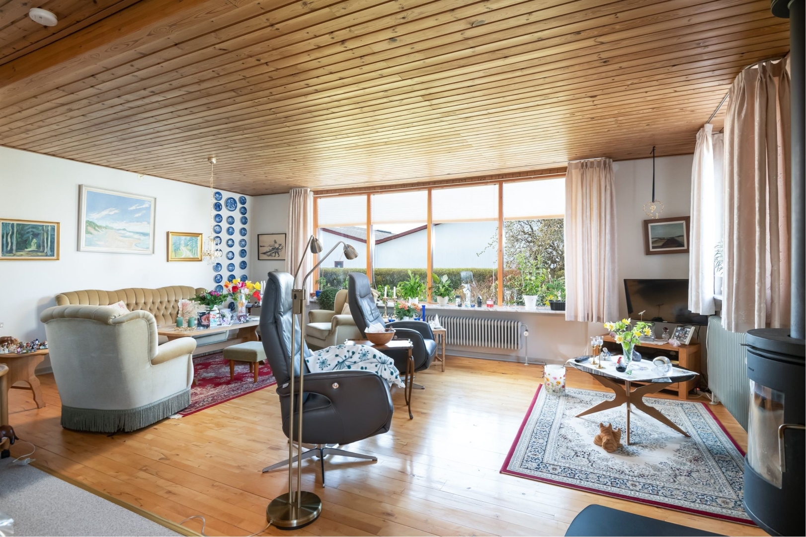 Boligen er indrettet med vindfang med indgang til stort bryggers med bordarrangement, entré, pænt køkken med spiseplads, stor lys vinkelstue med nyere brændeovn, soveværelse, 2 værelser, badeværelse med bruseniche. Fra entré udgang til terrasse, derfra indgang til skøn havestue.
